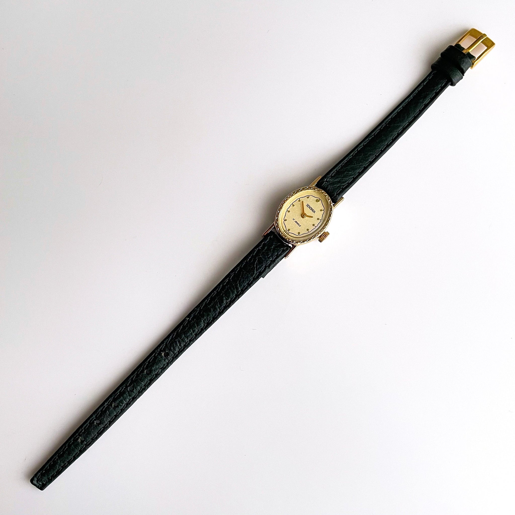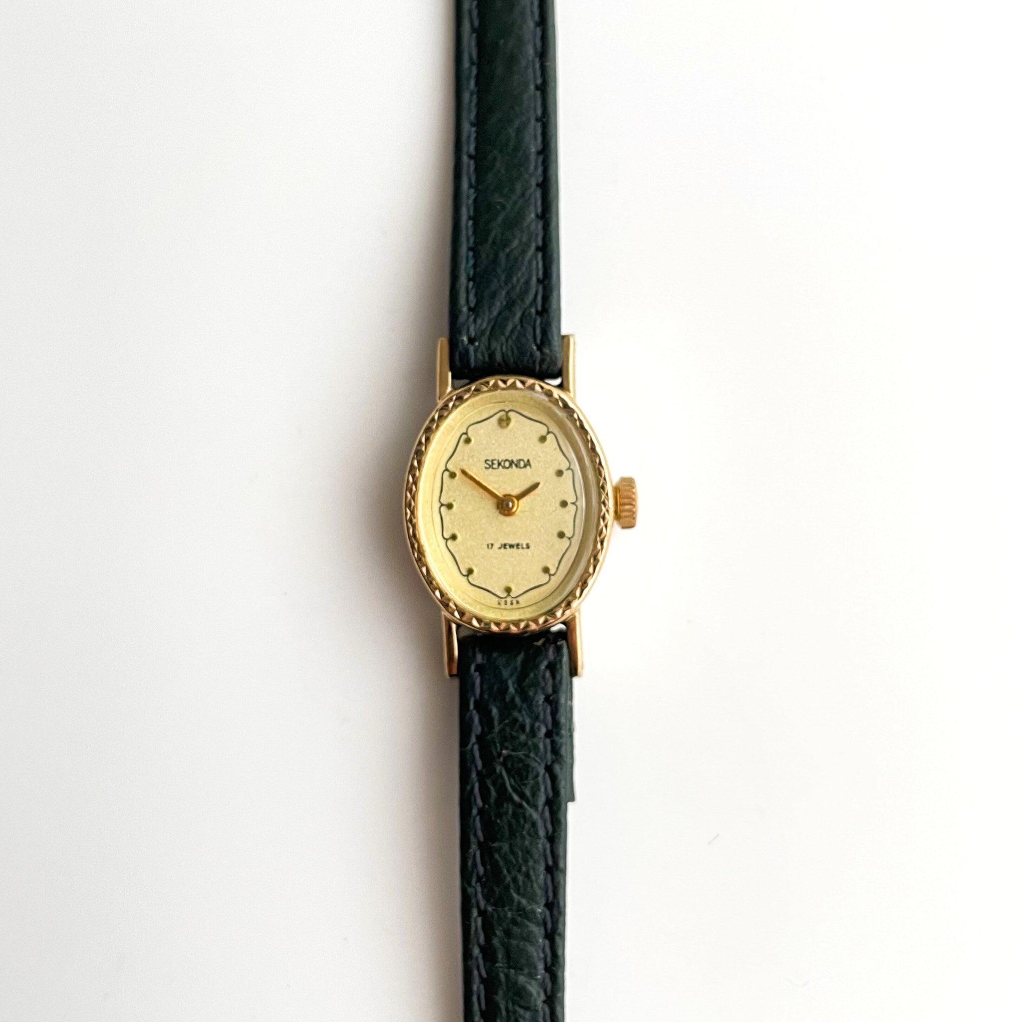 Tiny vintage ladies' Sekonda watch with oval dial and black leather strap. Probably made in the very late 60s. A very dainty and feminine piece.