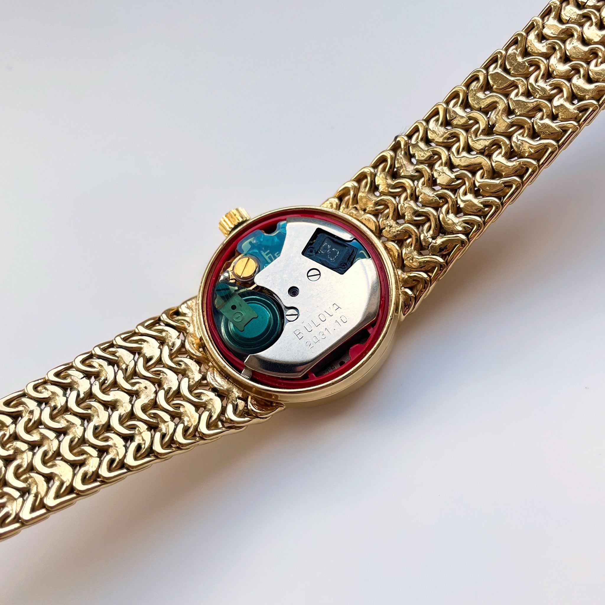 Rare and gorgeous ladies’ 1978 Bulova Accutron watch, with round gold dial and gold-plated stainless steel mesh strap. A timeless and elegant piece from the cult American watchmaker.