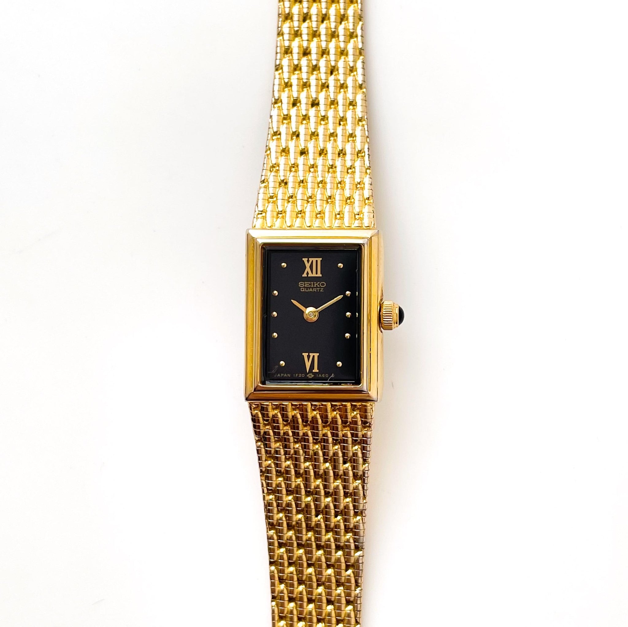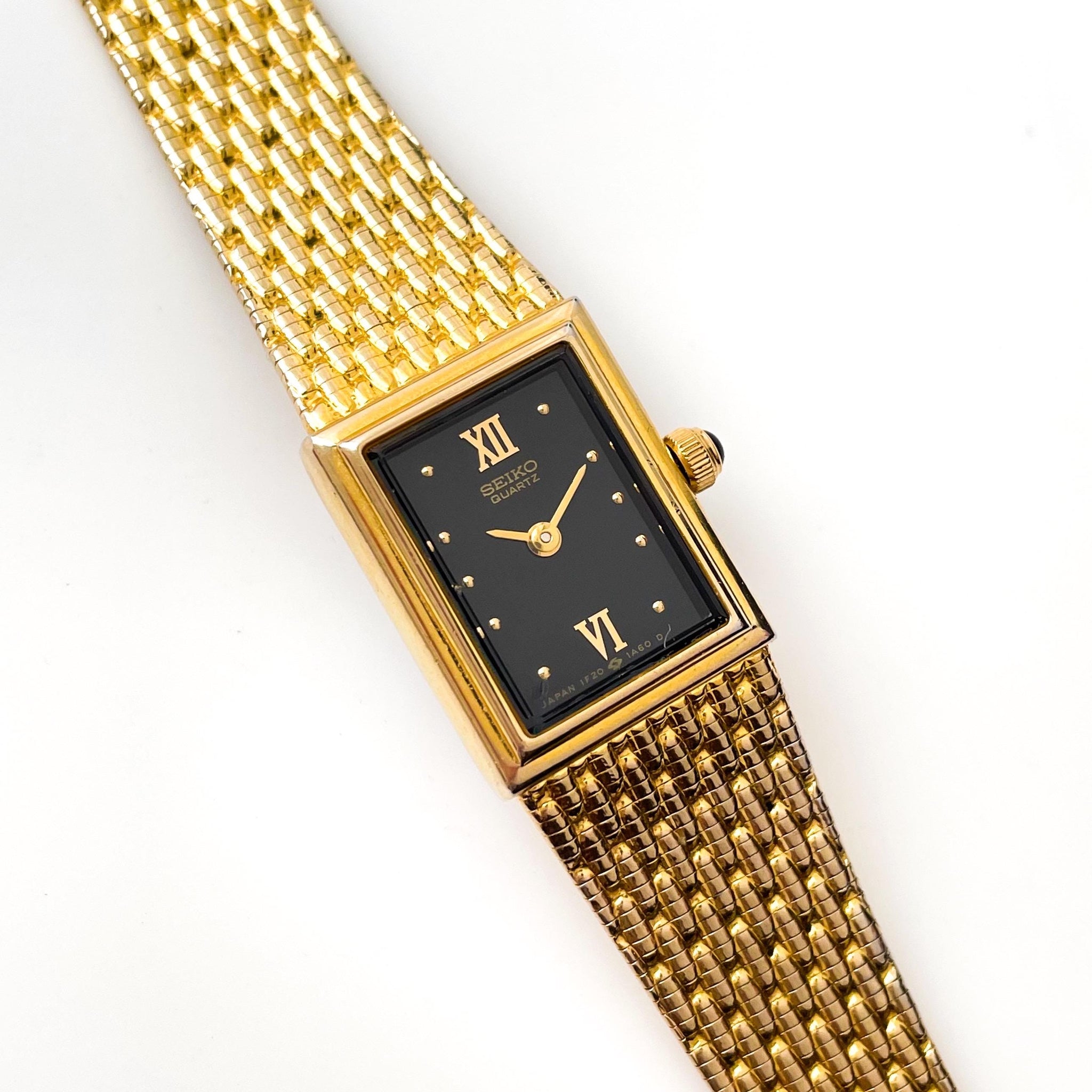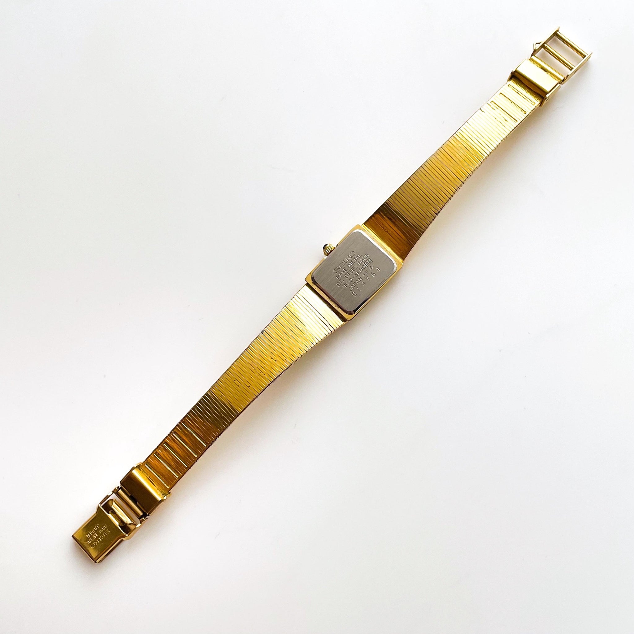 Dainty gold-tone 1990s Seiko watch, with thin rectangular dial and integrated bracelet. A very dainty and feminine vintage model from the cult Japanese watchmaker.