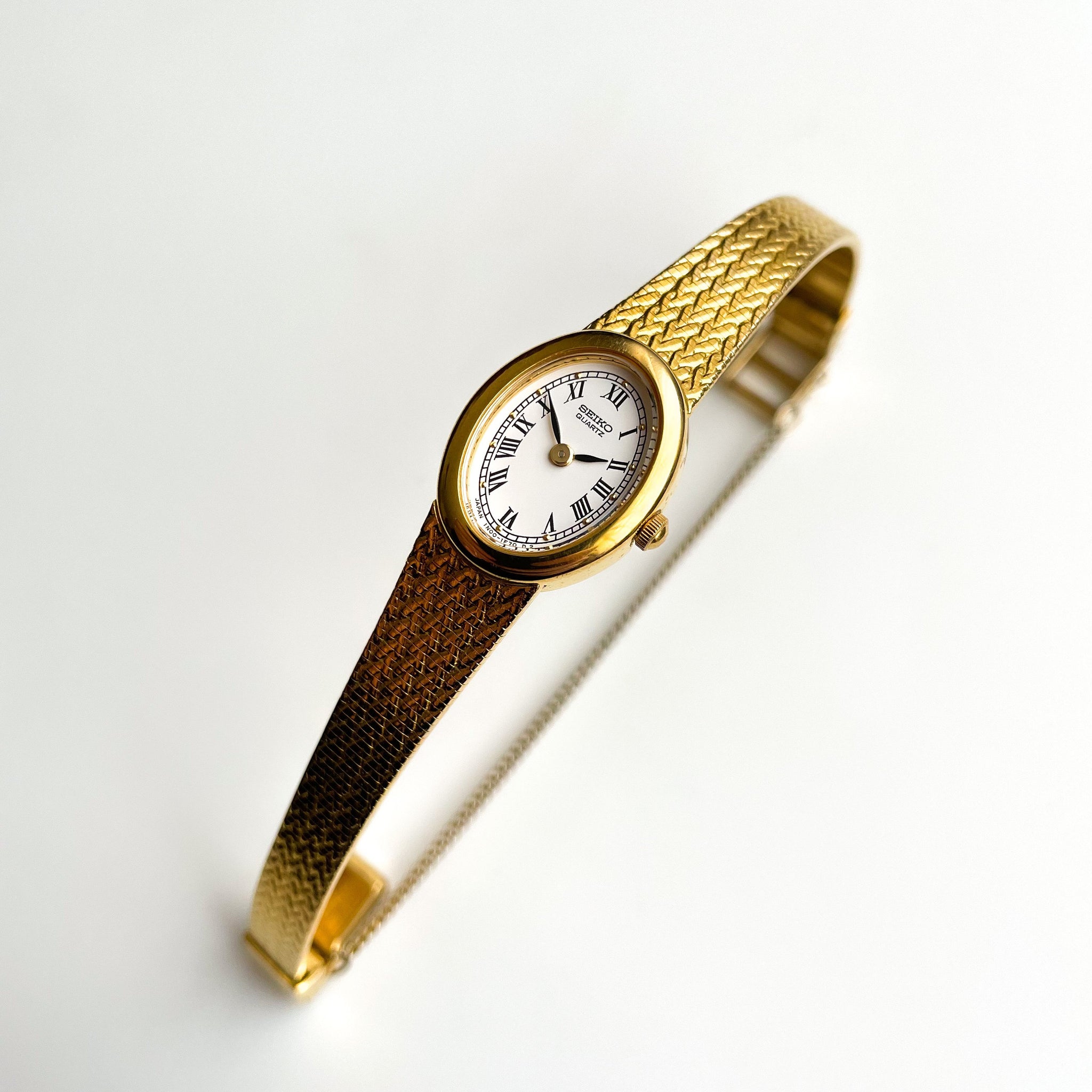 Dainty gold-tone 90s Seiko watch, with oval dial, integrated bracelet and small safety chain. A very thin and feminine vintage model from the cult Japanese watchmaker.