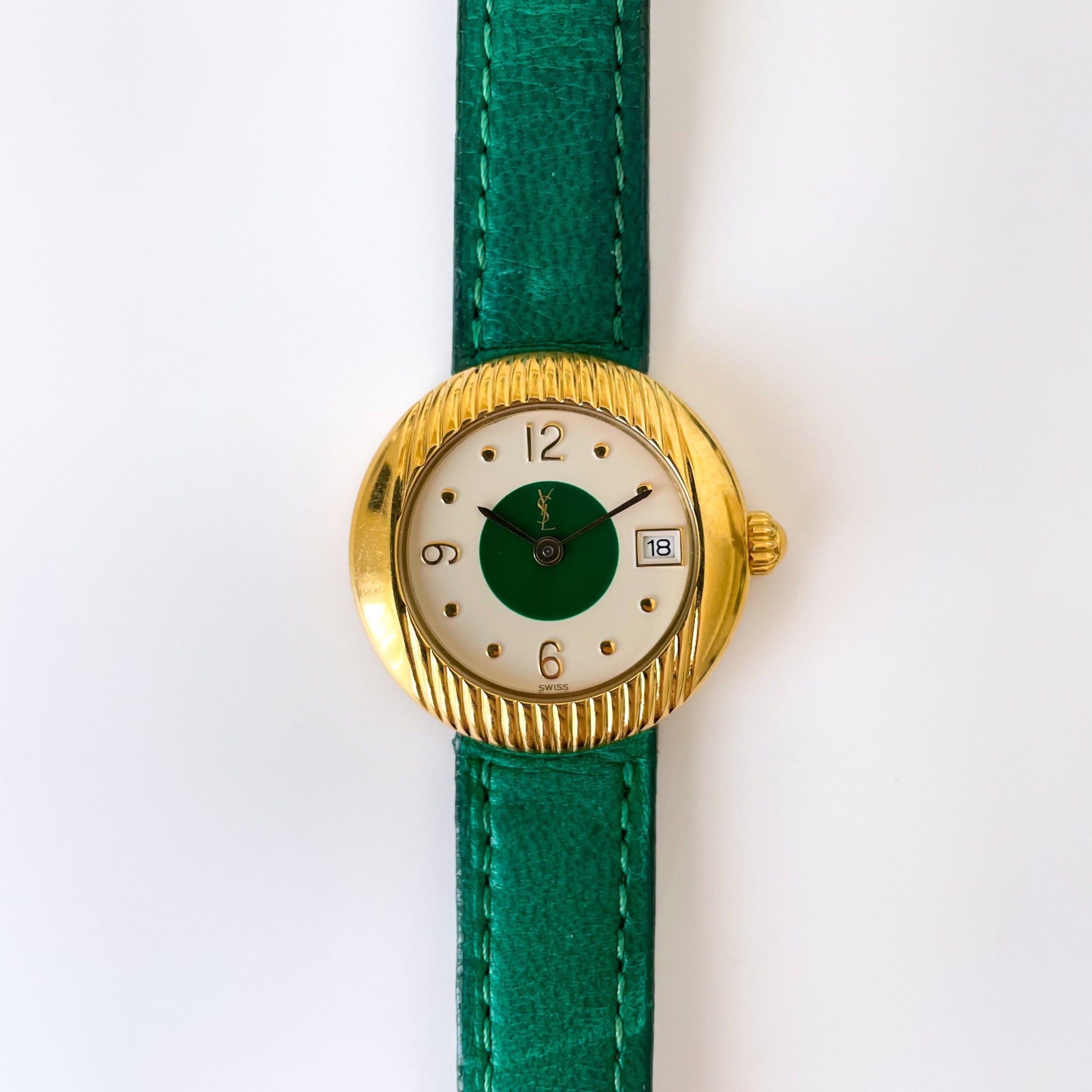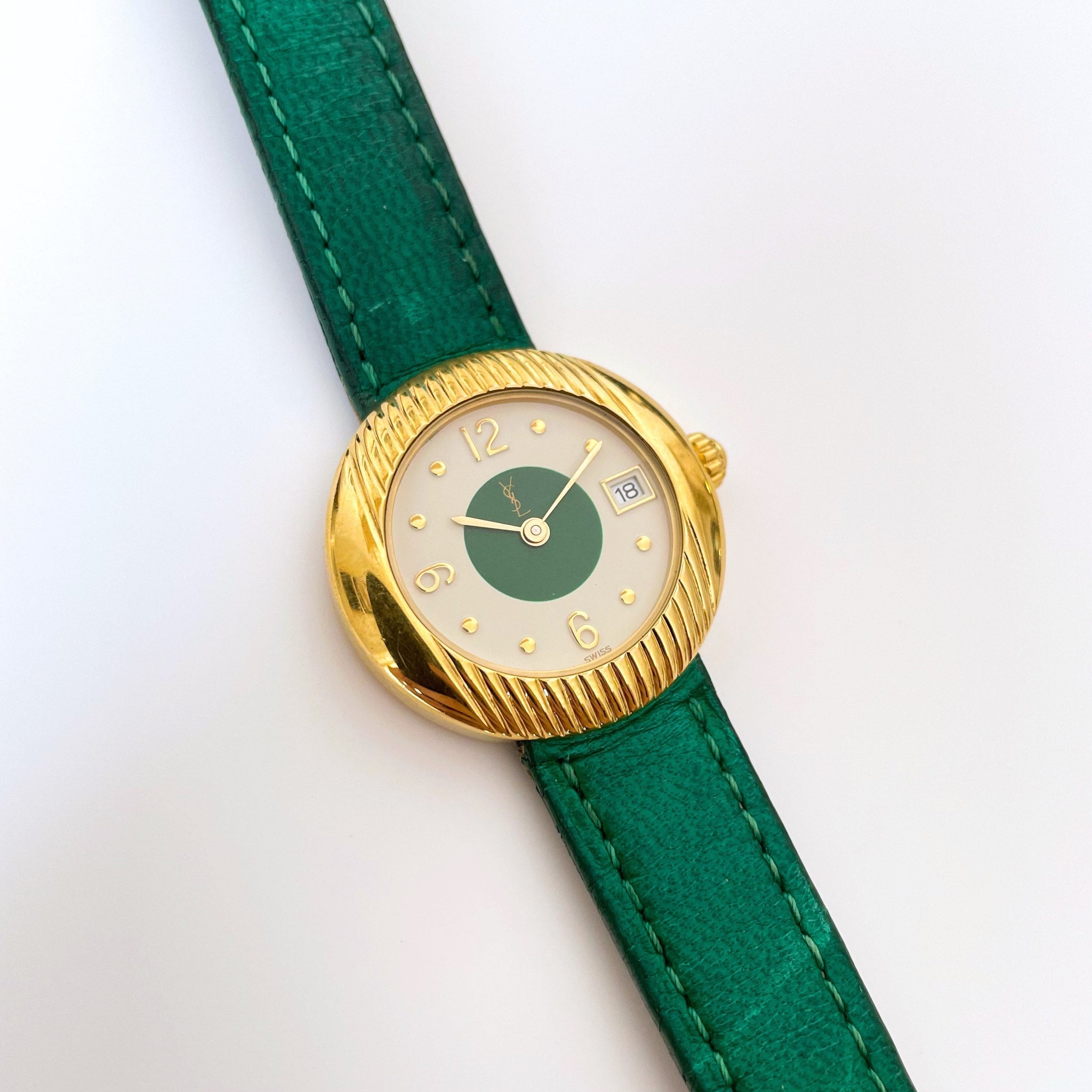 Rare Yves Saint Laurent vintage watch with ornate gold-plated case, white and green dial and matching green leather strap. It also has a date window.