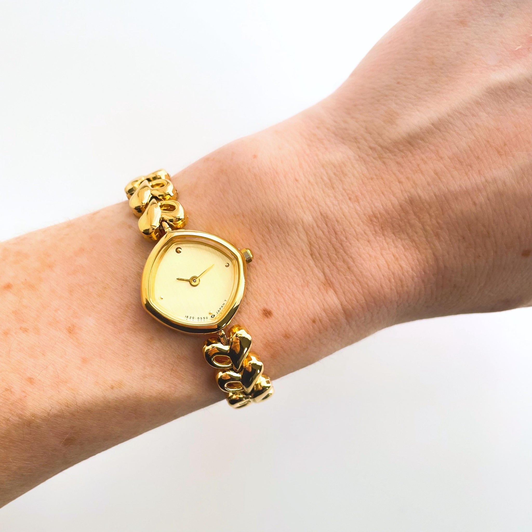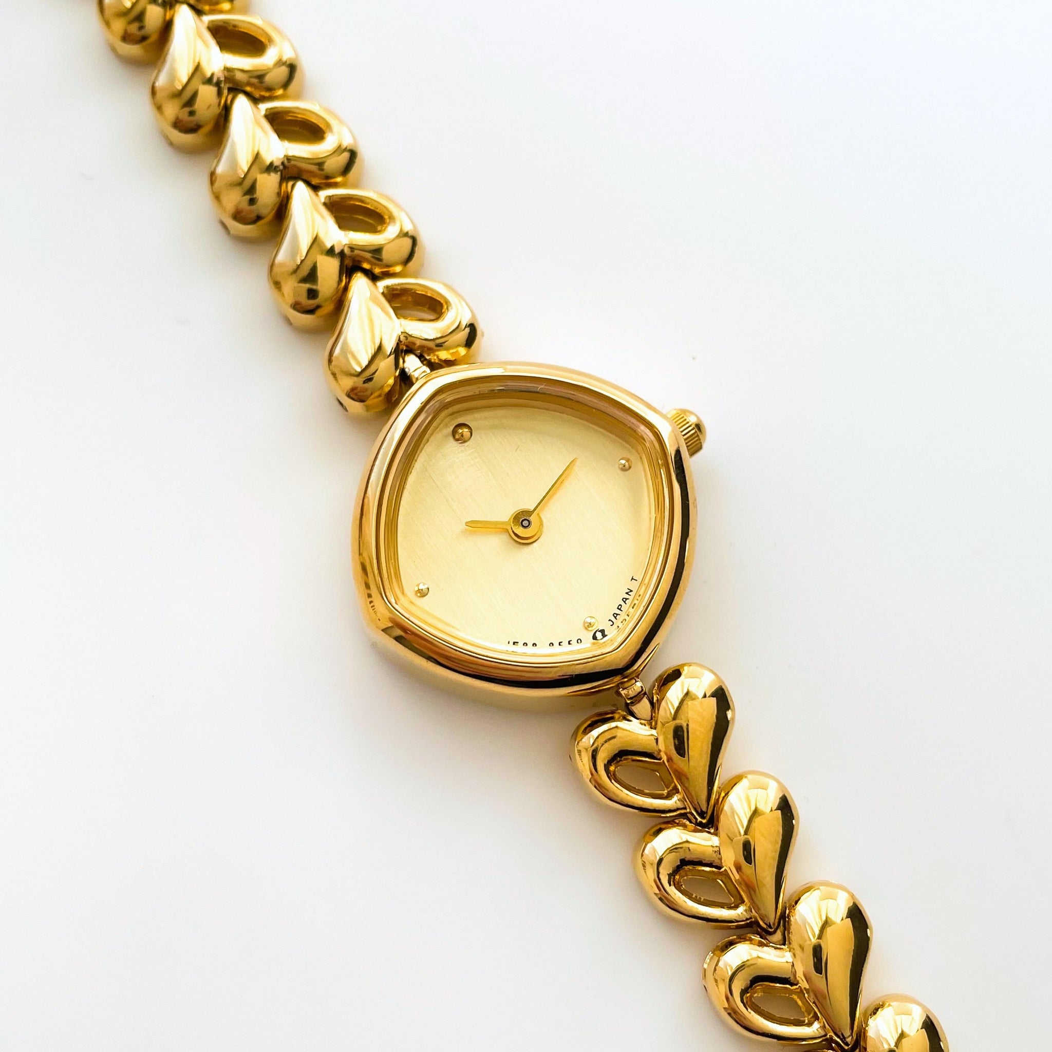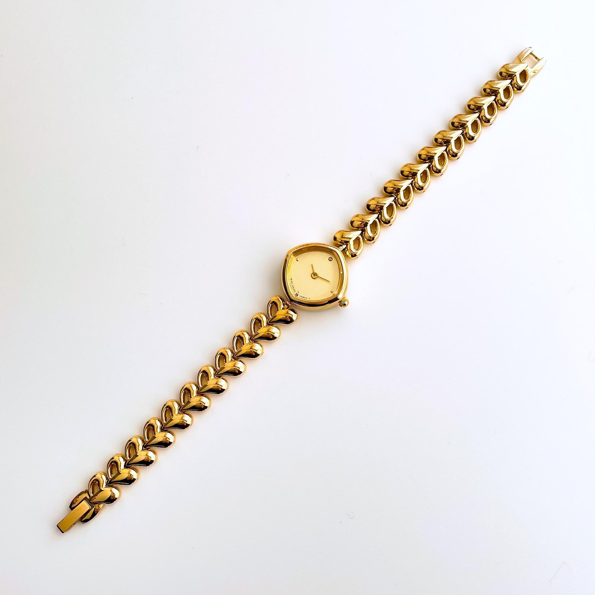 Dainty gold-tone watch with small gold dial. The links of the bracelet are heart shaped. A very thin and dressy retro model.