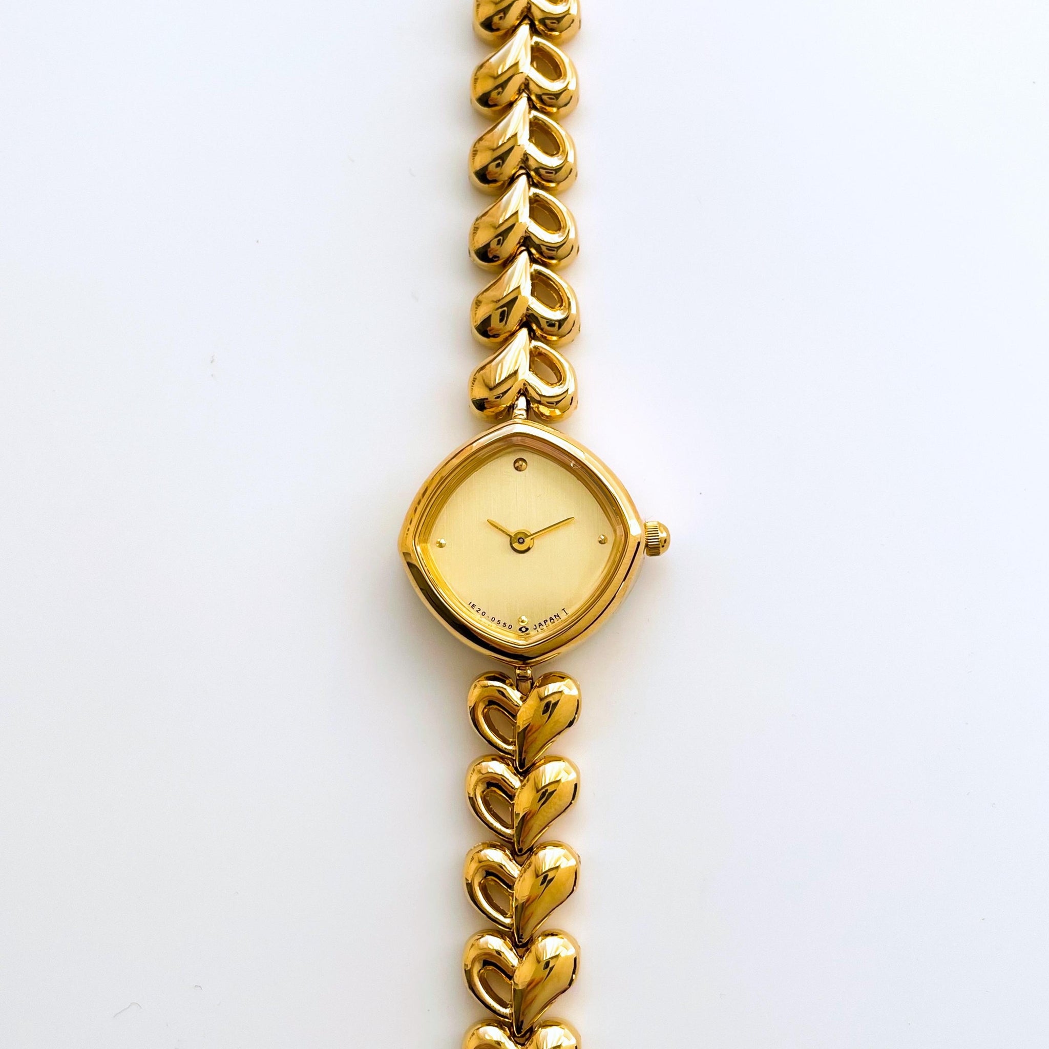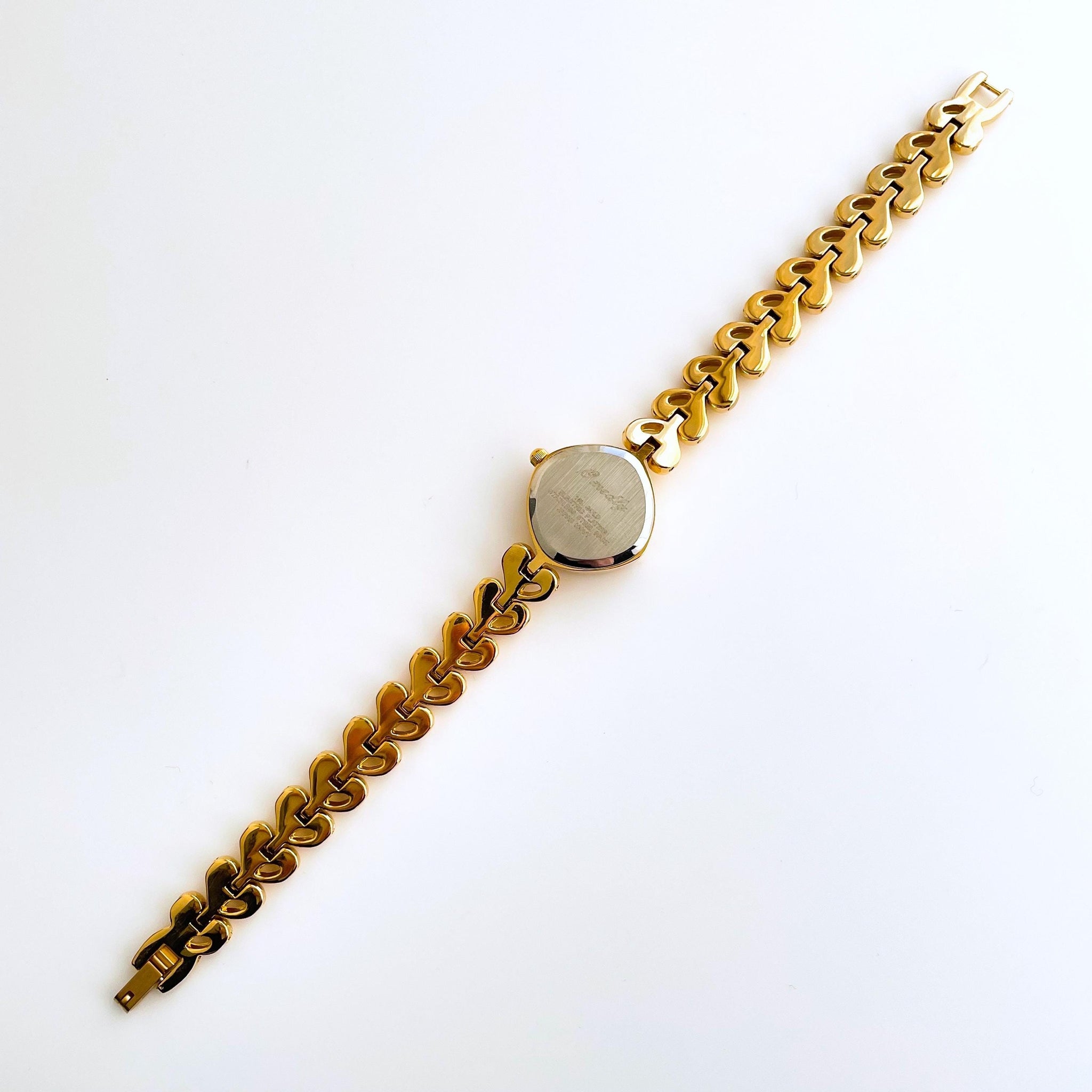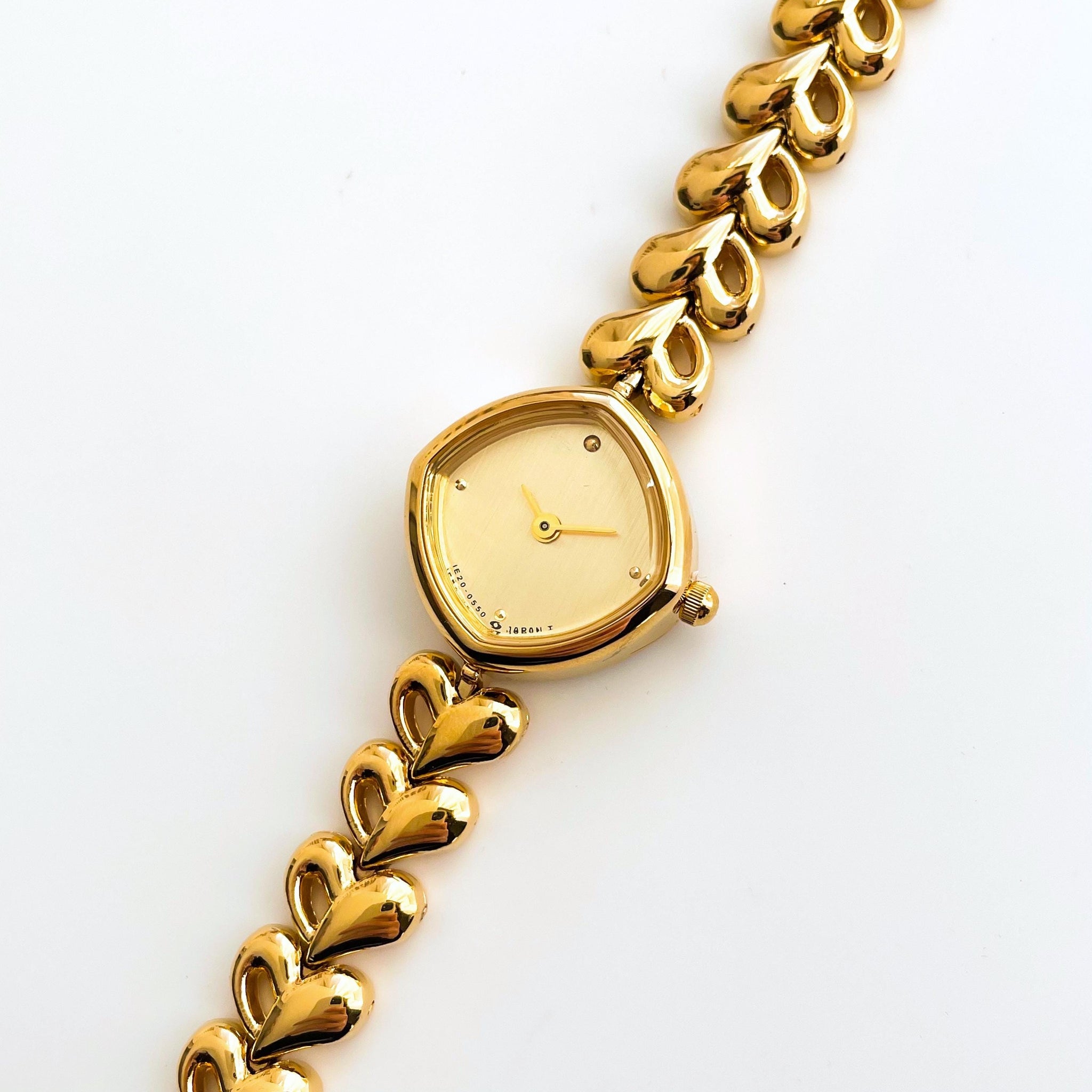 Dainty gold-tone watch with small gold dial. The links of the bracelet are heart shaped. A very thin and dressy retro model.