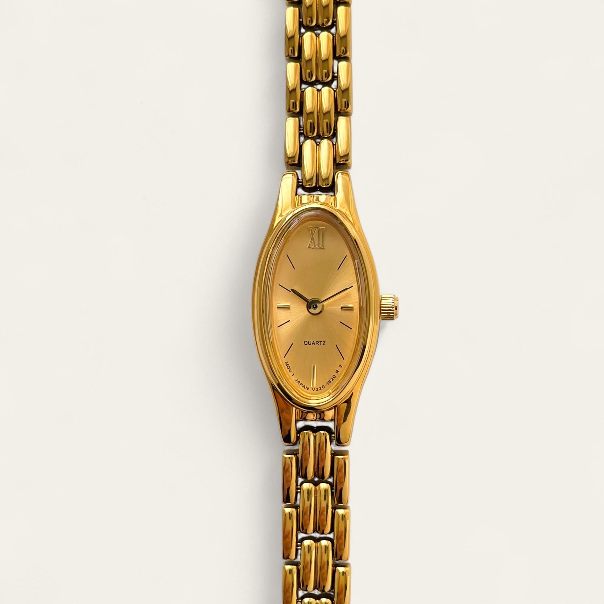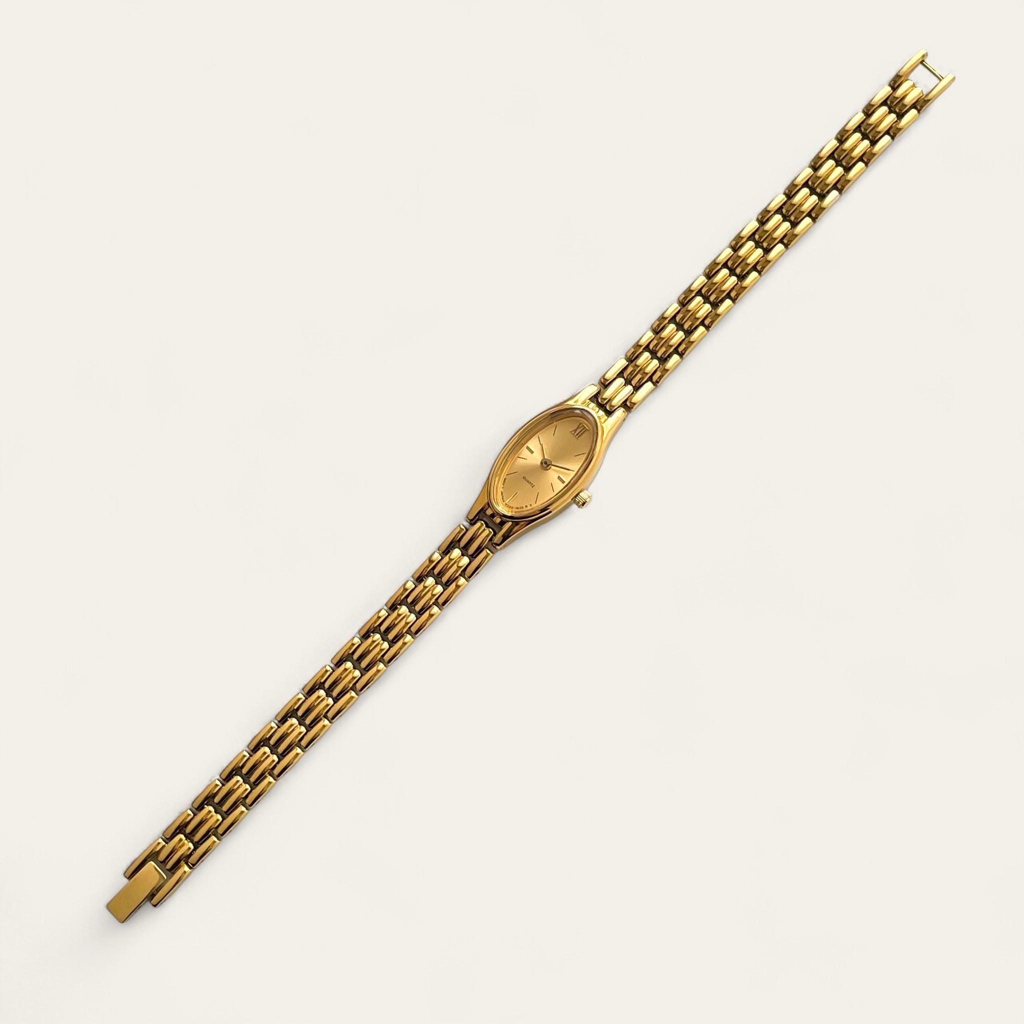 Dainty gold-tone watch with small oval dial. A very thin and dressy retro model.