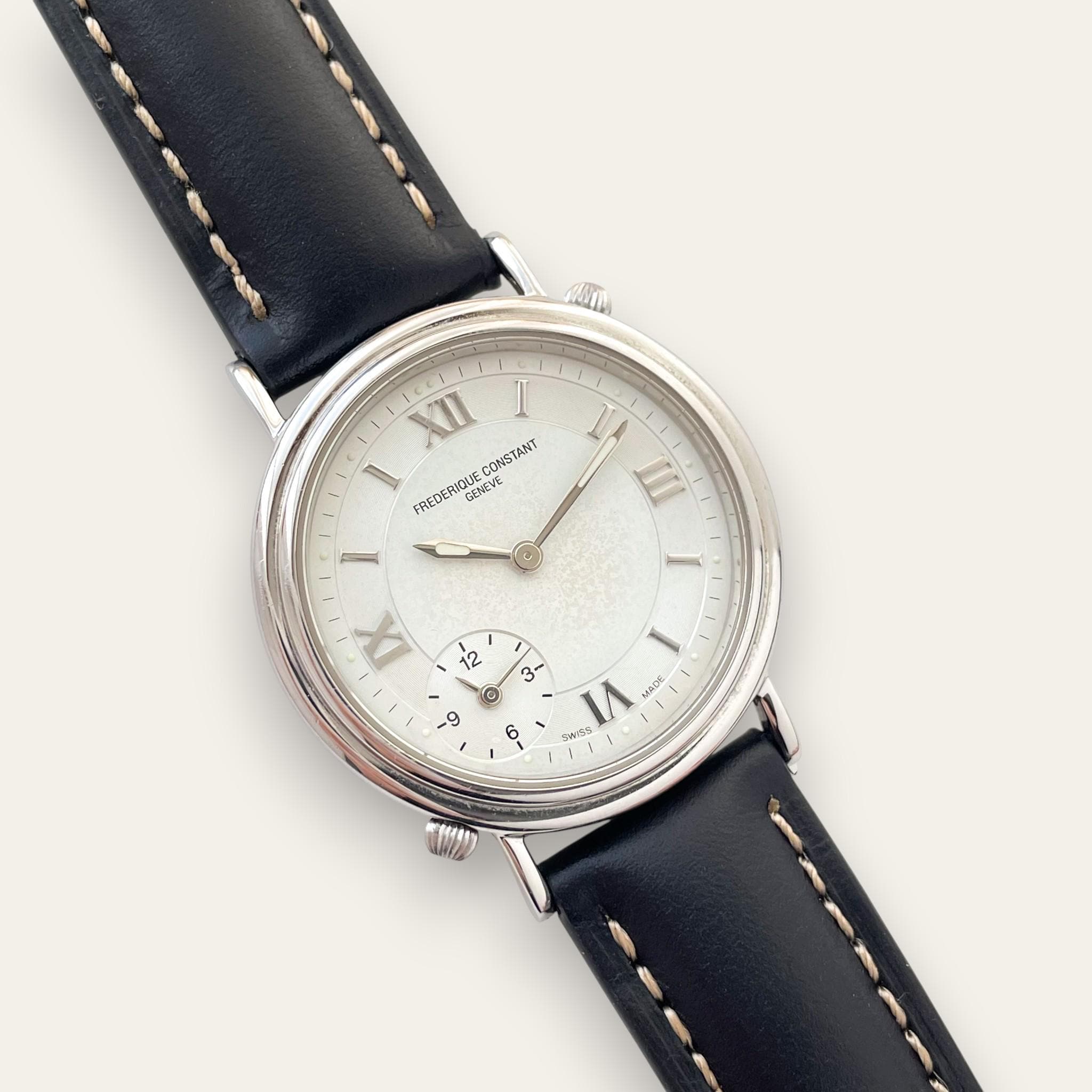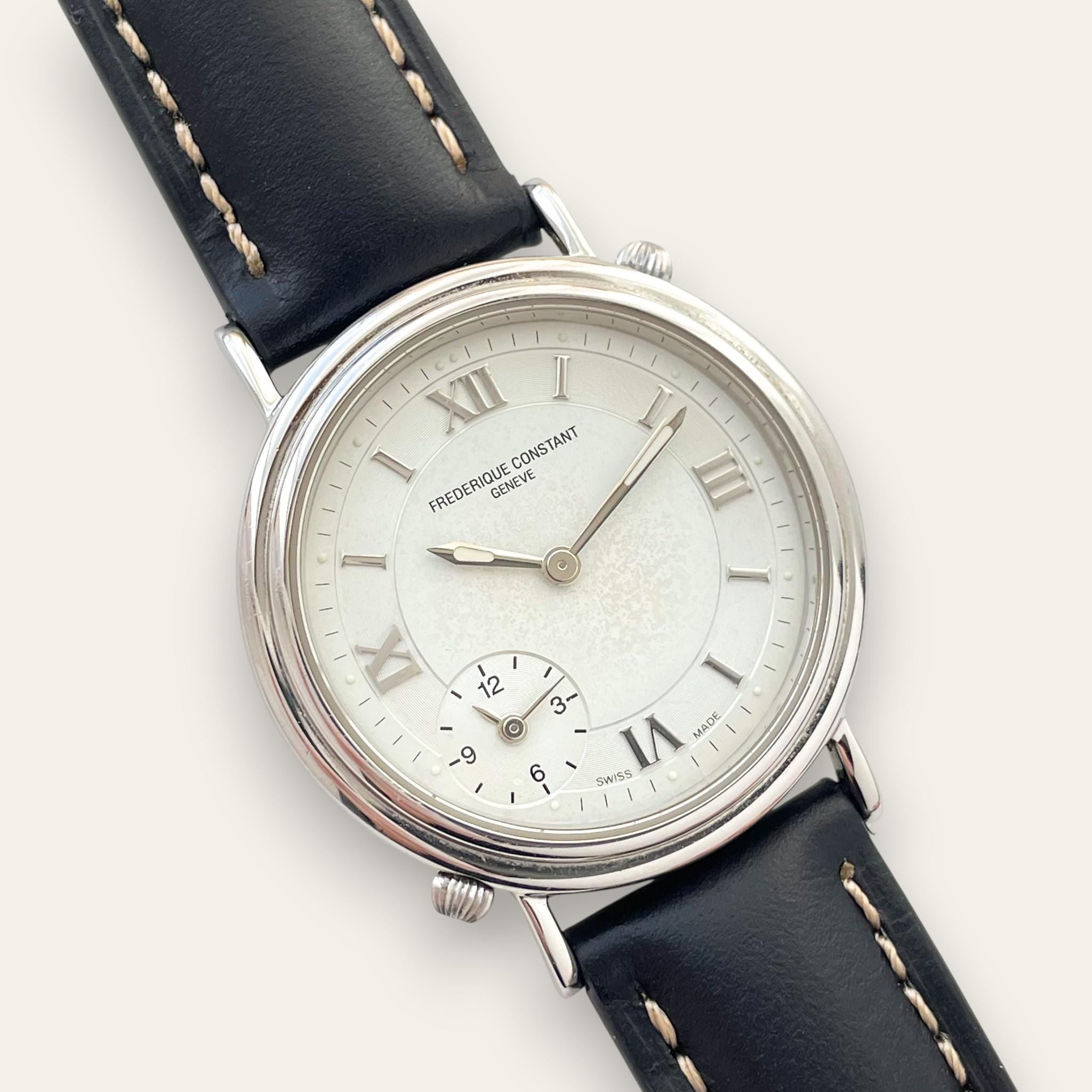 Men's / Unisex Frédérique Constant Dual Time Swiss watch. Sapphire crystal, double crown and black leather strap.