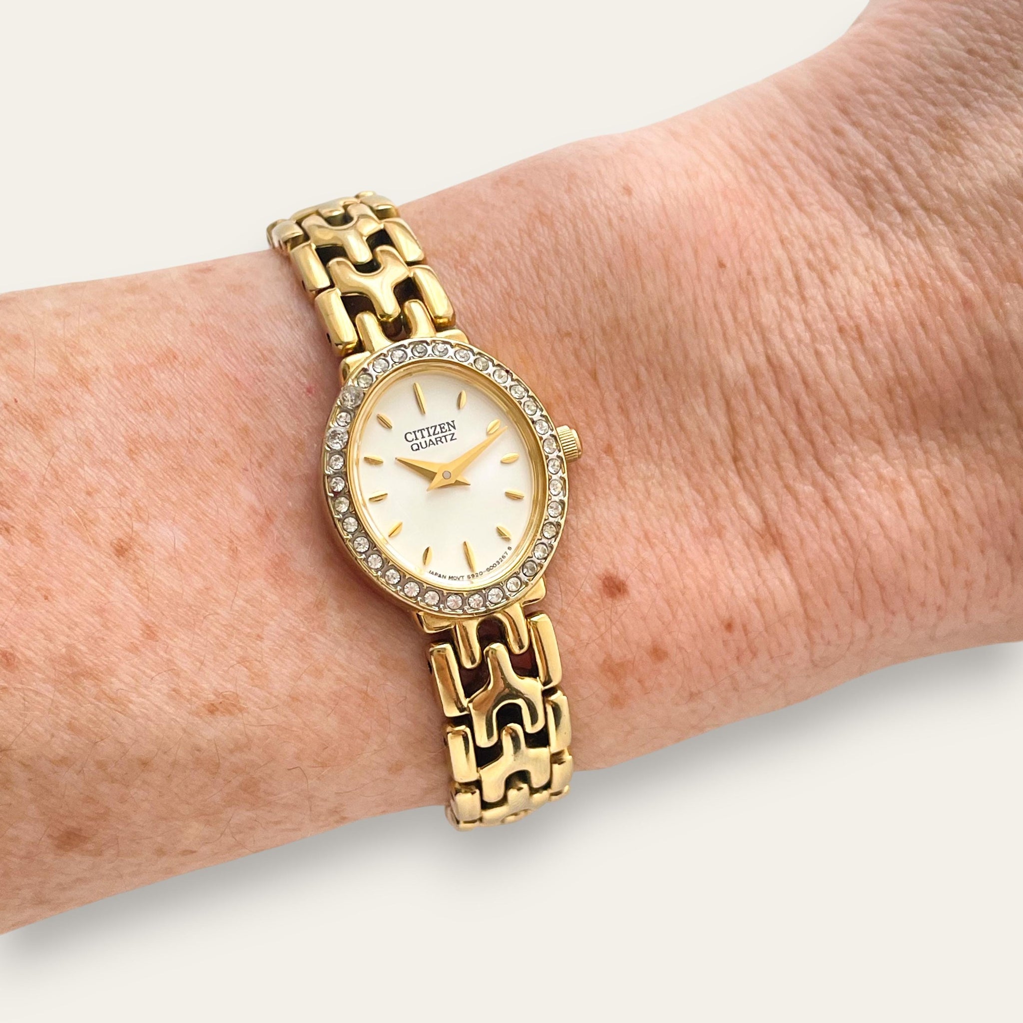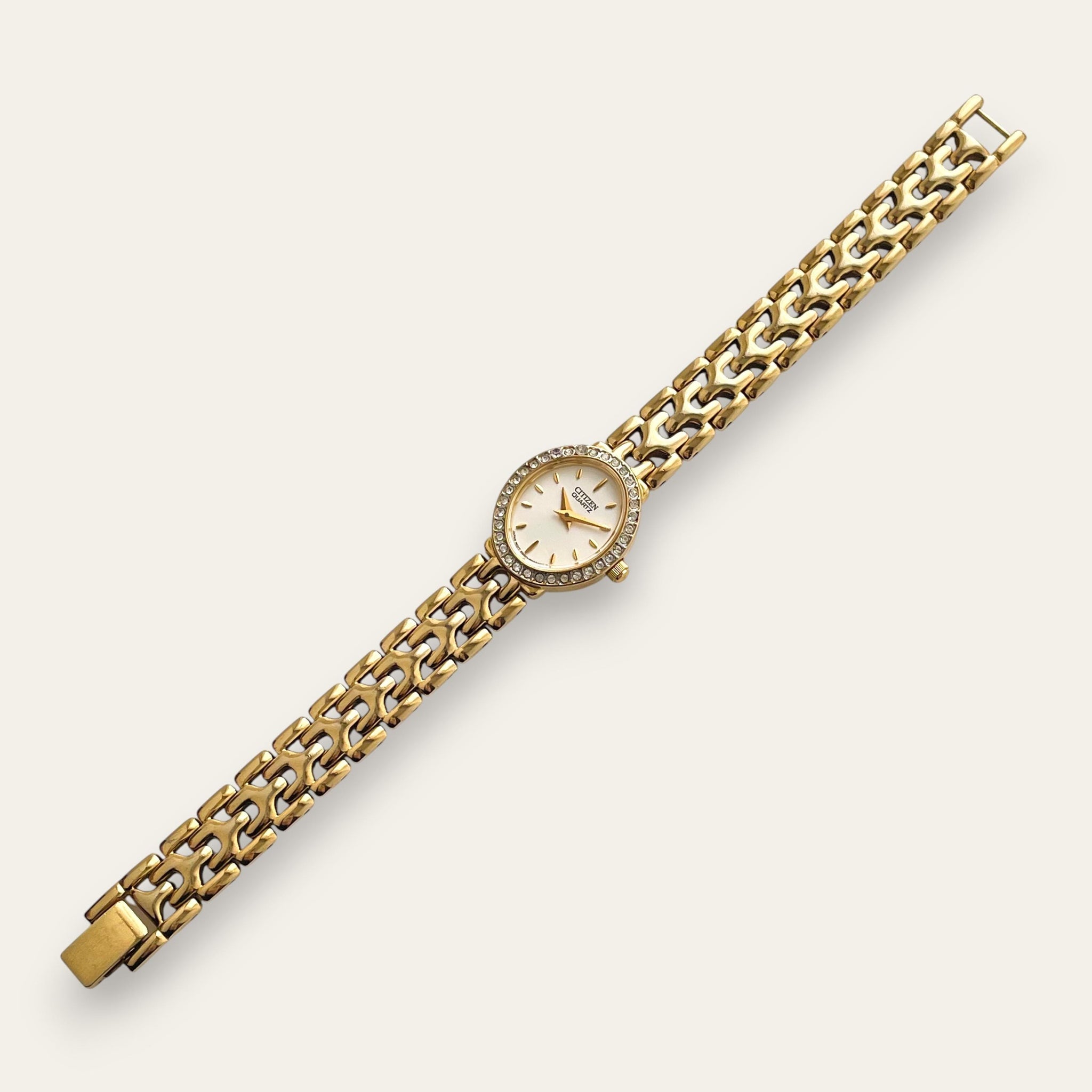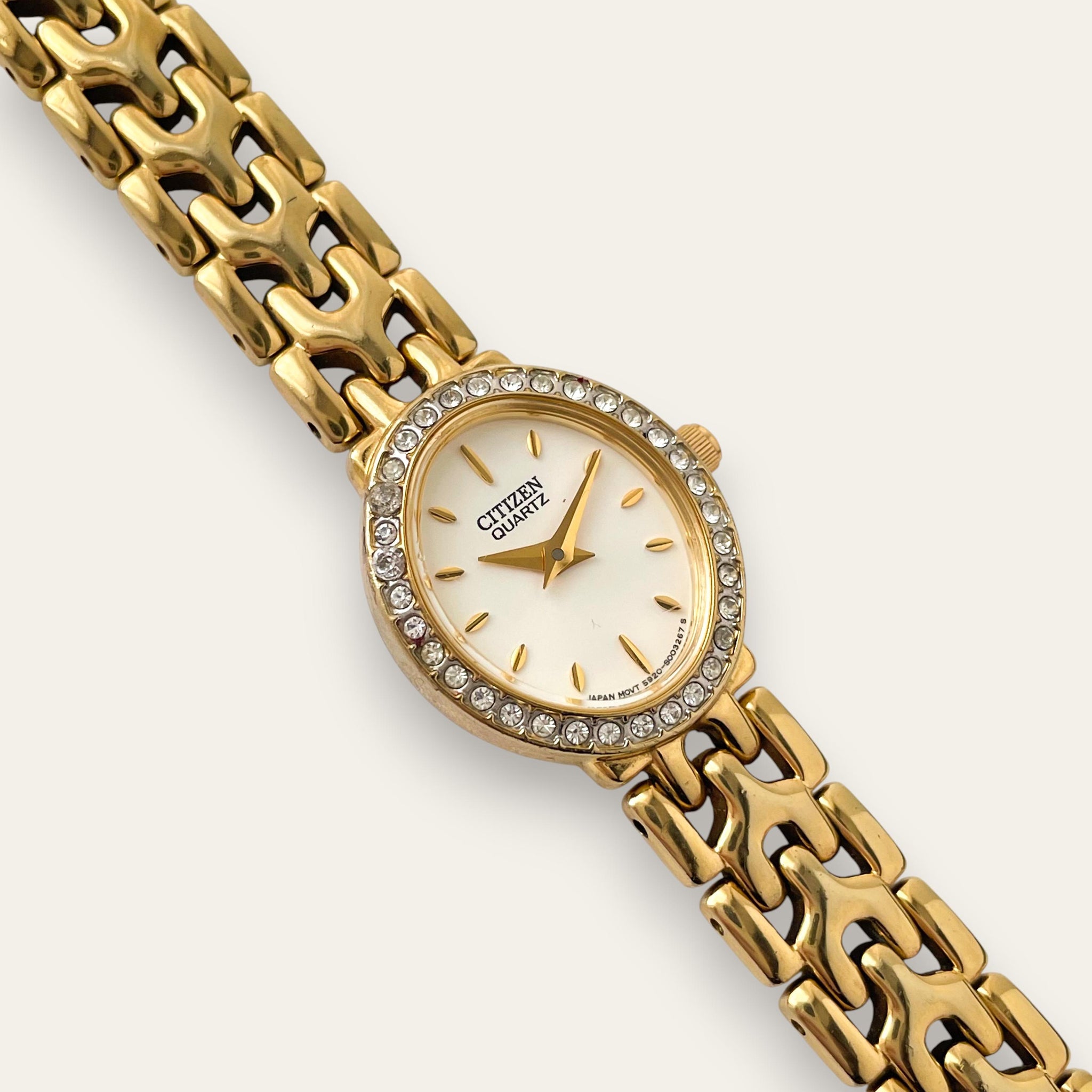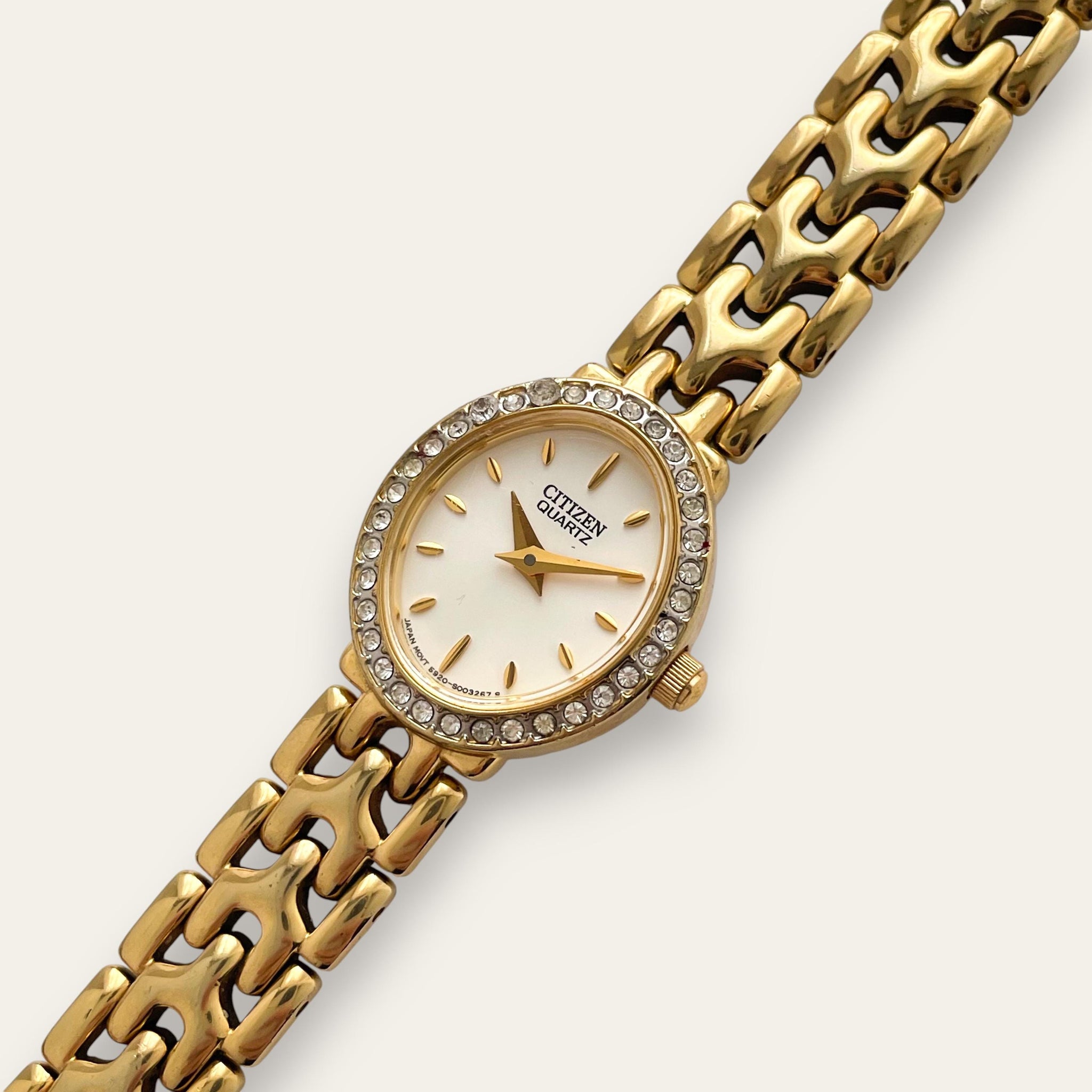 Ladies' gold-plated Citizen watch with oval crystal-set bezel.