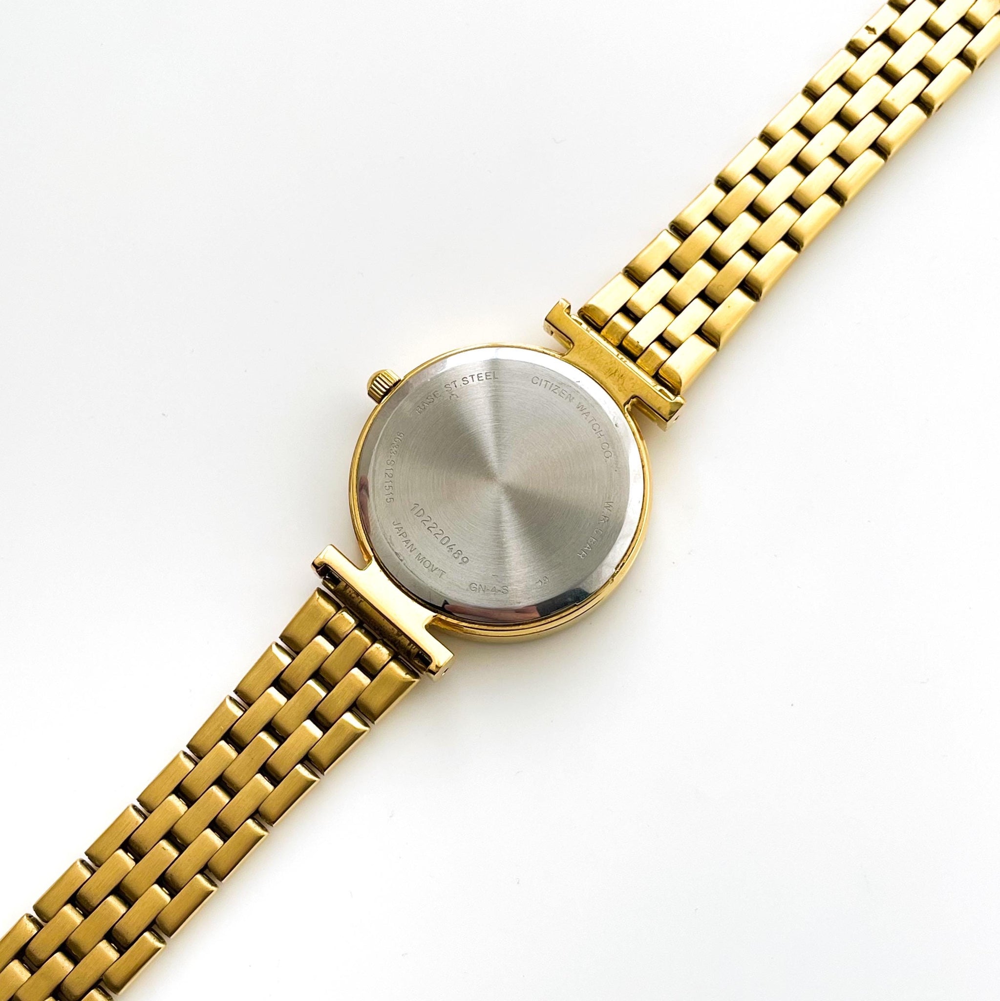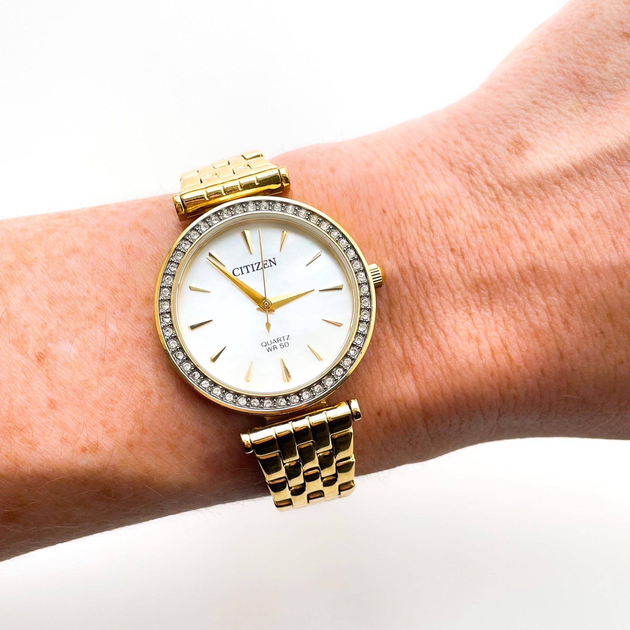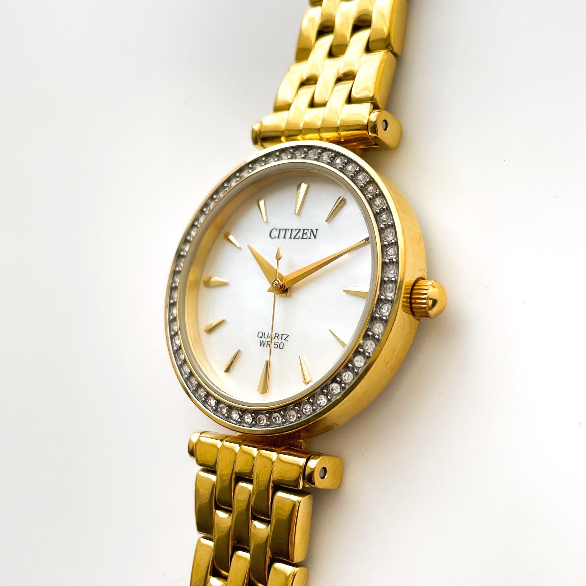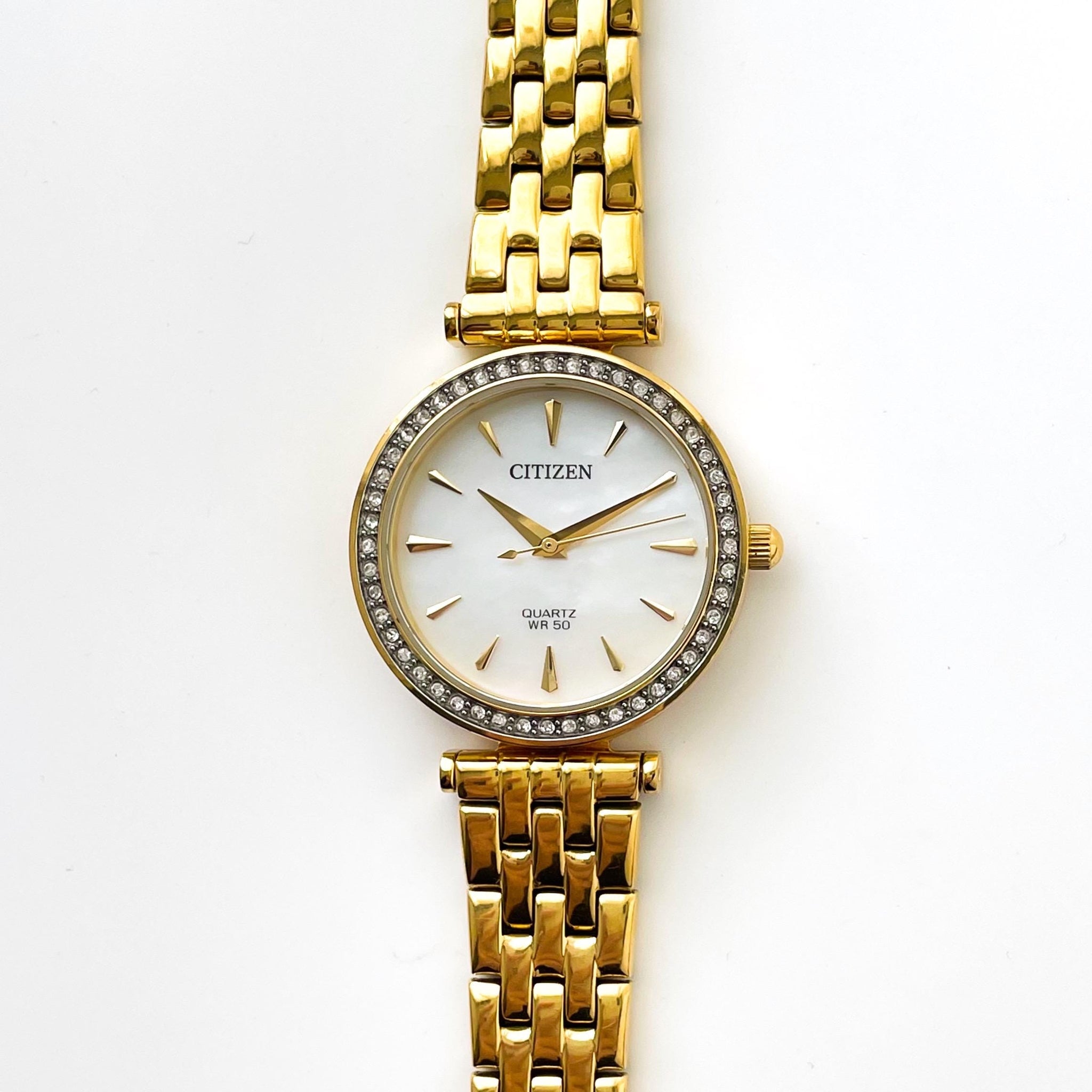 Ladies' gold-plated Citizen watch with mother of pearl dial and crystal-set bezel.