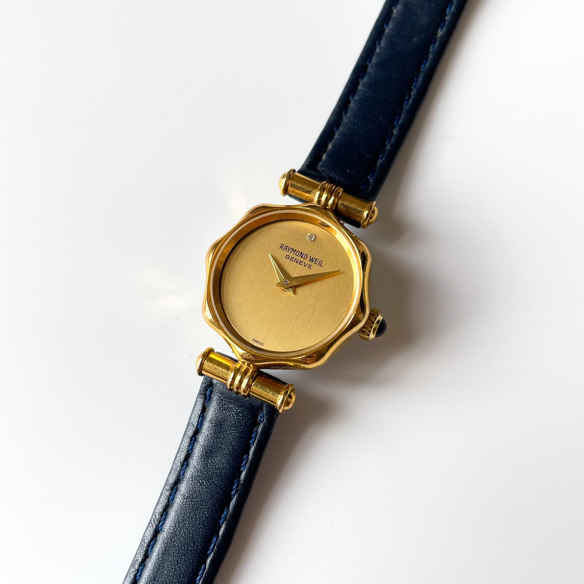 Gold-plated Raymond Weil watch with round dial, ornate bezel and small diamond at 12 o'clock. It has a dark blue leather strap. This is a very elegant and dainty watch by one of the most renowned Swiss watchmakers.