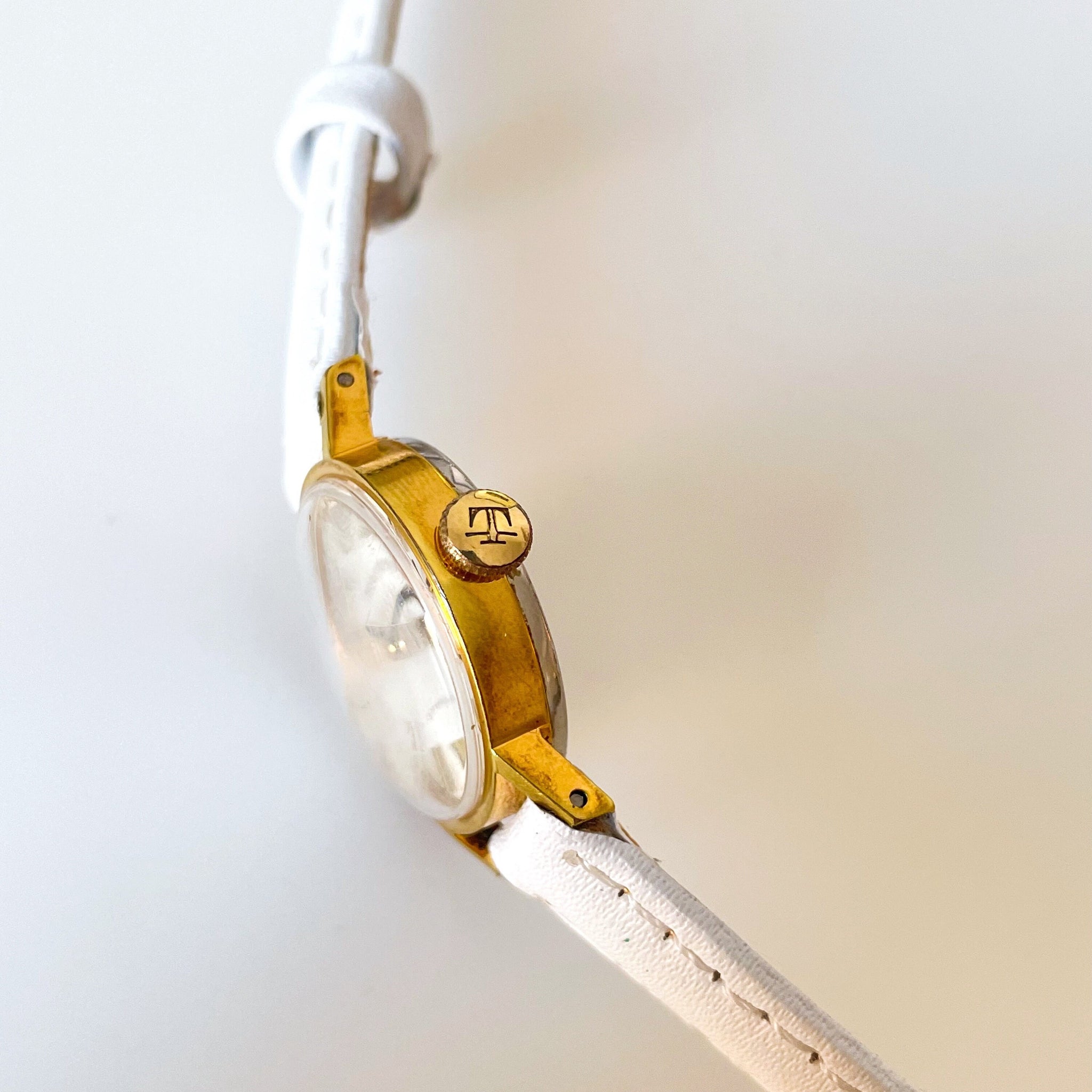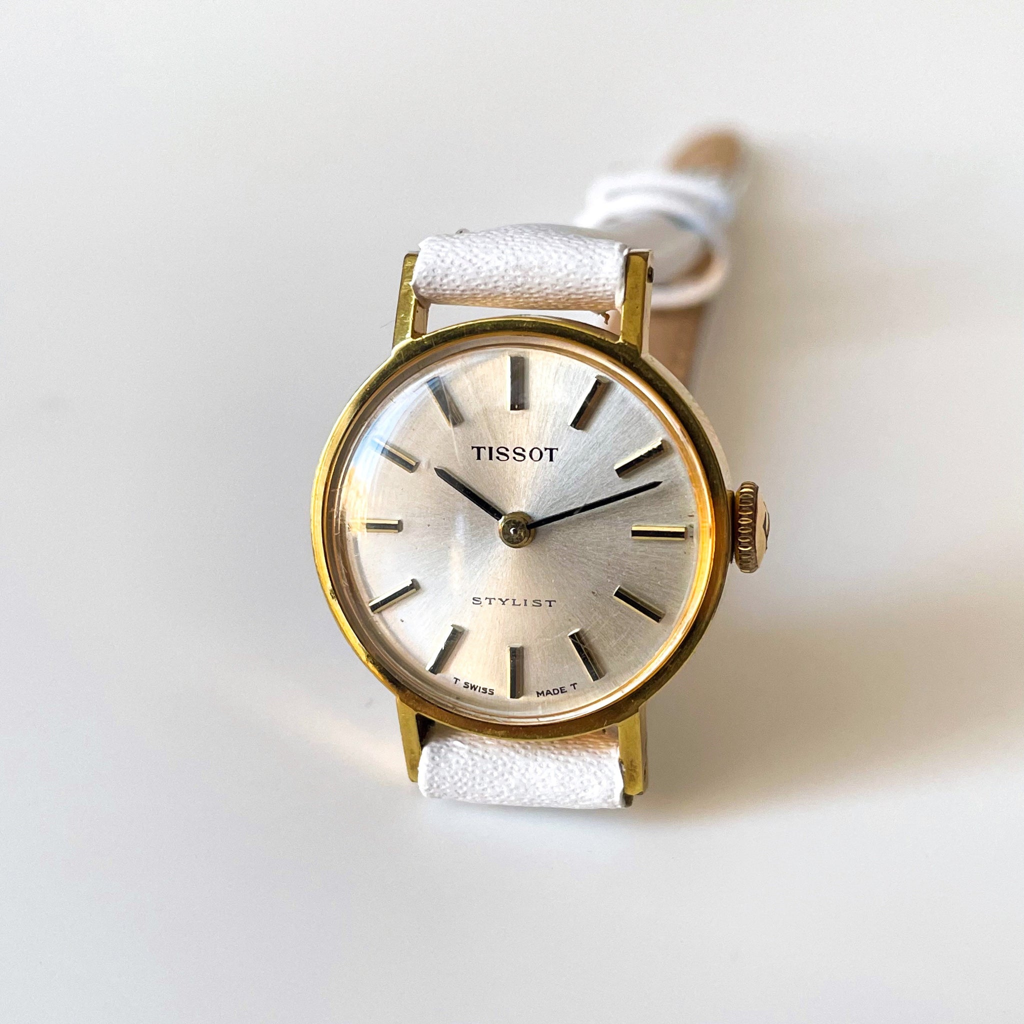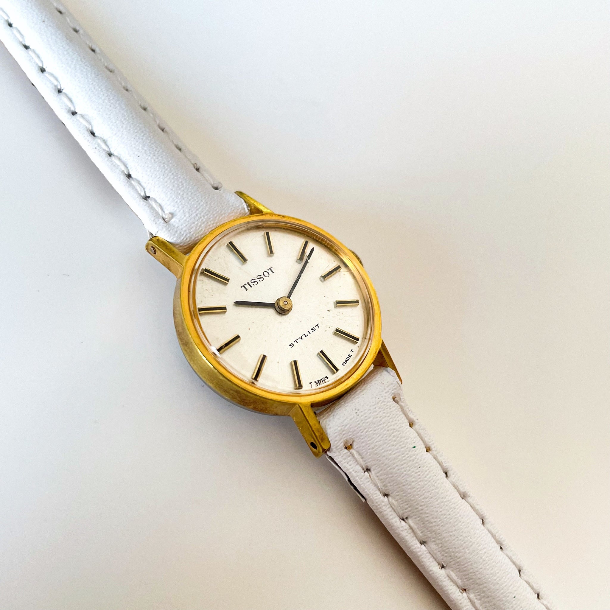 Gold-plated Tissot watch with round silver dial and white leather strap. This is a very elegant and dainty watch by one of the most renowned Swiss watchmakers.