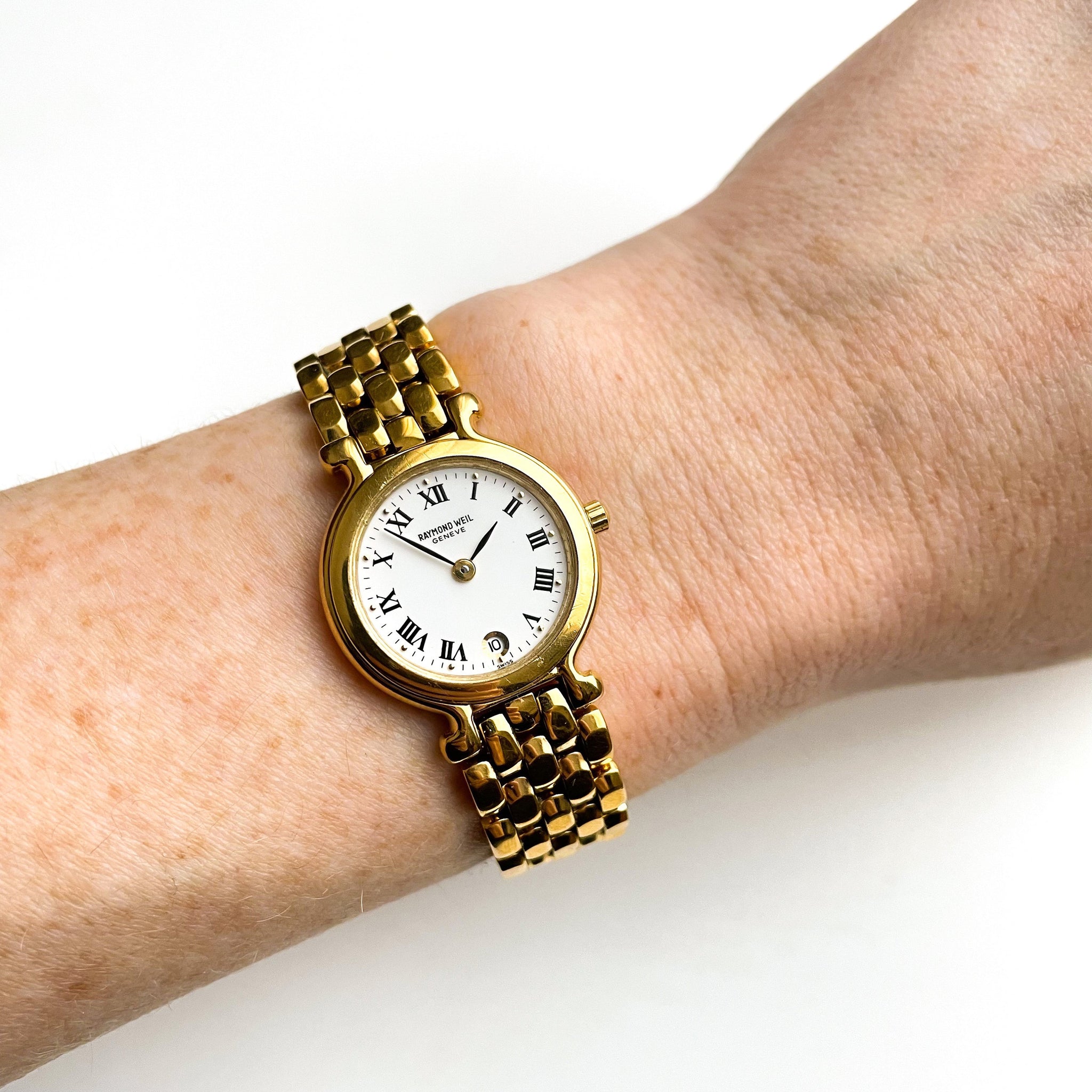 Elegant gold-plated Raymond Weil watch with intricate bracelet and white dial with Roman numerals and date window. A beautiful and feminine classic watch by one of the most famous Swiss watchmakers.