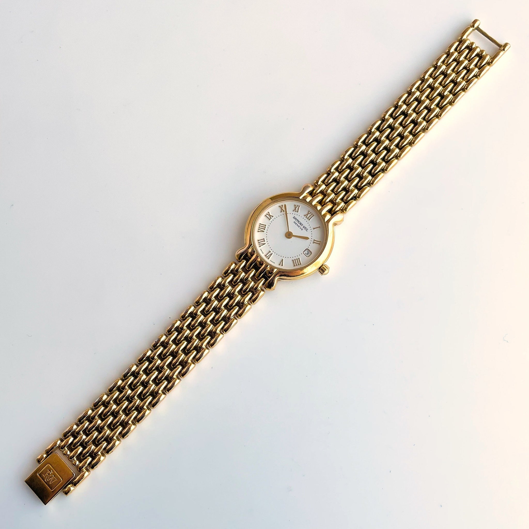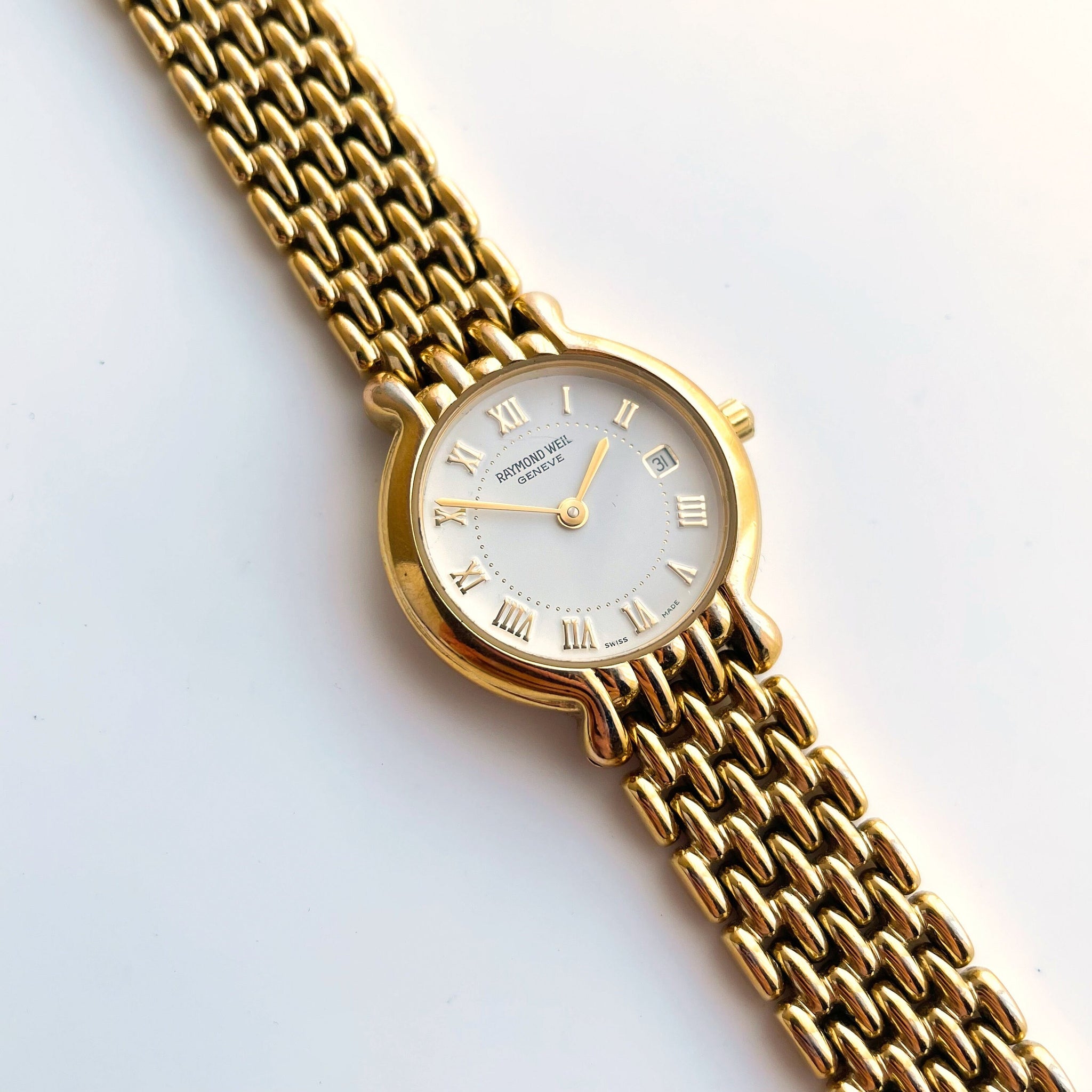 Elegant gold-plated Raymond Weil watch with intricate bracelet and white dial with Roman numerals and date window. A beautiful and feminine classic watch by one of the most famous Swiss watchmakers.