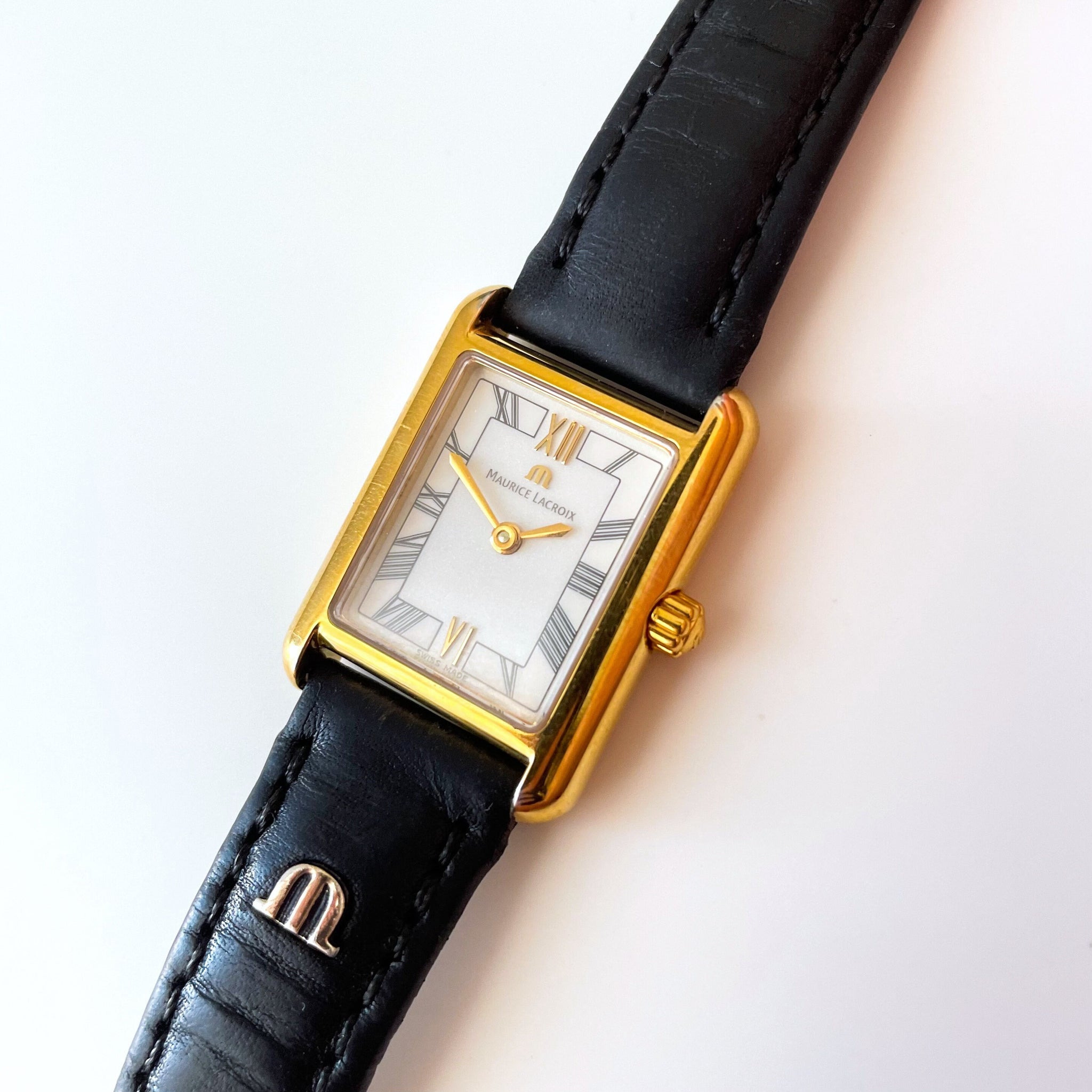 Elegant ladies’ gold-plated Maurice Lacroix watch, with tank-style rectangular dial with Roman numerals, and original leather strap with the characteristic metallic M on the strap and crown. A timeless and elegant piece.