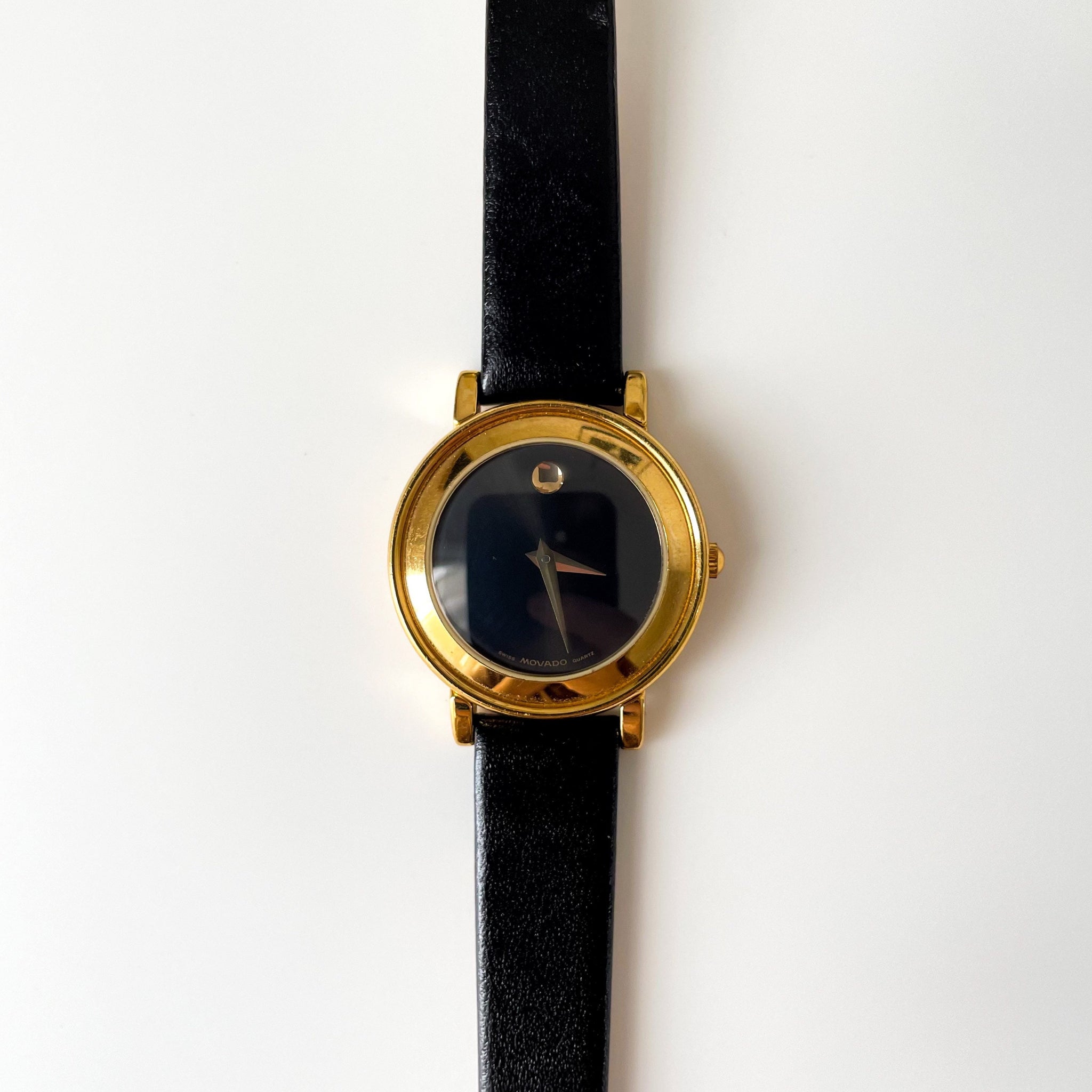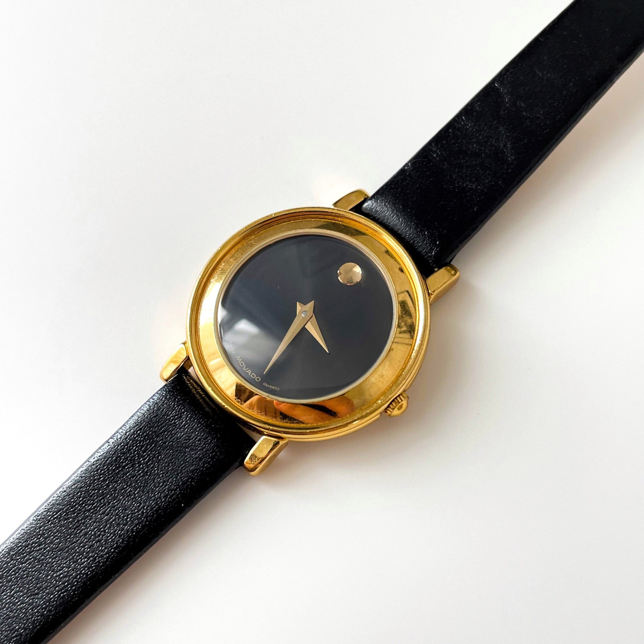 Vintage ladies' Movado Museum quartz watch, with the emblematic black minimalist dial with single dot at 12 o'clock and smooth leather strap. A very stylish and timeless piece from the iconic designer.