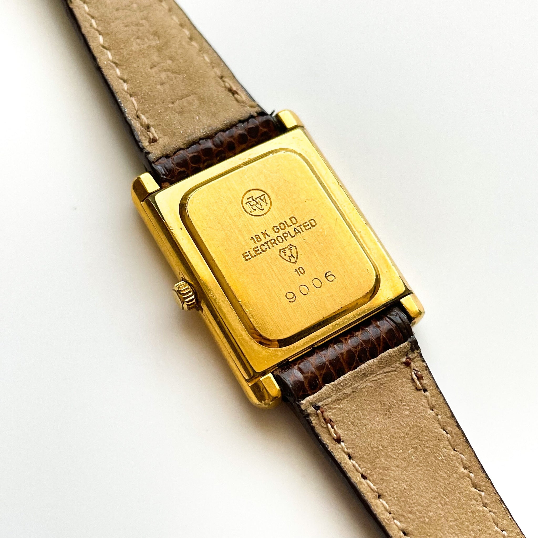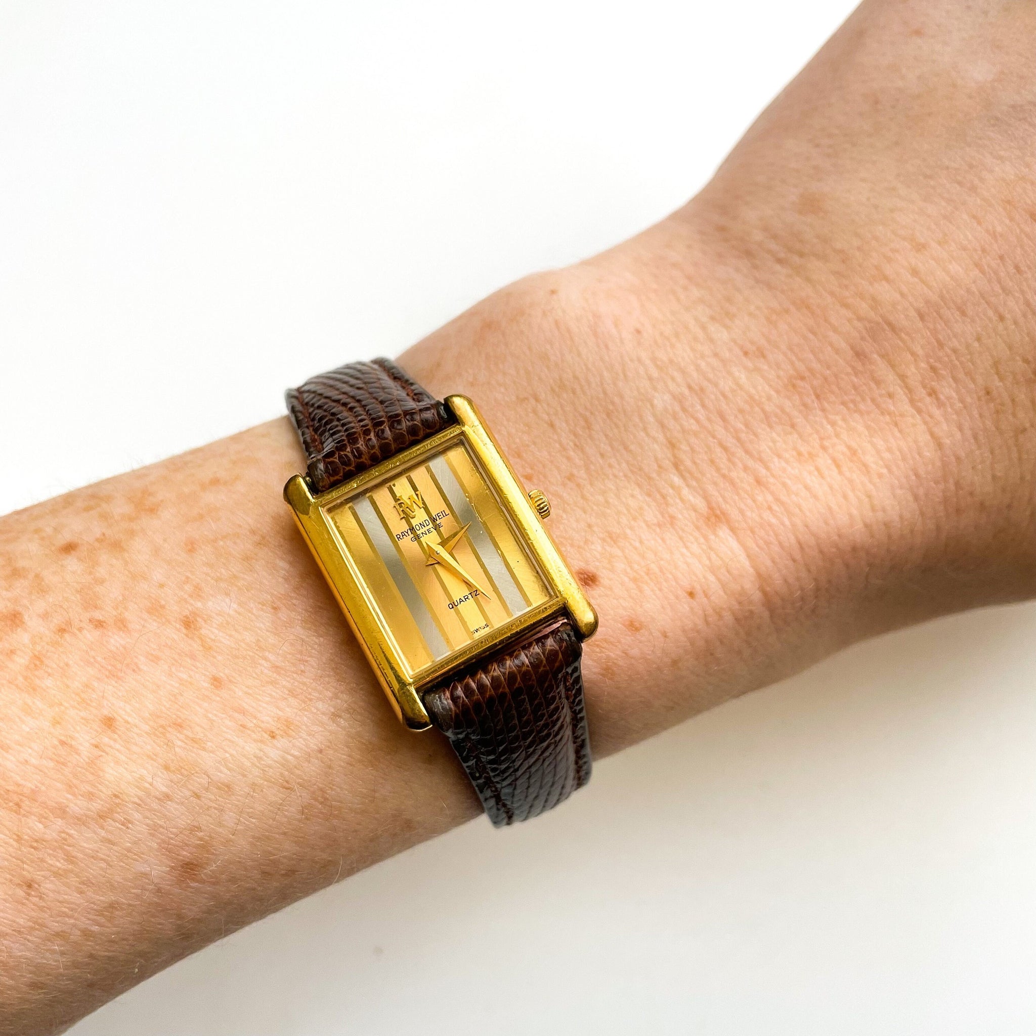 Elegant ladies’ 18k gold-plated Raymond Weil watch, with tank-style rectangular dial, silver, gold and rose gold striped dial and brown leather strap. A unique vintage piece.