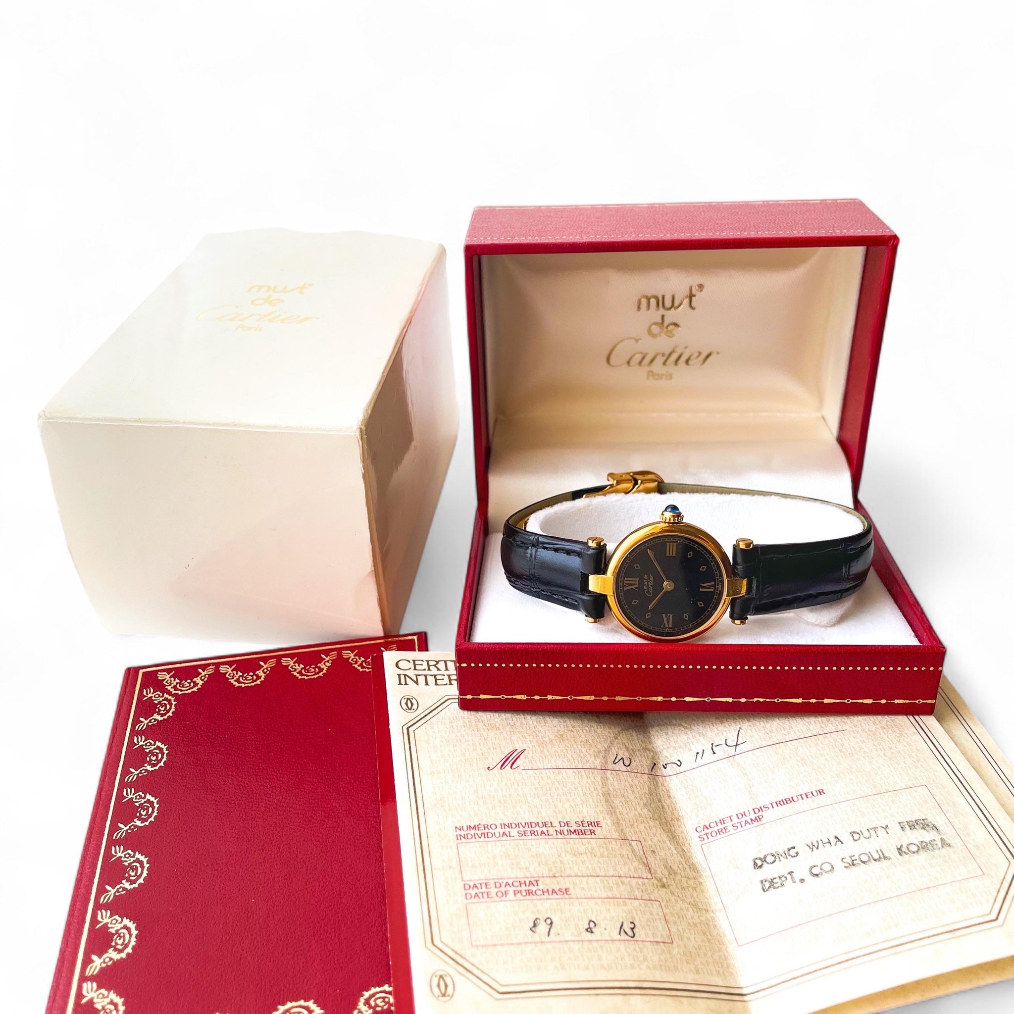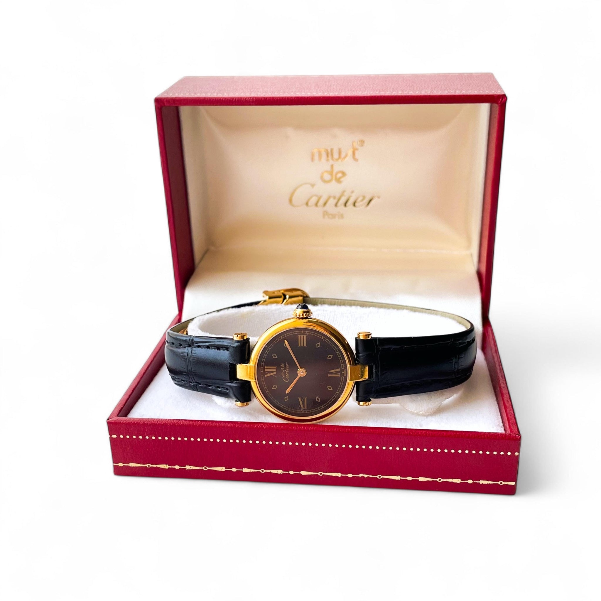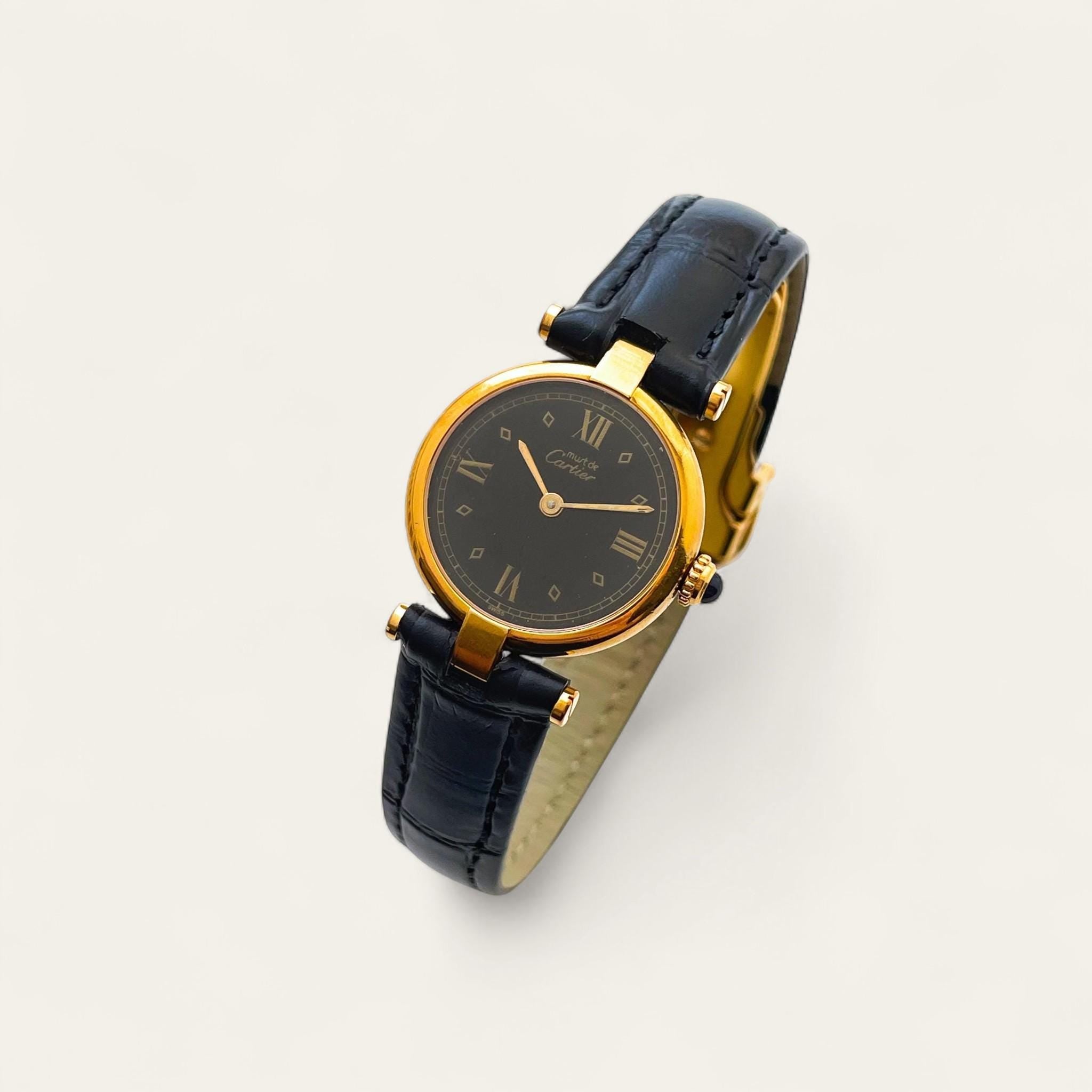 Vintage ladies' Cartier Must Vendôme Vermeil, with black dial, leather strap, deployant clasp and classic blue cabochon crown. 20 microns gold-plated 925 silver. A timeless piece from the French luxury brand.