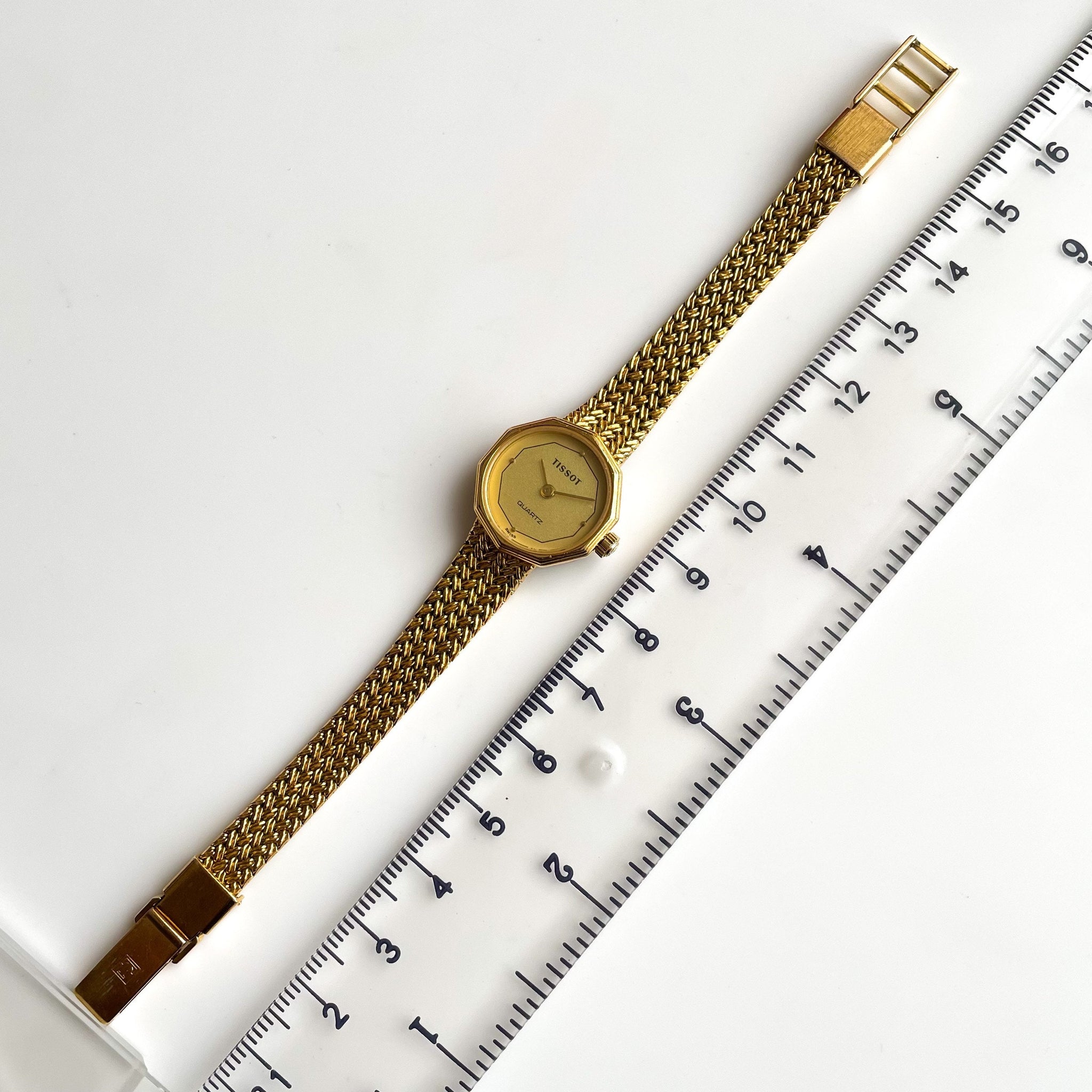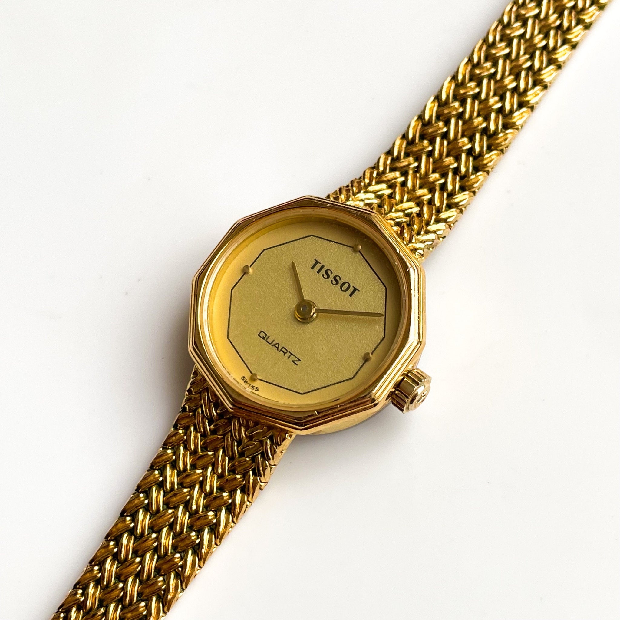Dainty Tissot watch with braided gold-plated bracelet and jewellery clasp. A beautiful watch for every day wear and special occasions alike by the renowned Swiss watchmaker.