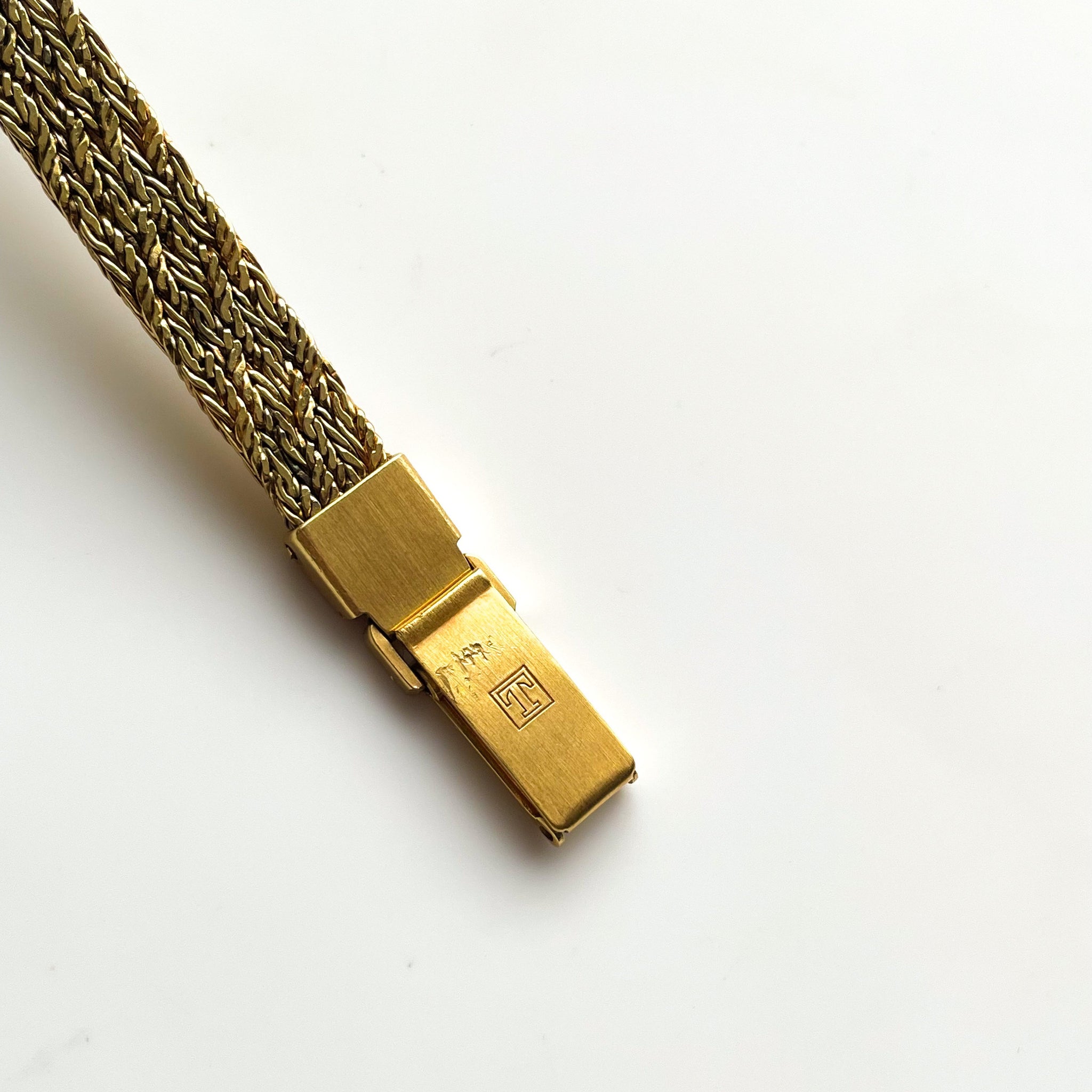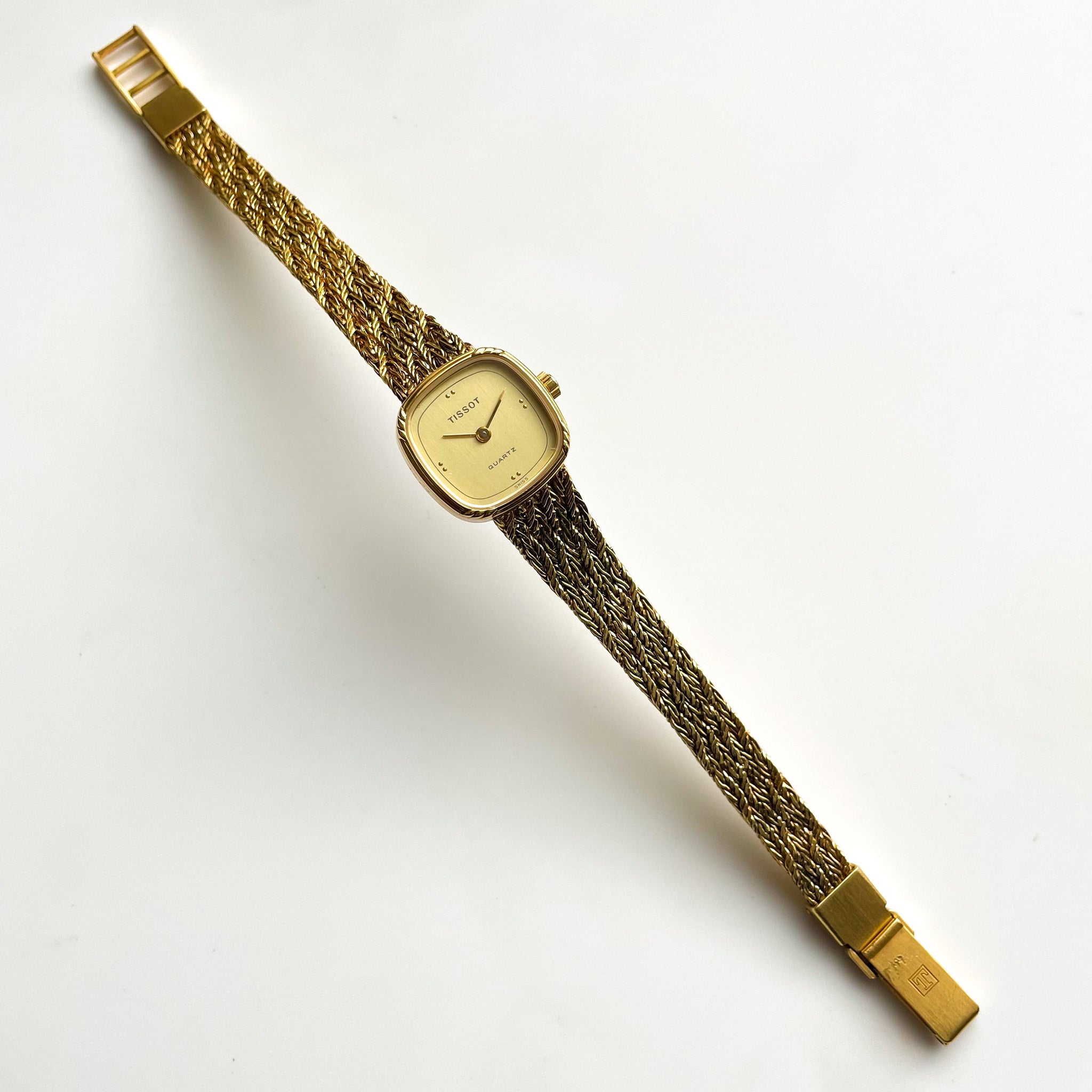 Dainty Tissot watch with braided gold-plated bracelet and jewellery clasp. It has a rounded square dial with silver-tone lettering. A beautiful watch for every day wear and special occasions alike by the renowned Swiss watchmaker.