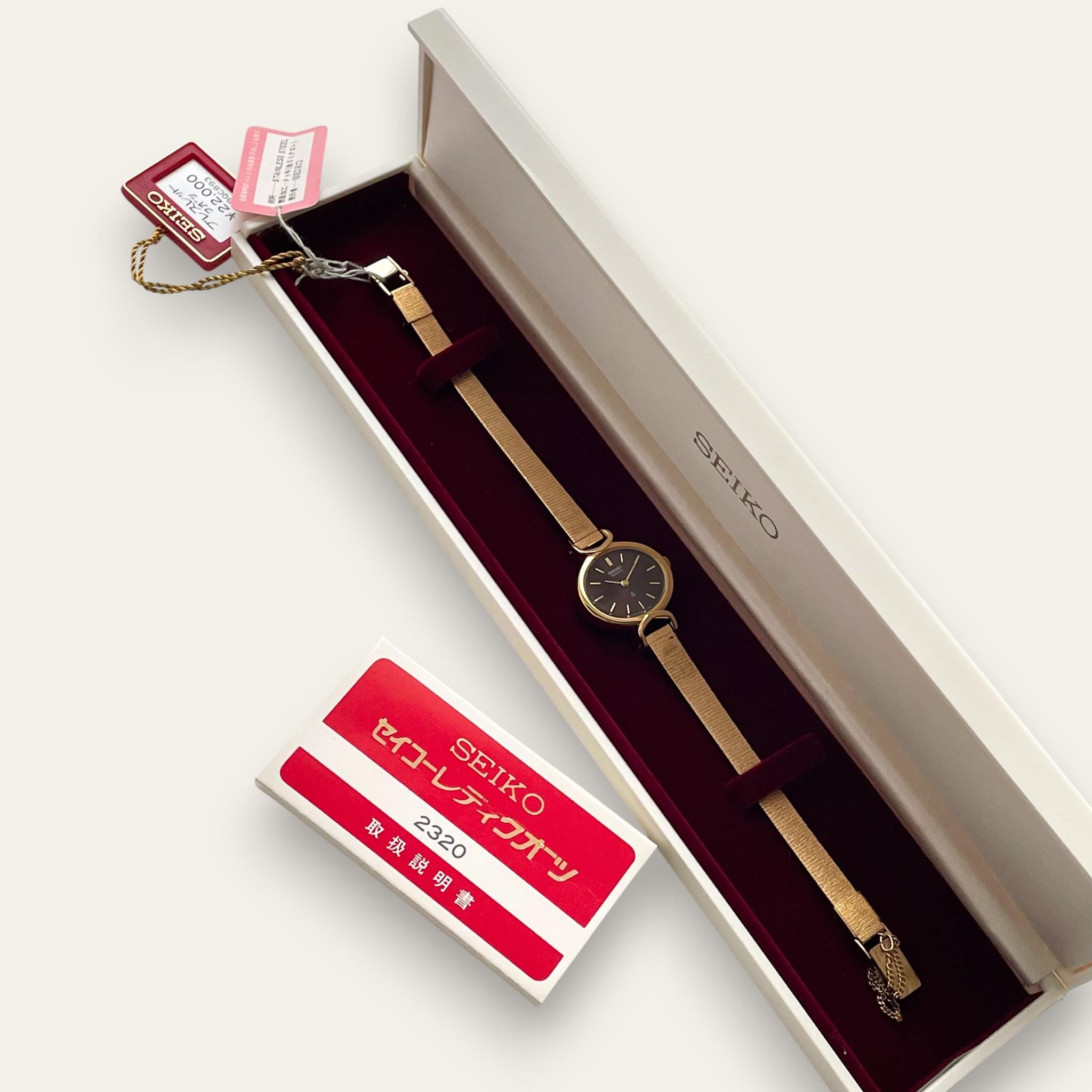 Rare ladies' Seiko 1981 gold-plated watch with metallic brown oval dial and metal bracelet. New old stock and unworn, label still attached. Comes with the original box and papers. An elegant watch from the Japanese watchmaker.