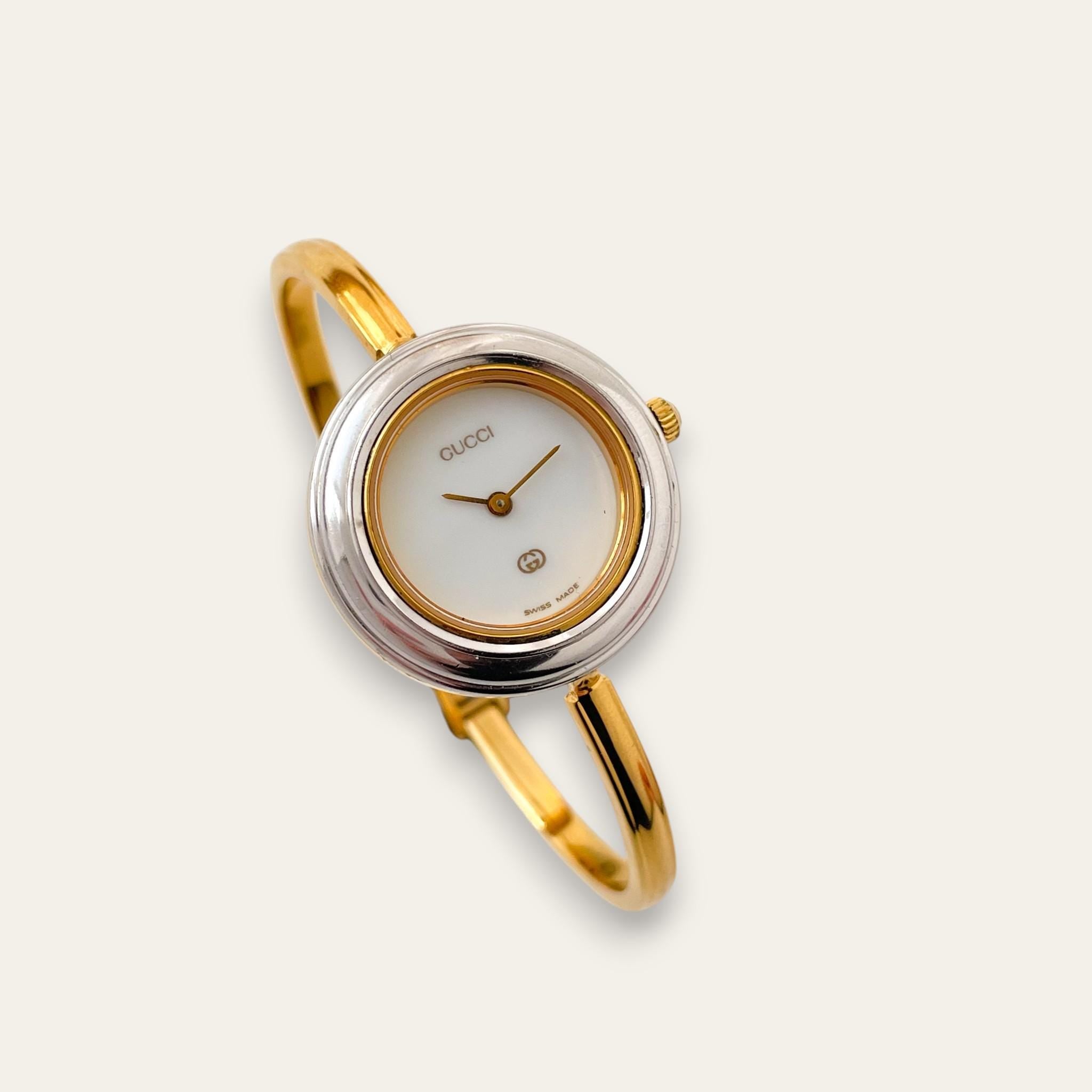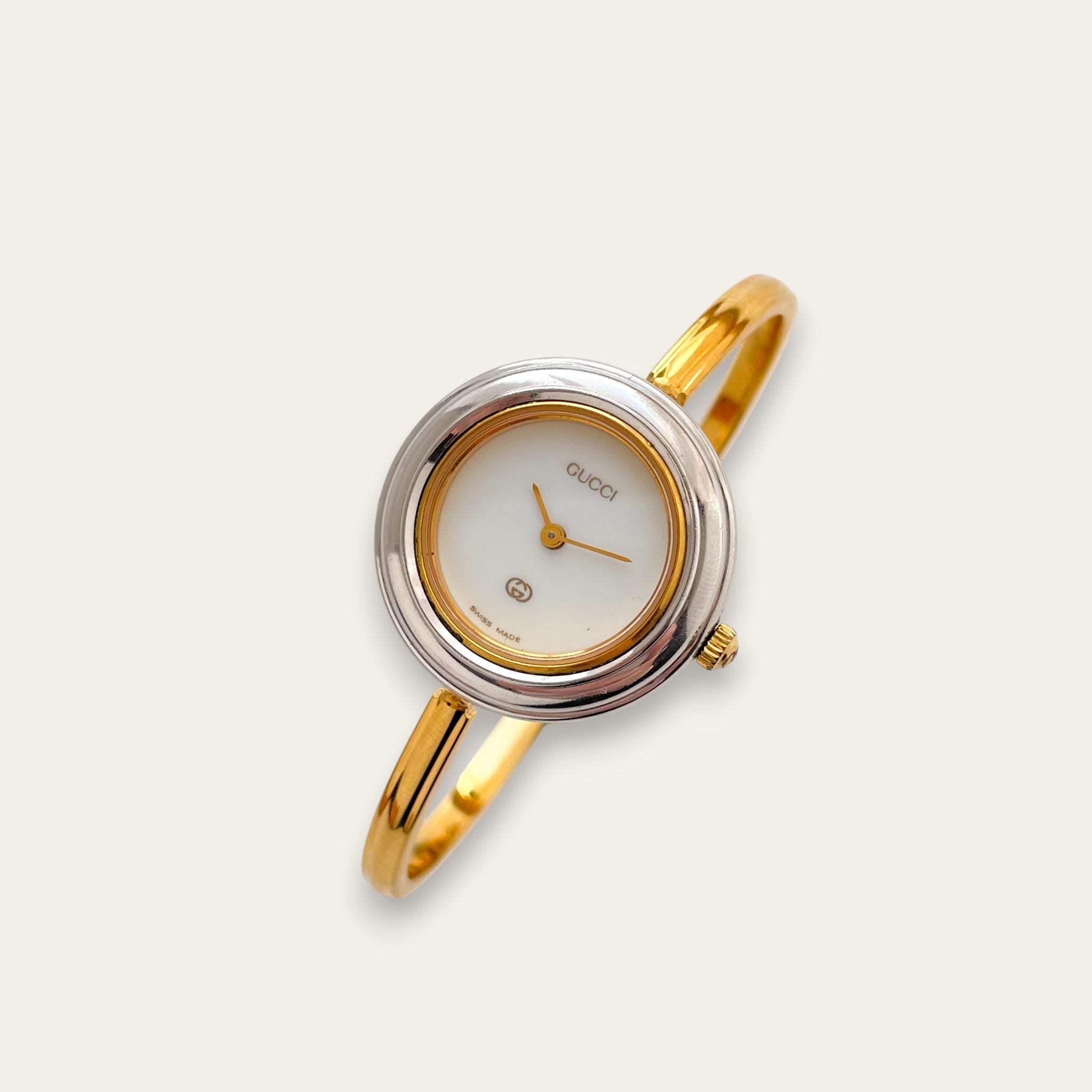 Iconic 90s ladies' Gucci watch, with thin gold-plated bangle bracelet, white dial and 3 interchangeable bezels to match your outfits. Logo engraved on the clasp. Overall a very feminine, dainty and stylish piece from the Italian designer.
