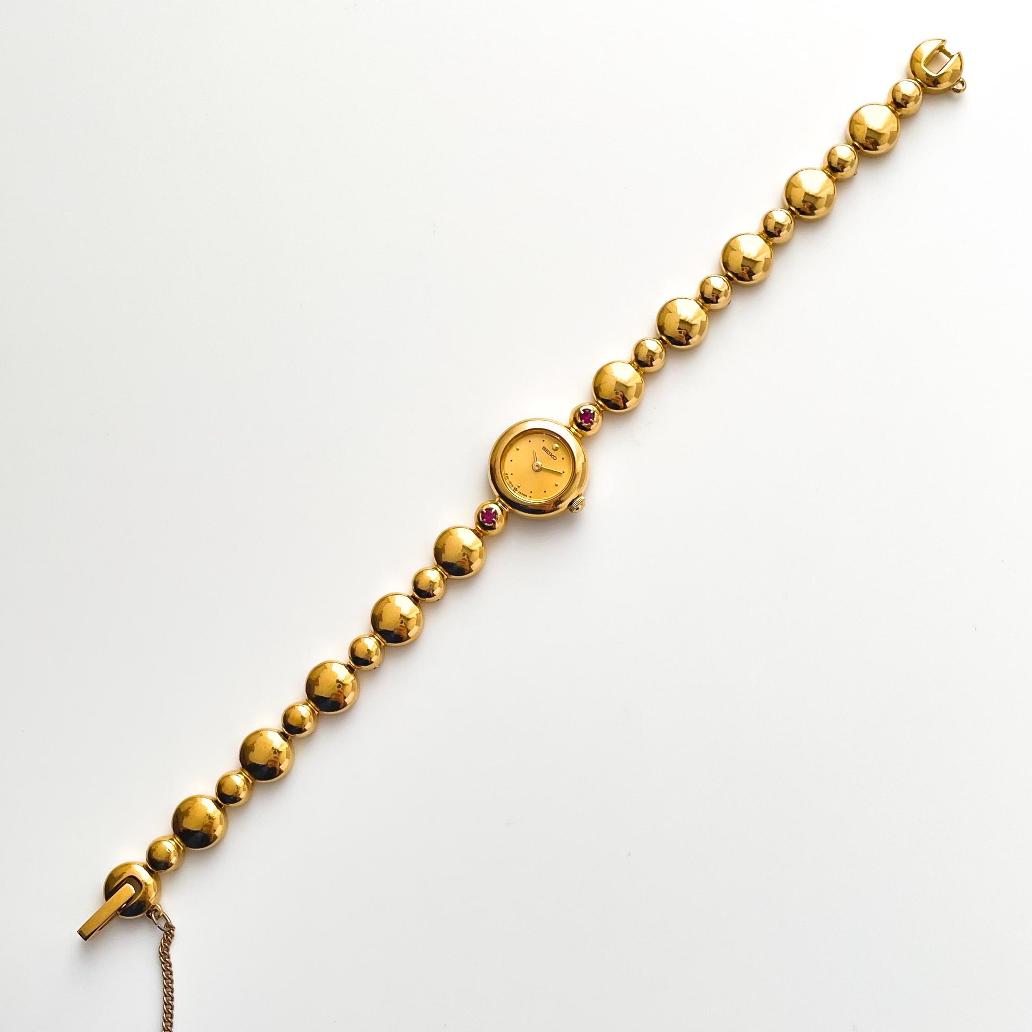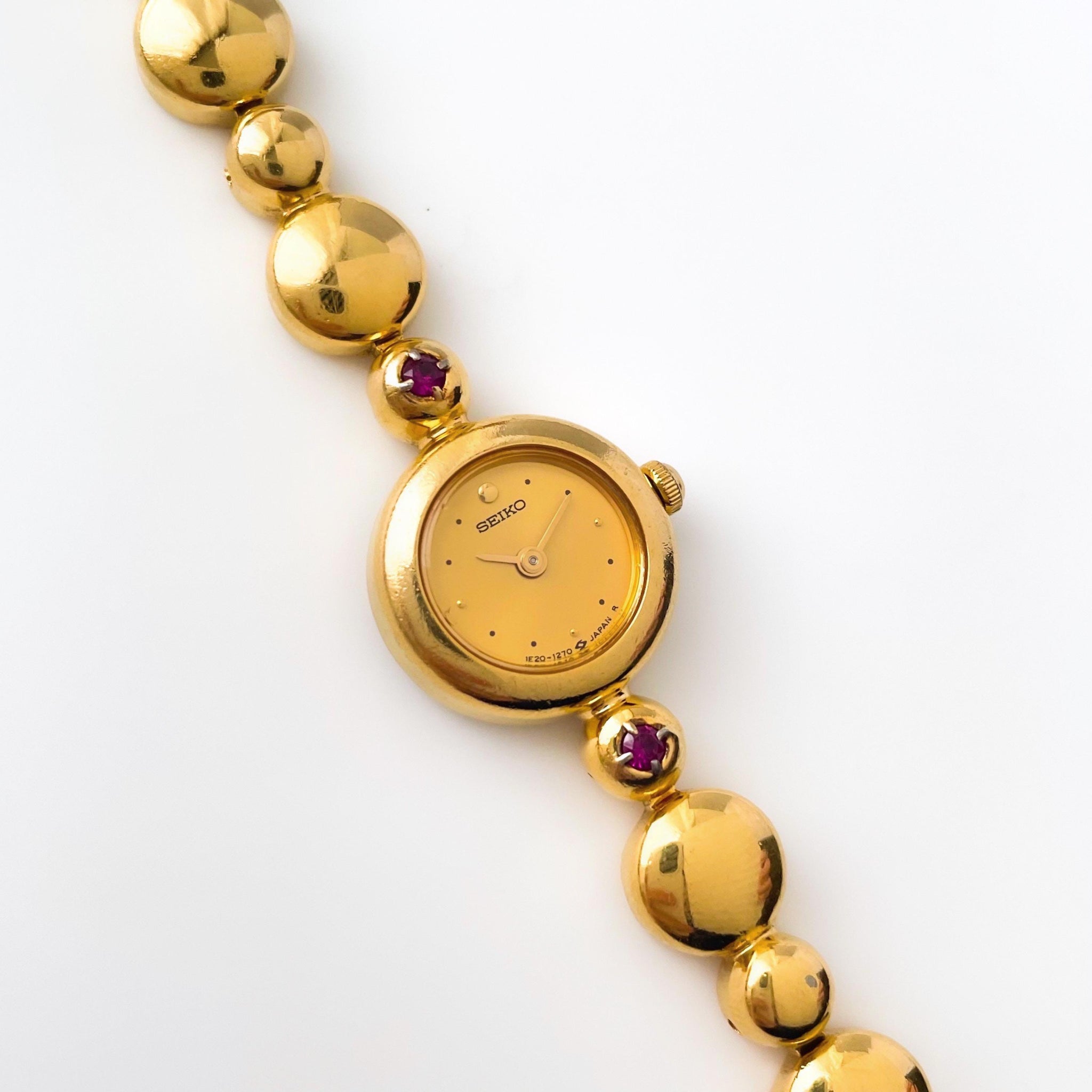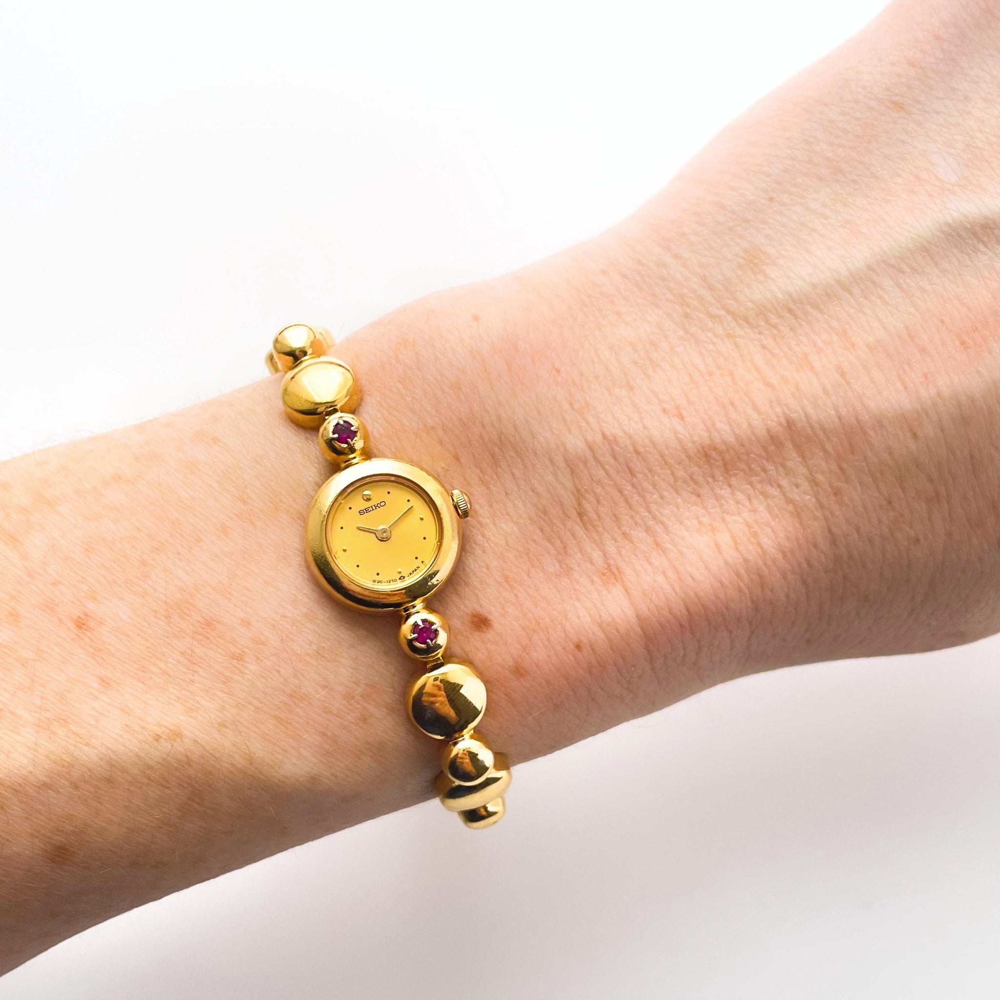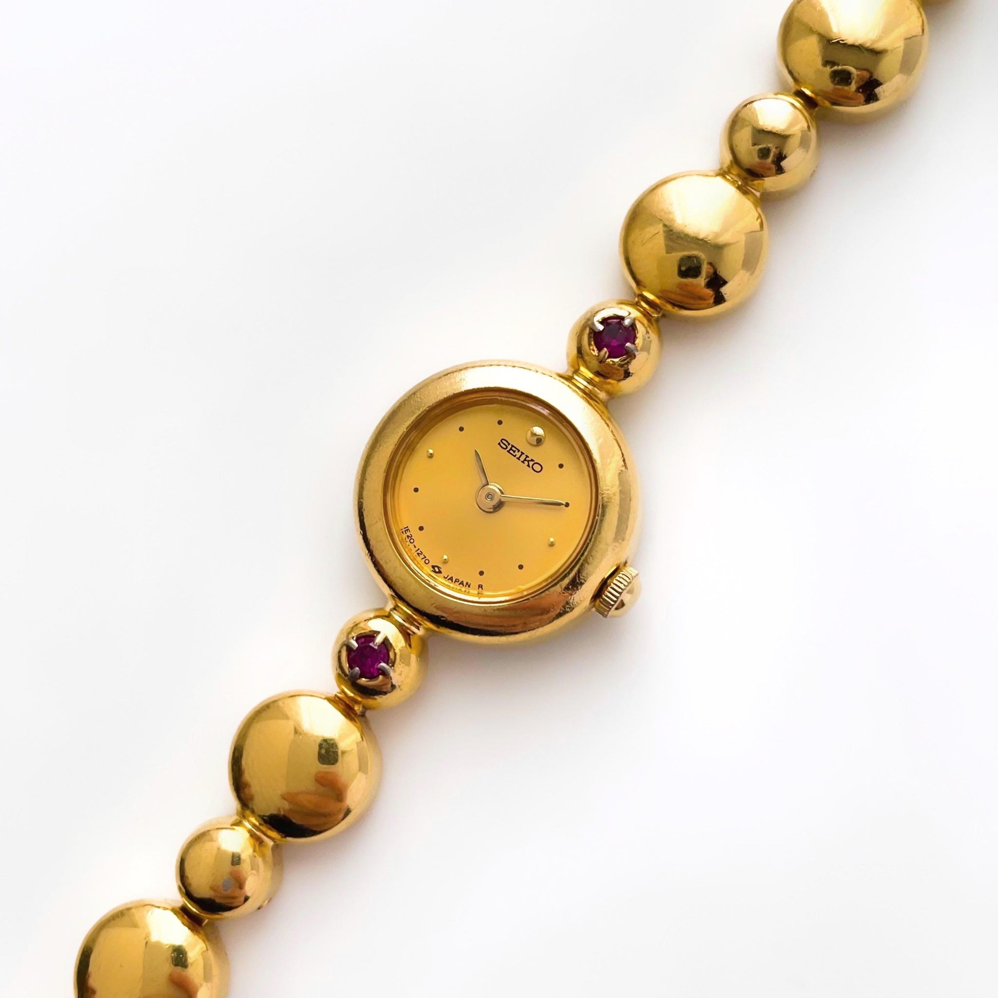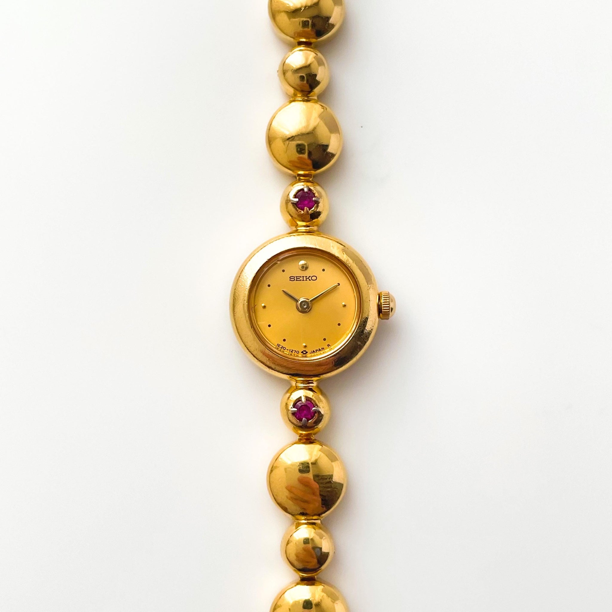 Very rare vintage ladies’ gold-plated Seiko jewellery watch, with tiny dial, intricate bracelet and 2 rubies around the dial. A truly gorgeous piece from the cult Japanese watchmaker.
