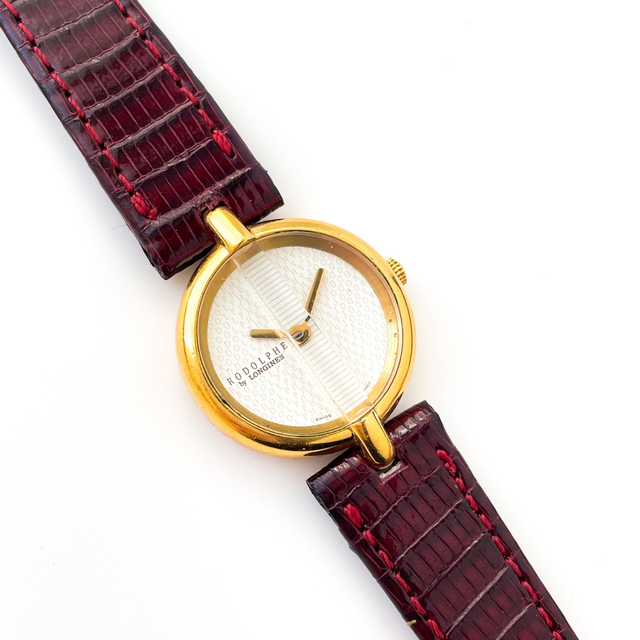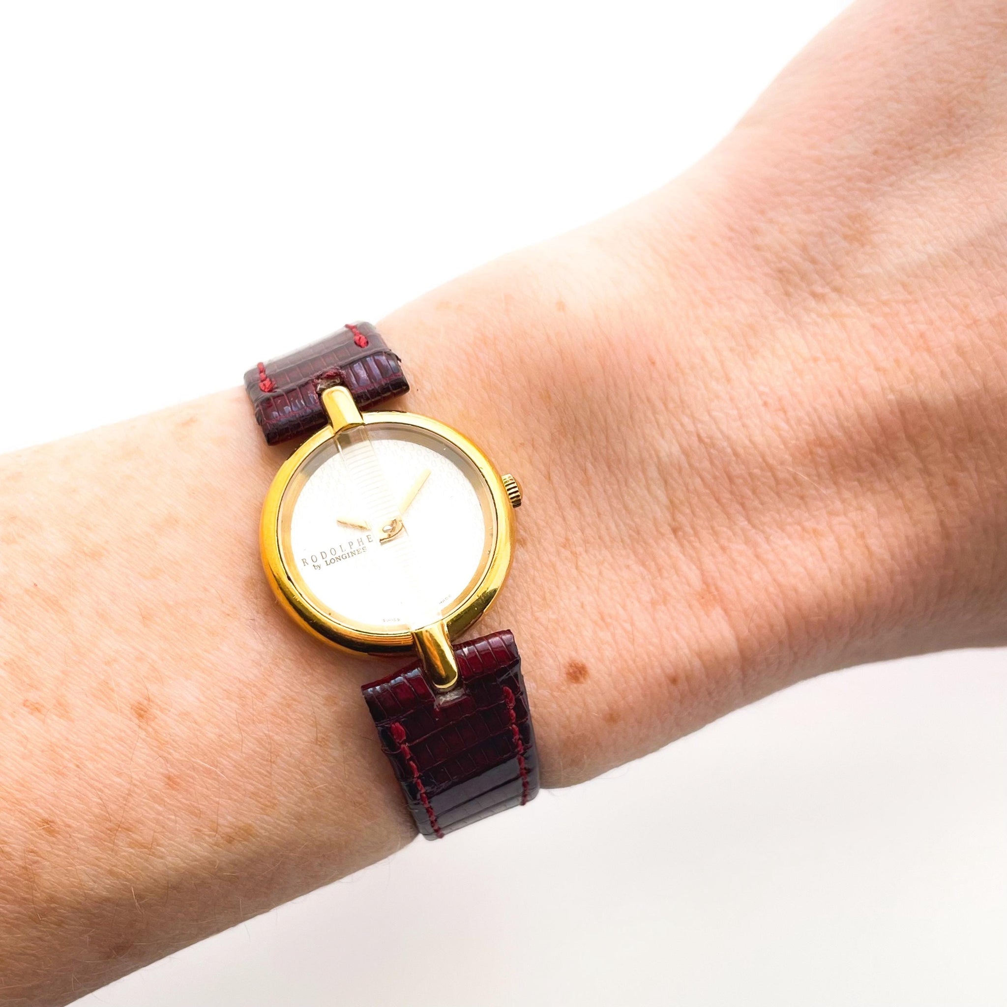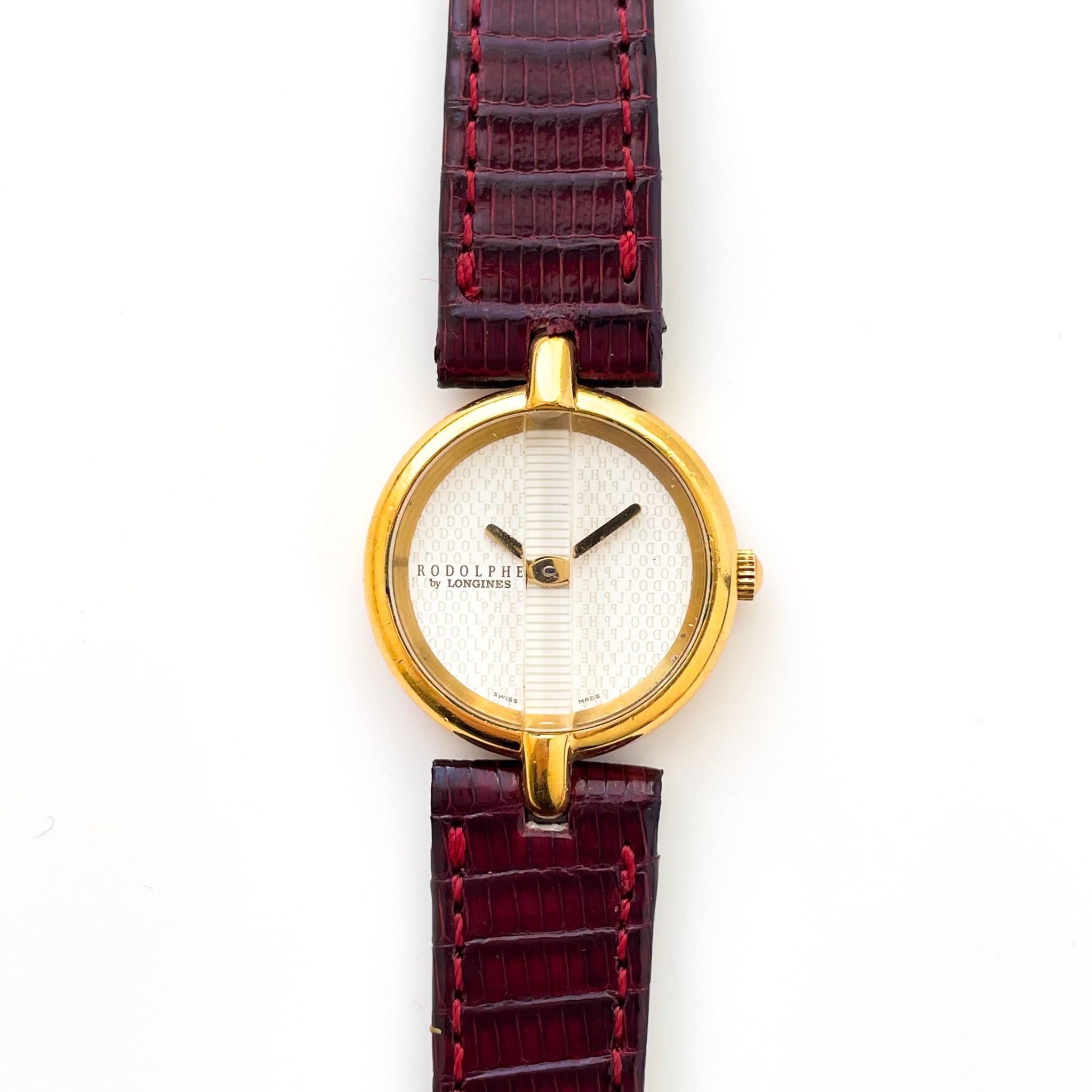 Rare vintage 1980s Rodolphe by Longines watch with gold-plated case, unique glass design and burgundy leather strap. A unique watch by the renowned Swiss watchmaker.