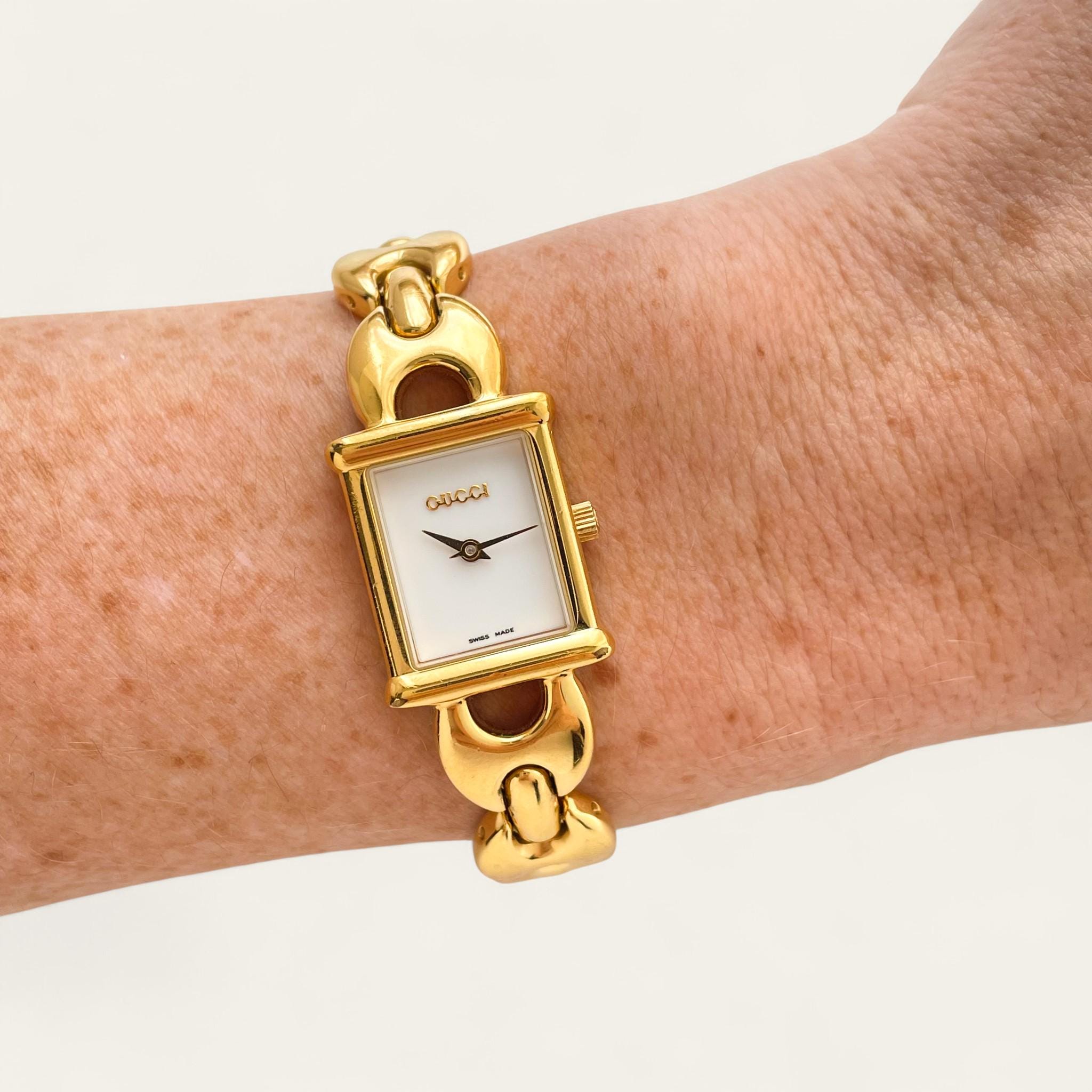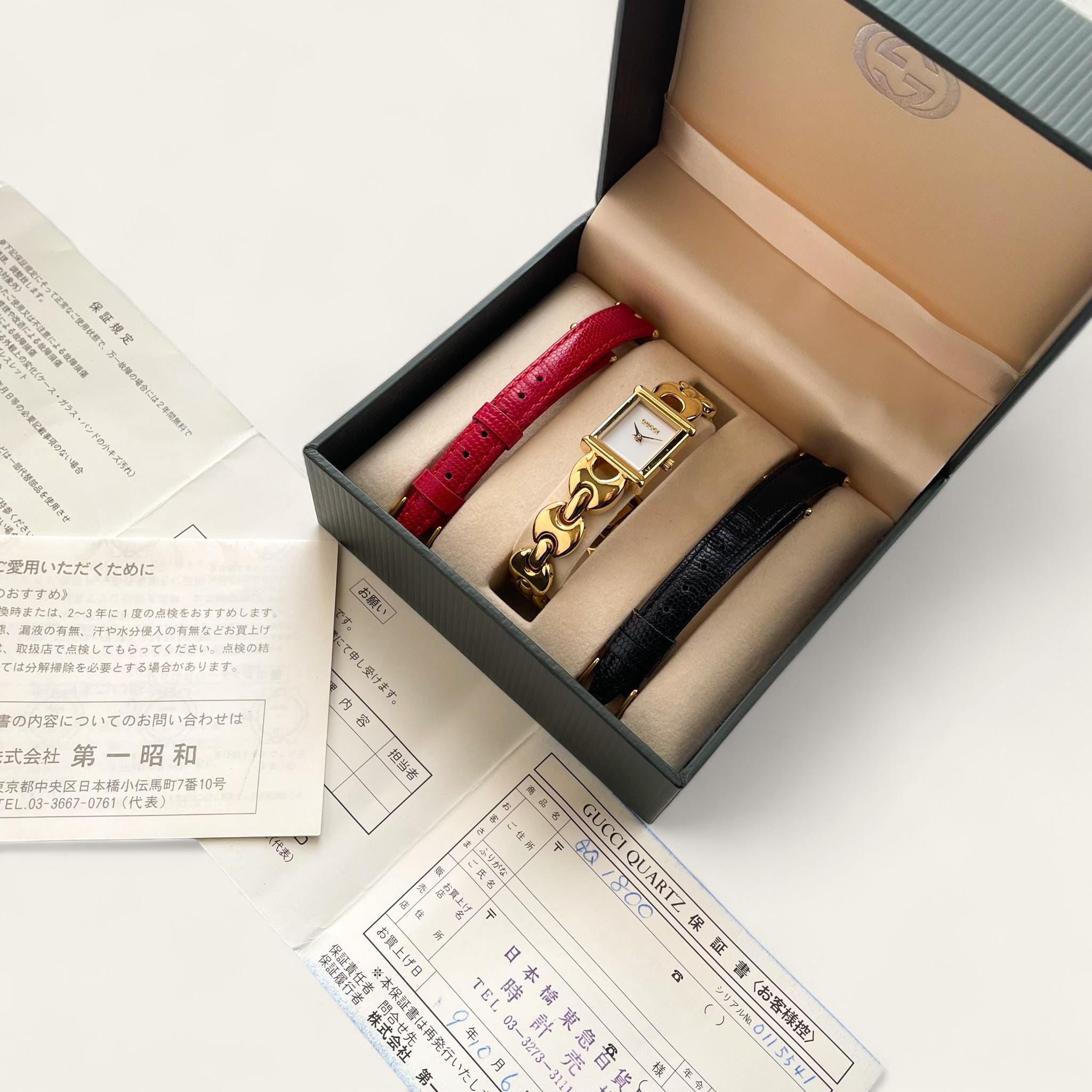 Iconic 90s ladies' watch, with thin gold-plated bracelet, white rectangular dial and 3 interchangeable straps to match your outfits. Comes with the original box and papers. Gucci logo engraved on the crown and clasp. Overall a very feminine, dainty and stylish piece from the Italian designer.