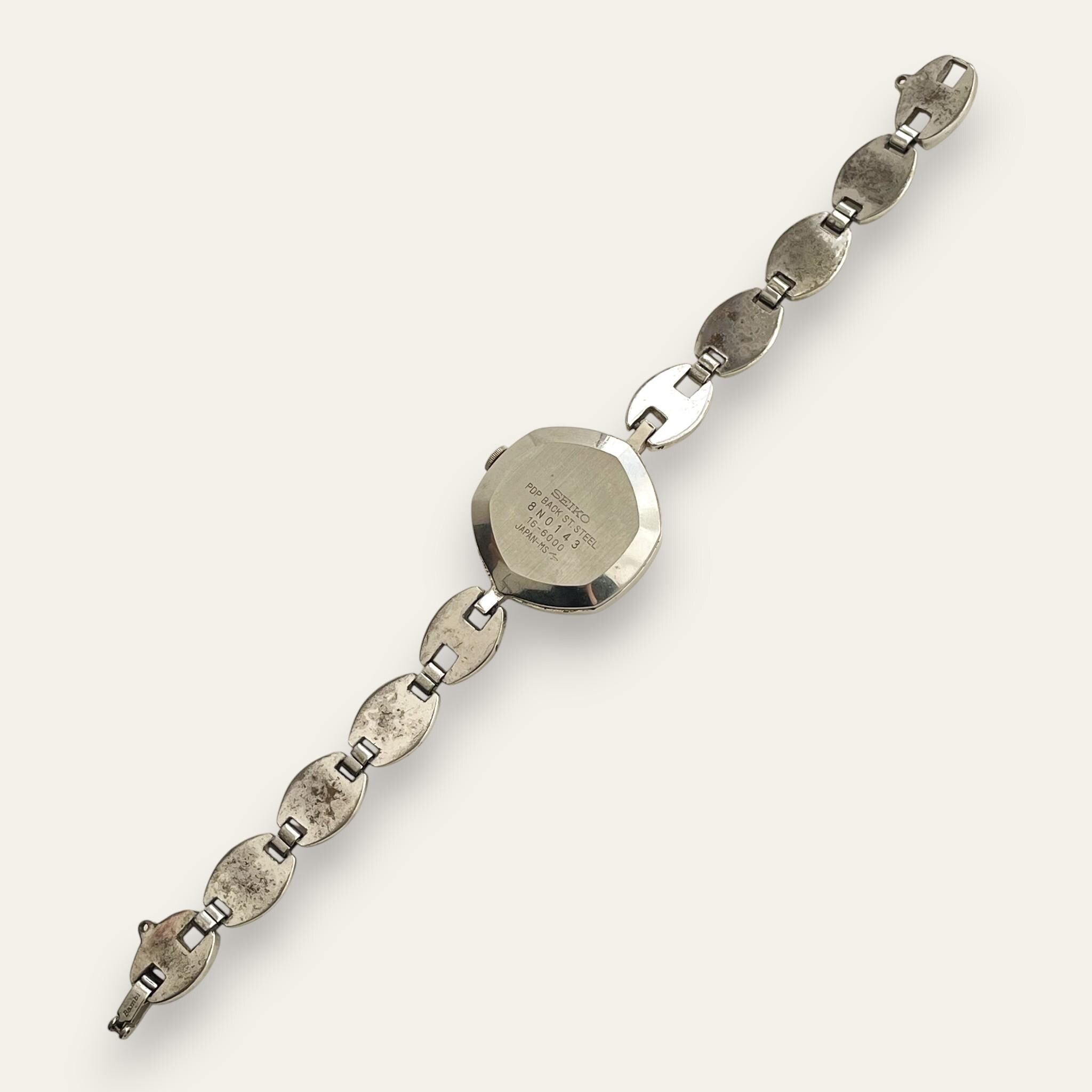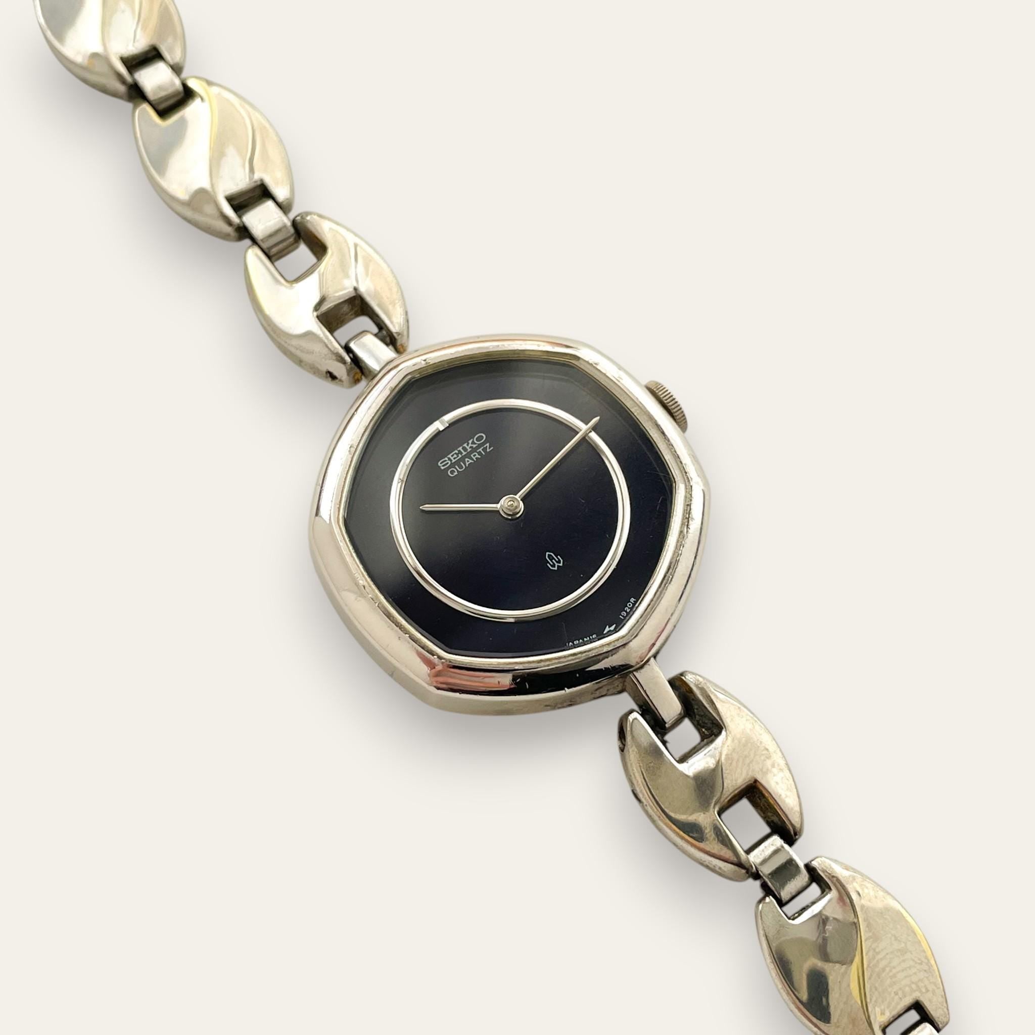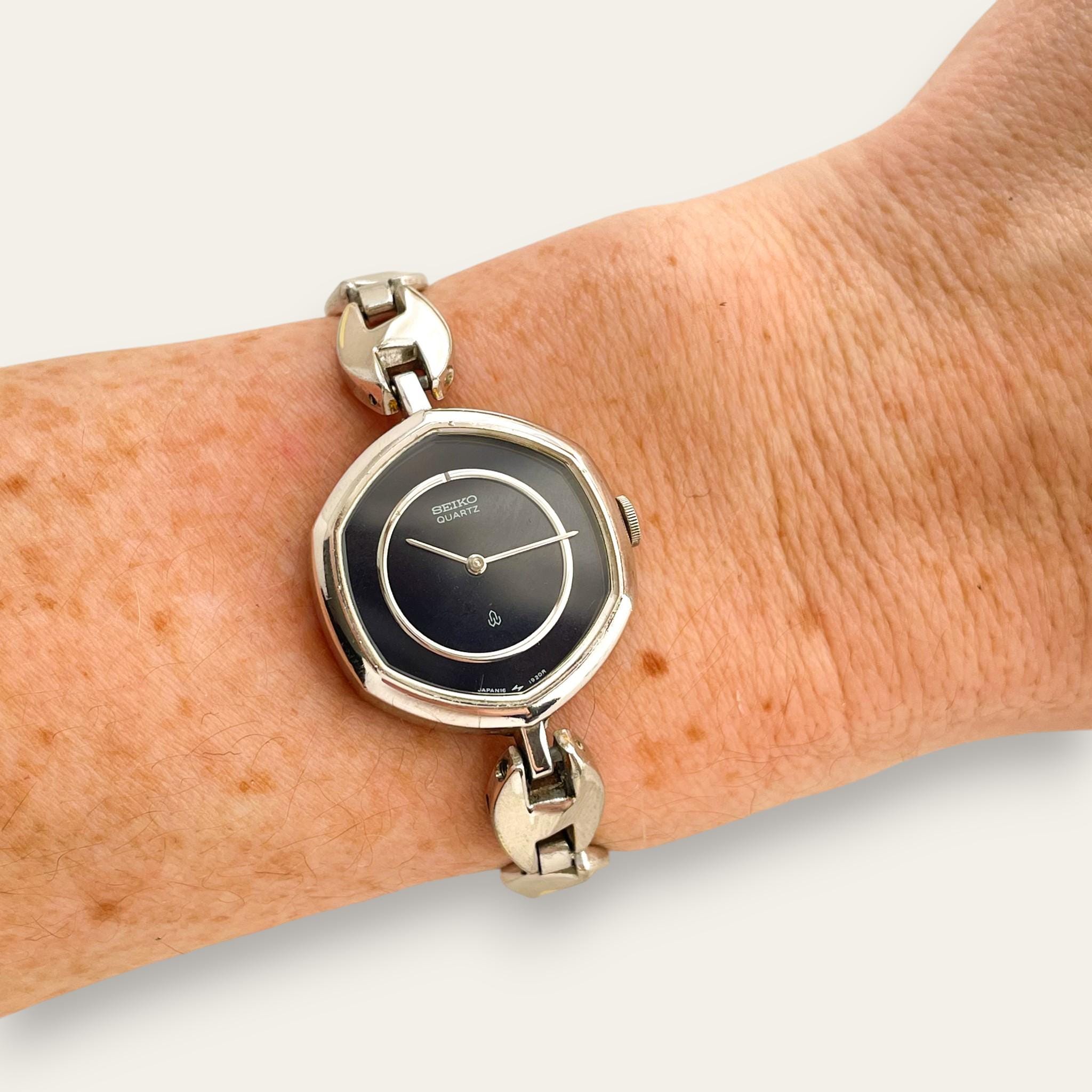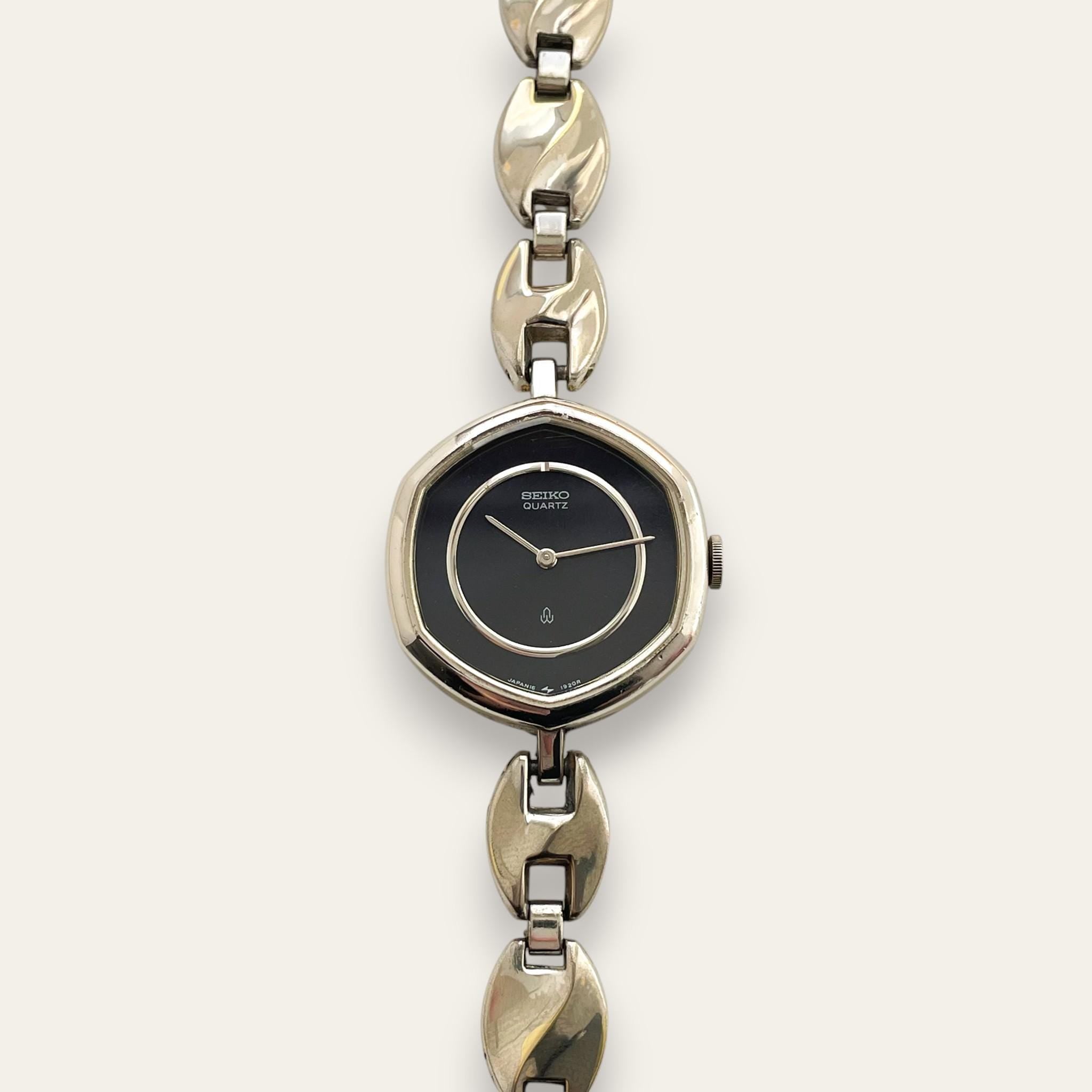 Vintage ladies' Seiko silver-tone watch with dark blue dial and metal bracelet. An elegant and dressy watch from the Japanese watchmaker.