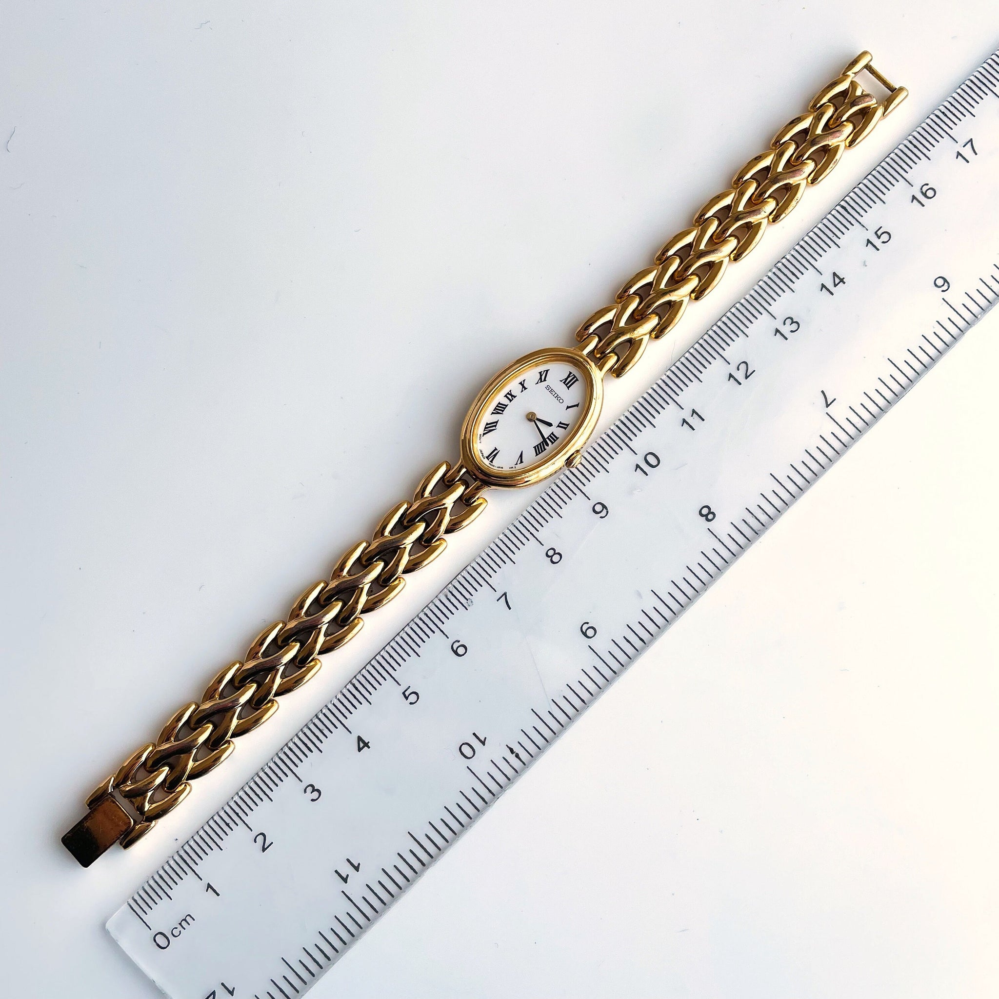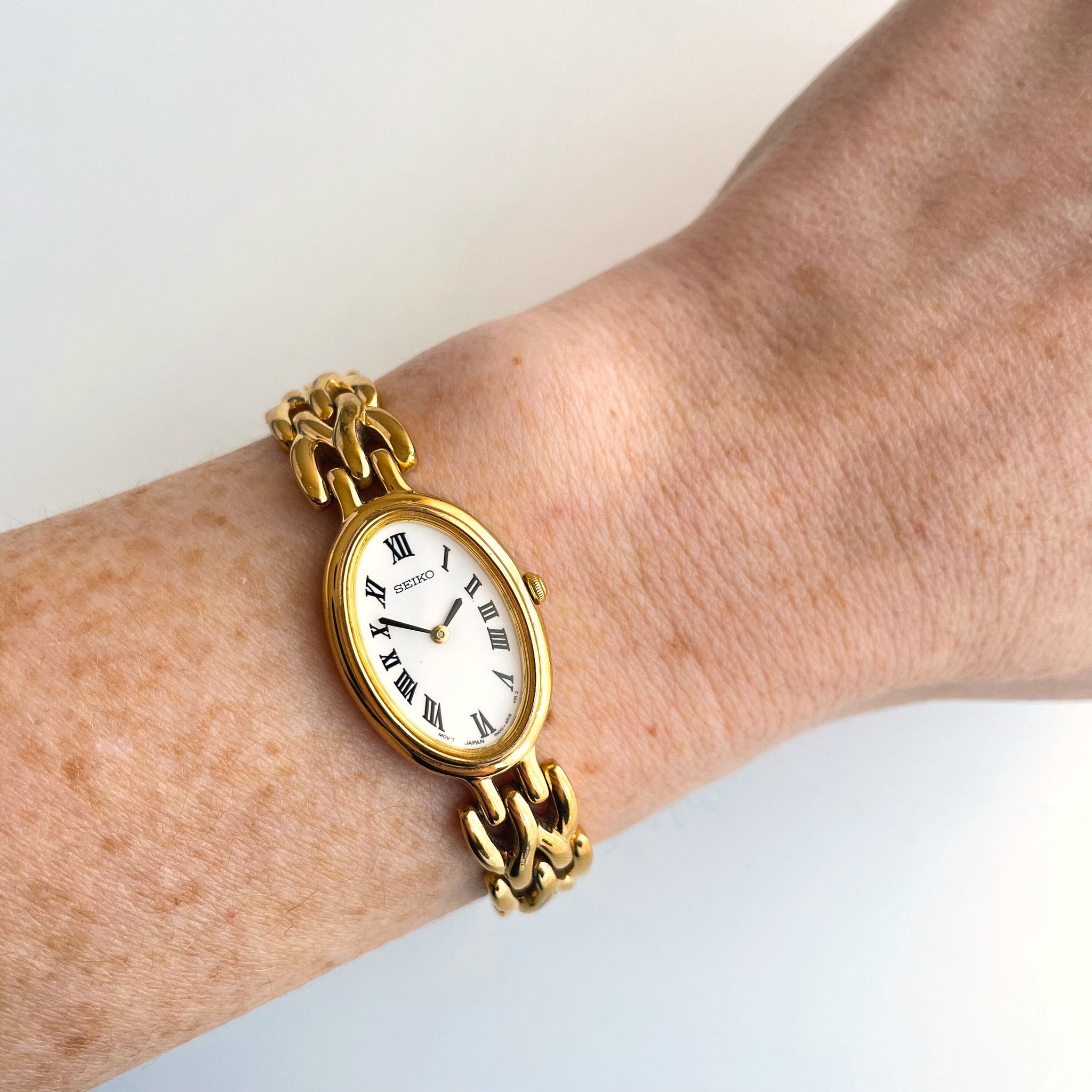 Dainty 1990s ladies' Seiko gold-plated watch, with white oval dial and jewellery clasp. An elegant vintage piece from the cult Japanese watchmaker.
