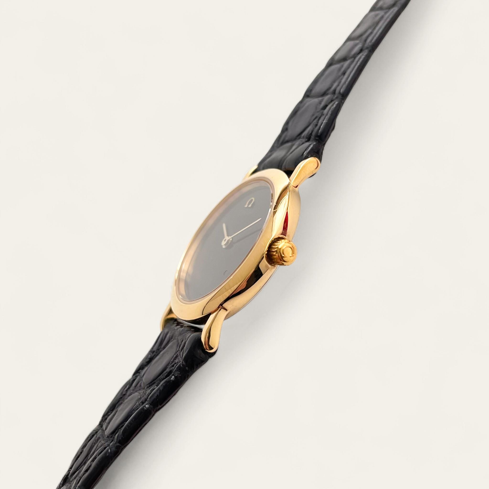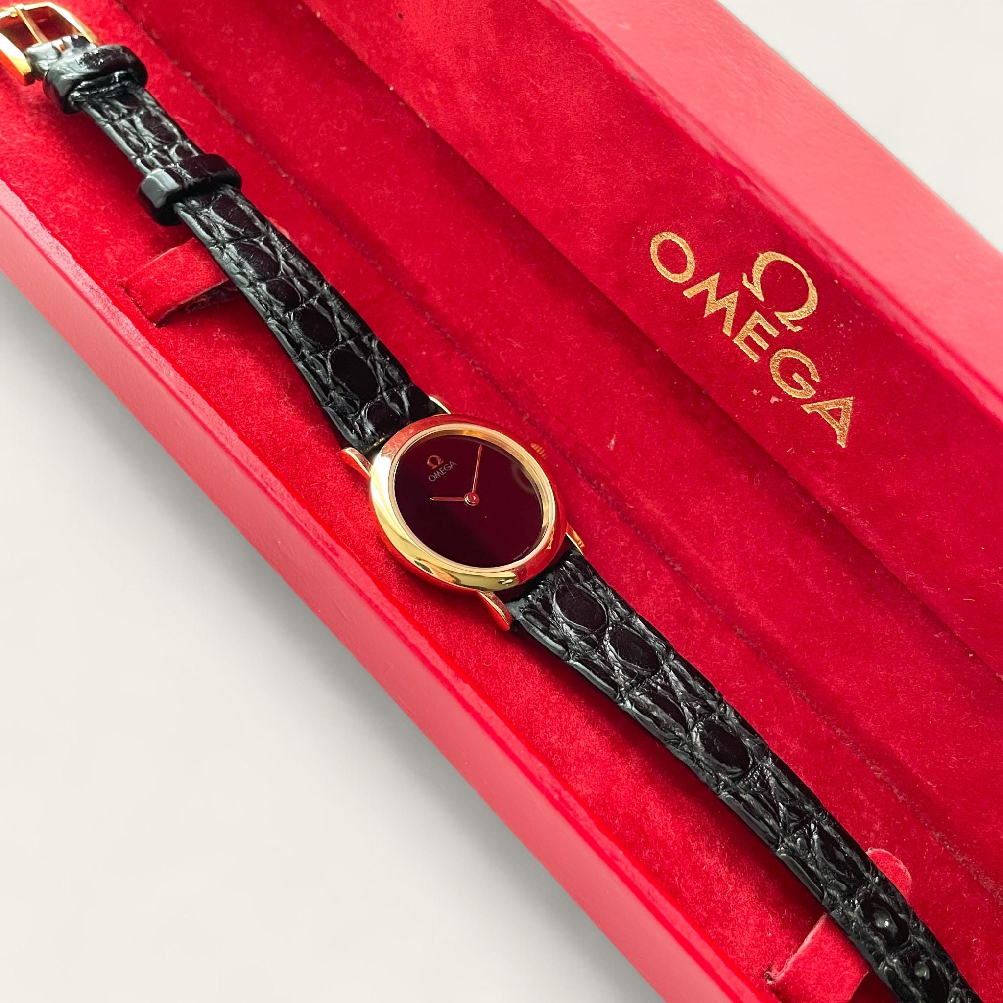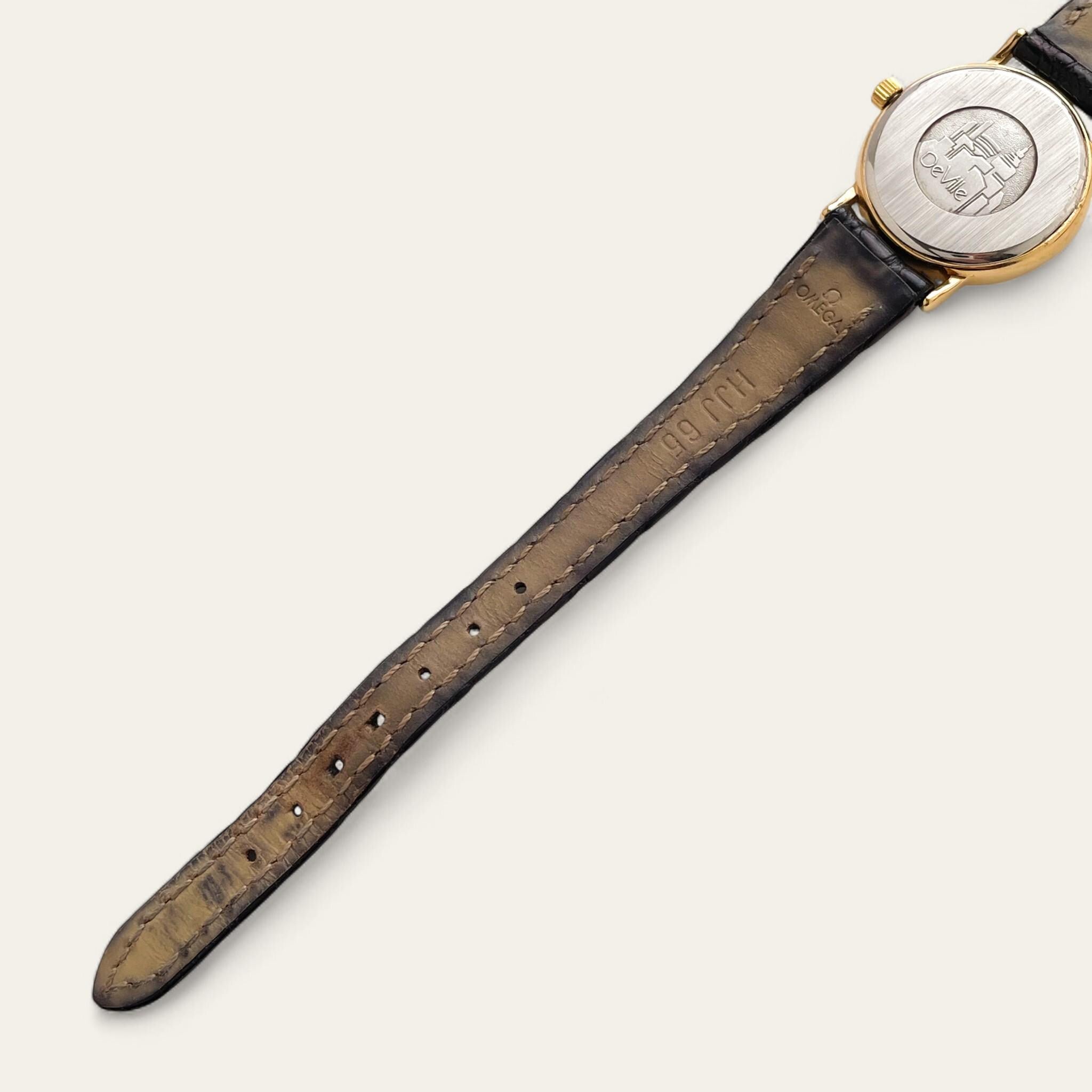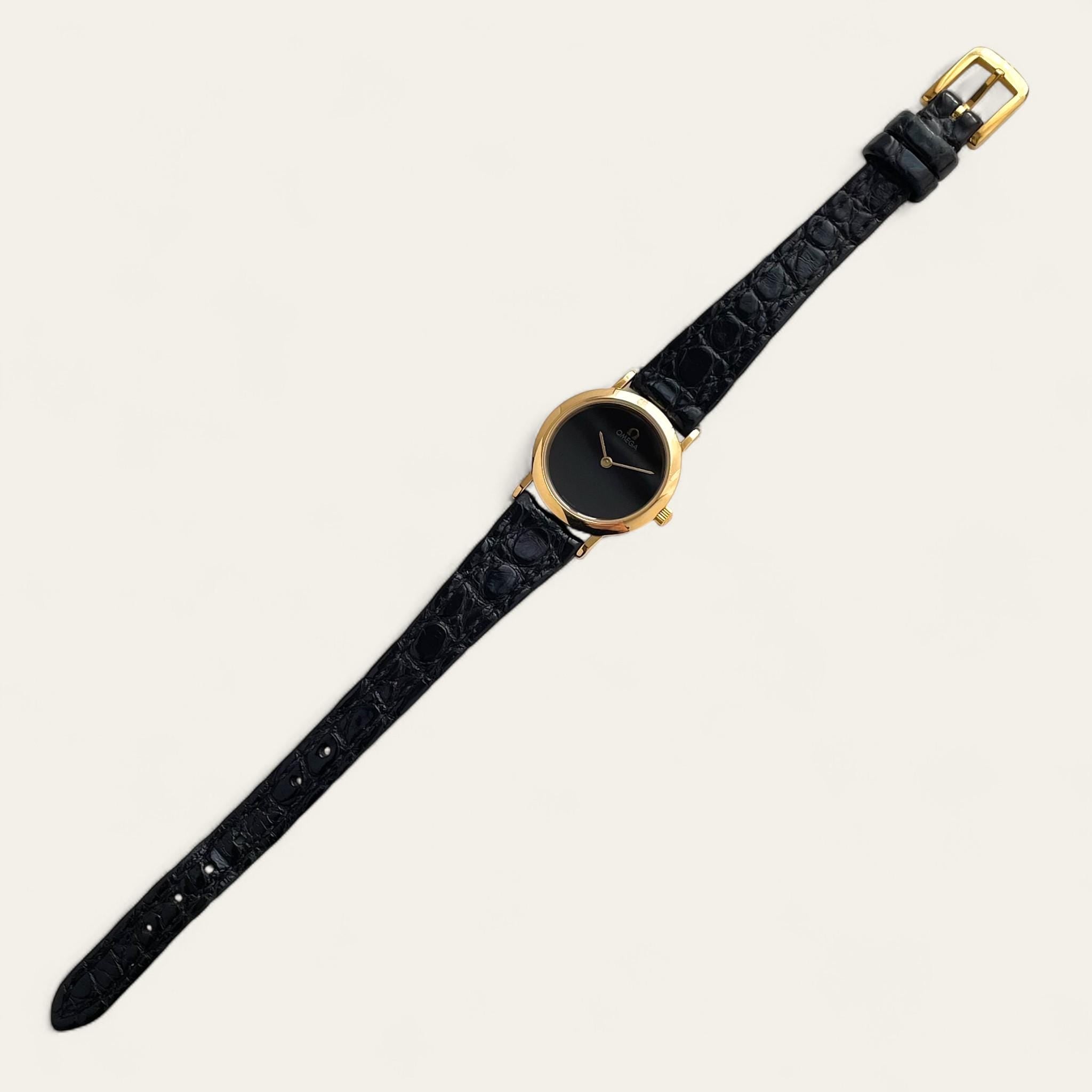 Tiny 1980s Omega De Ville ladies' watch with black leather strap, 20 microns gold-plated case and minimalist black dial. A classic and elegant model from the prestigious Swiss watchmaker.