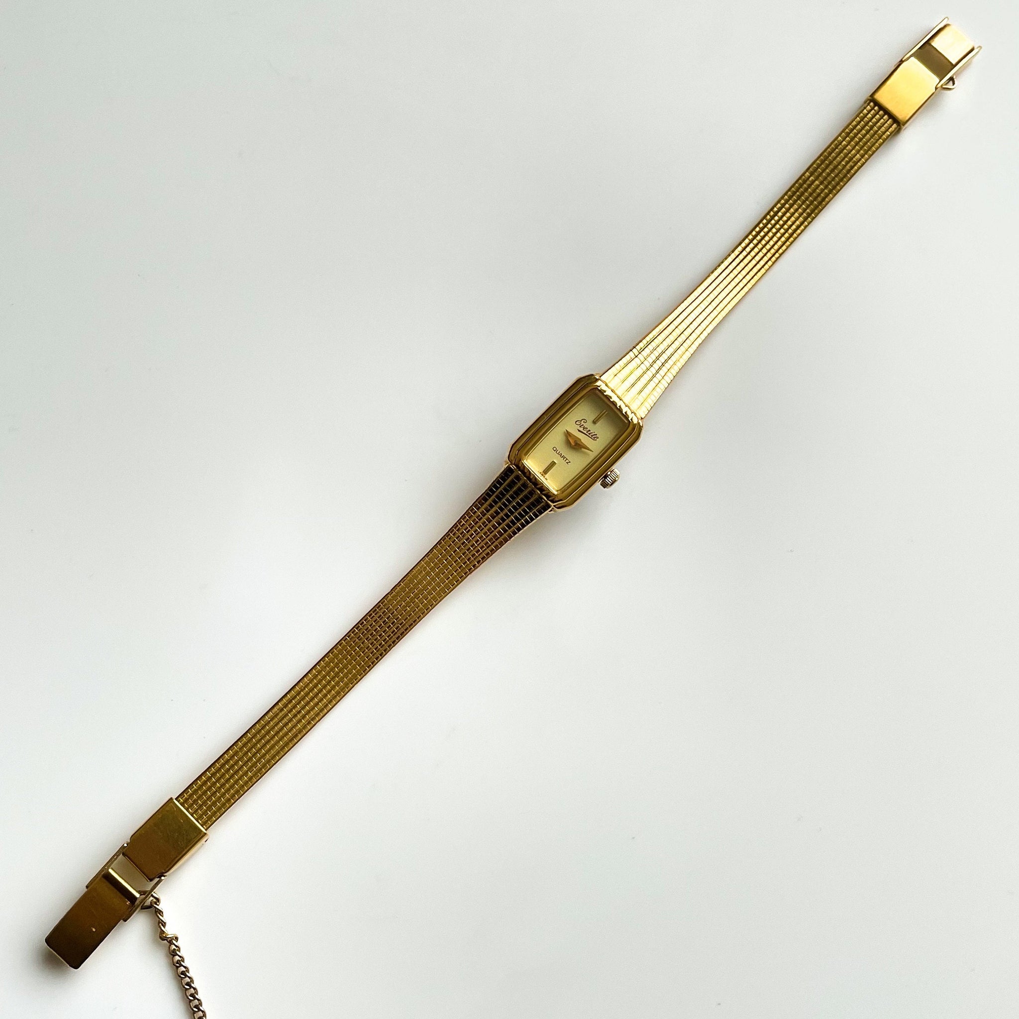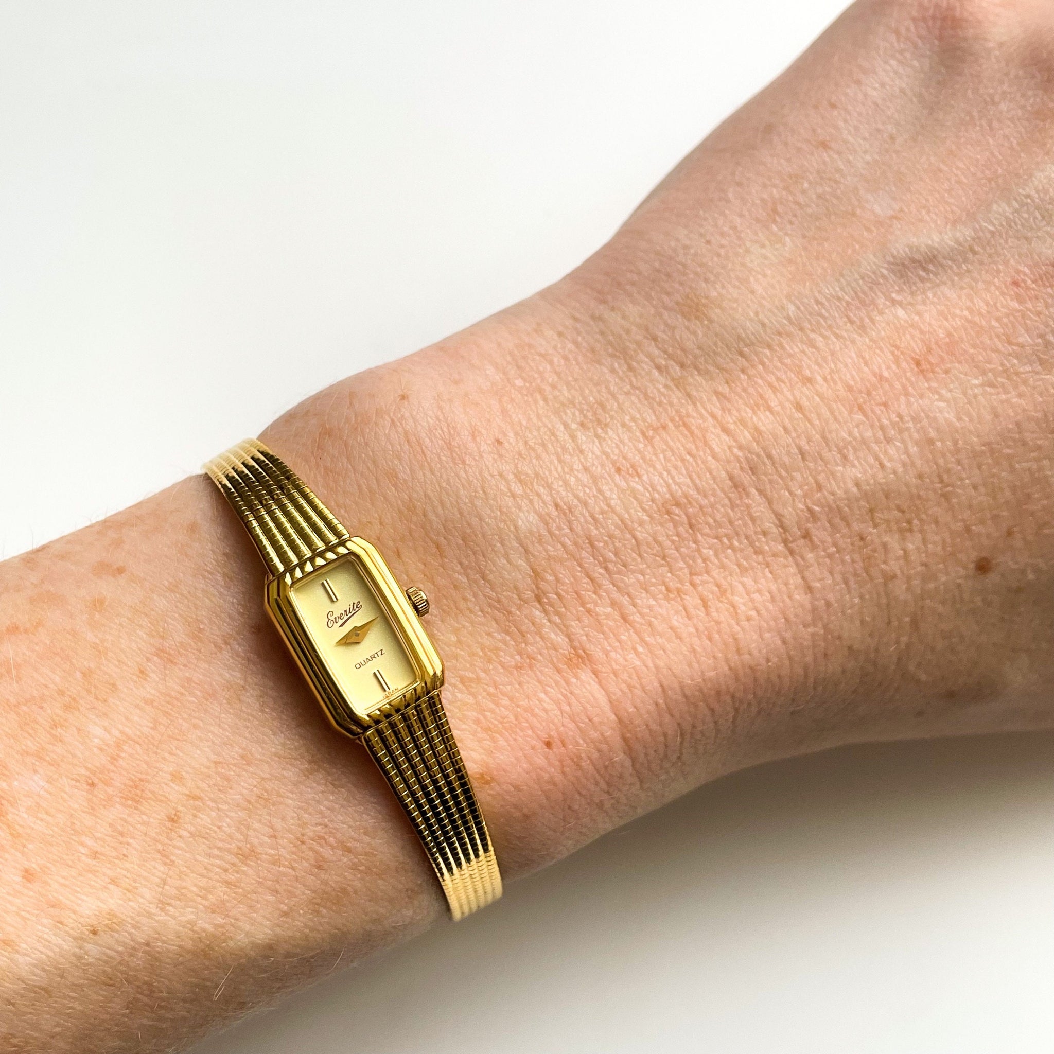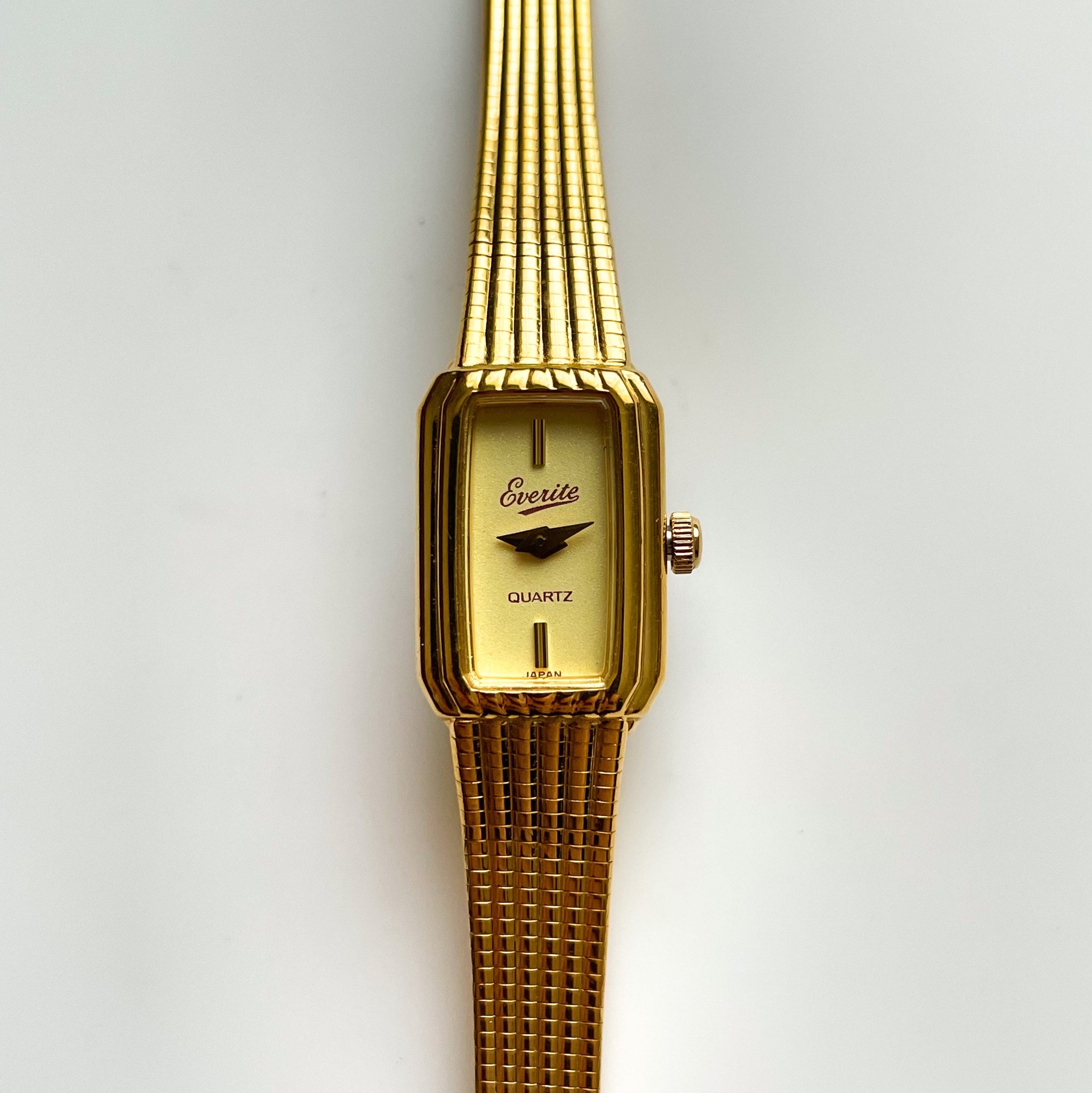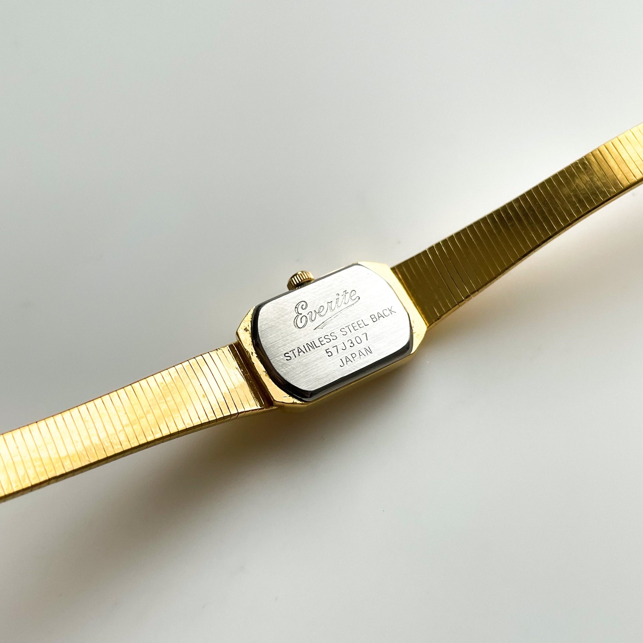 Very tiny gold-tone Everite ladies' watch, with very thin bracelet, rectangular dial and small safety chain. An exceptionally small, thin and dainty watch.