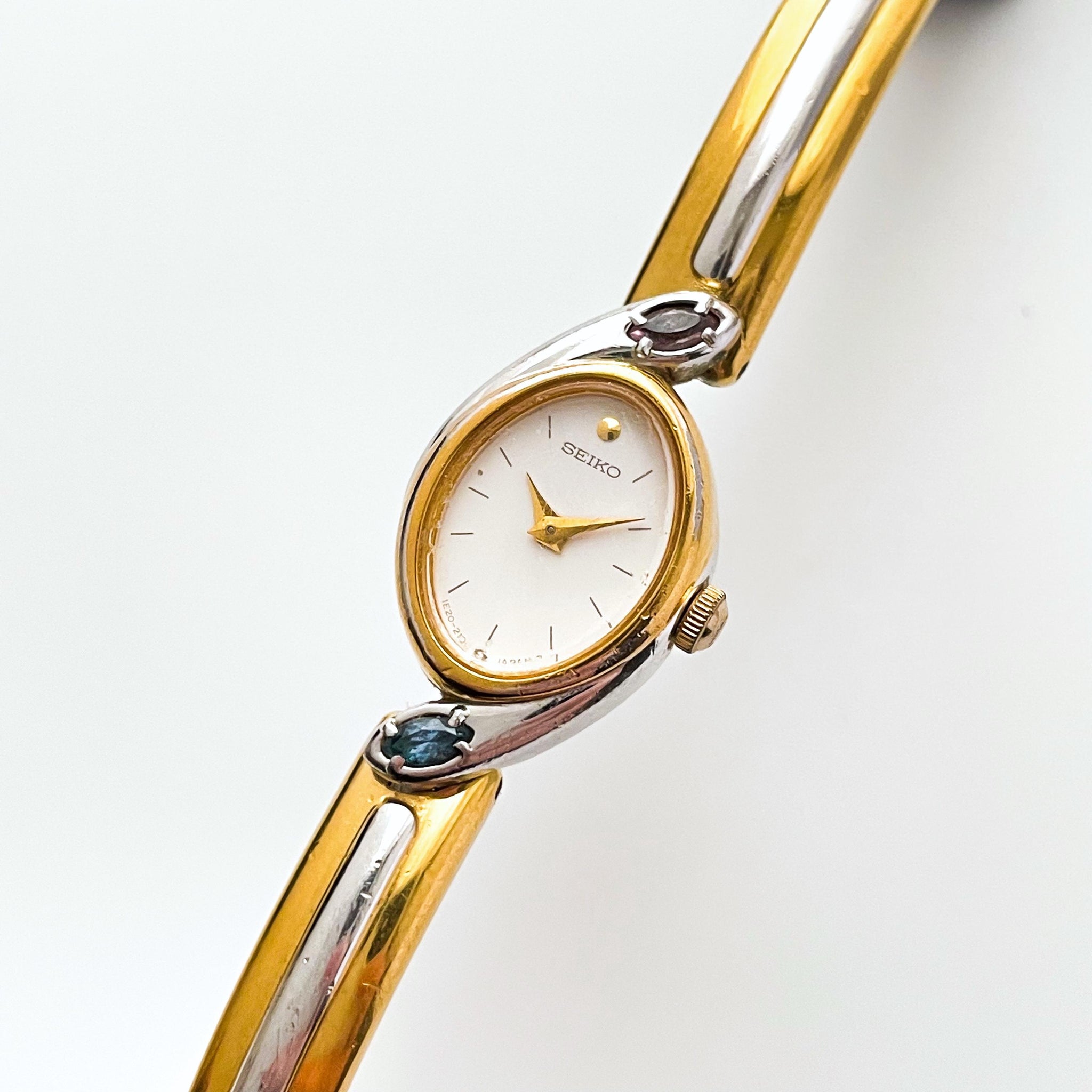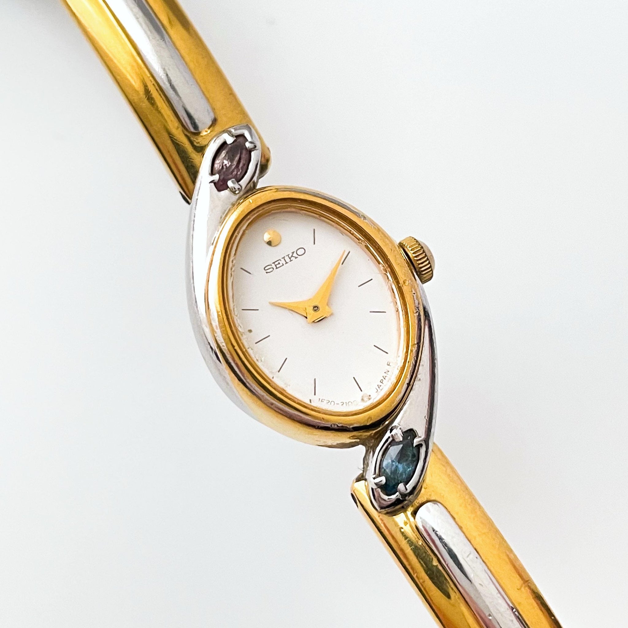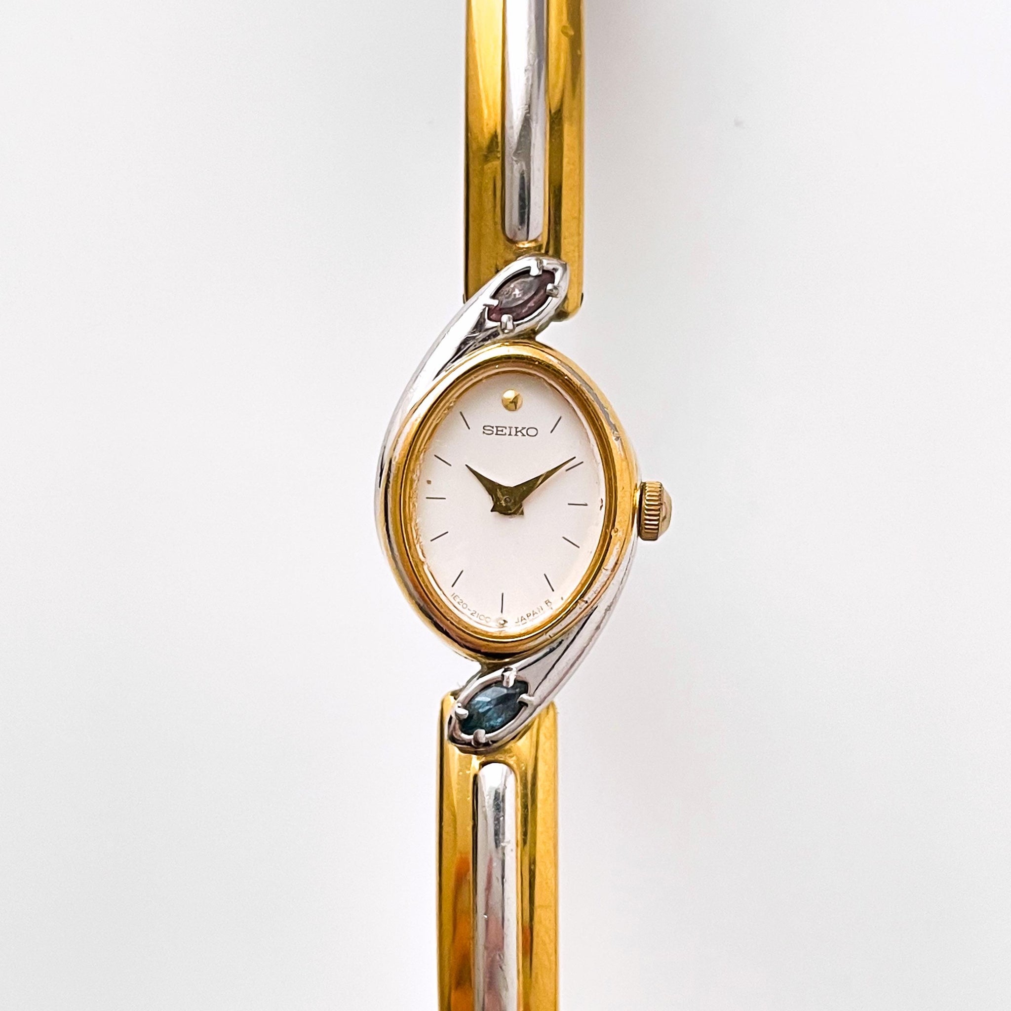 Very rare 1990s vintage ladies’ two-tone Seiko watch, with white oval dial, two colourful gems (light blue and purple) above and below the dial, and articulated bangle bracelet. A dainty and dressy jewellery piece from the cult Japanese watchmaker.