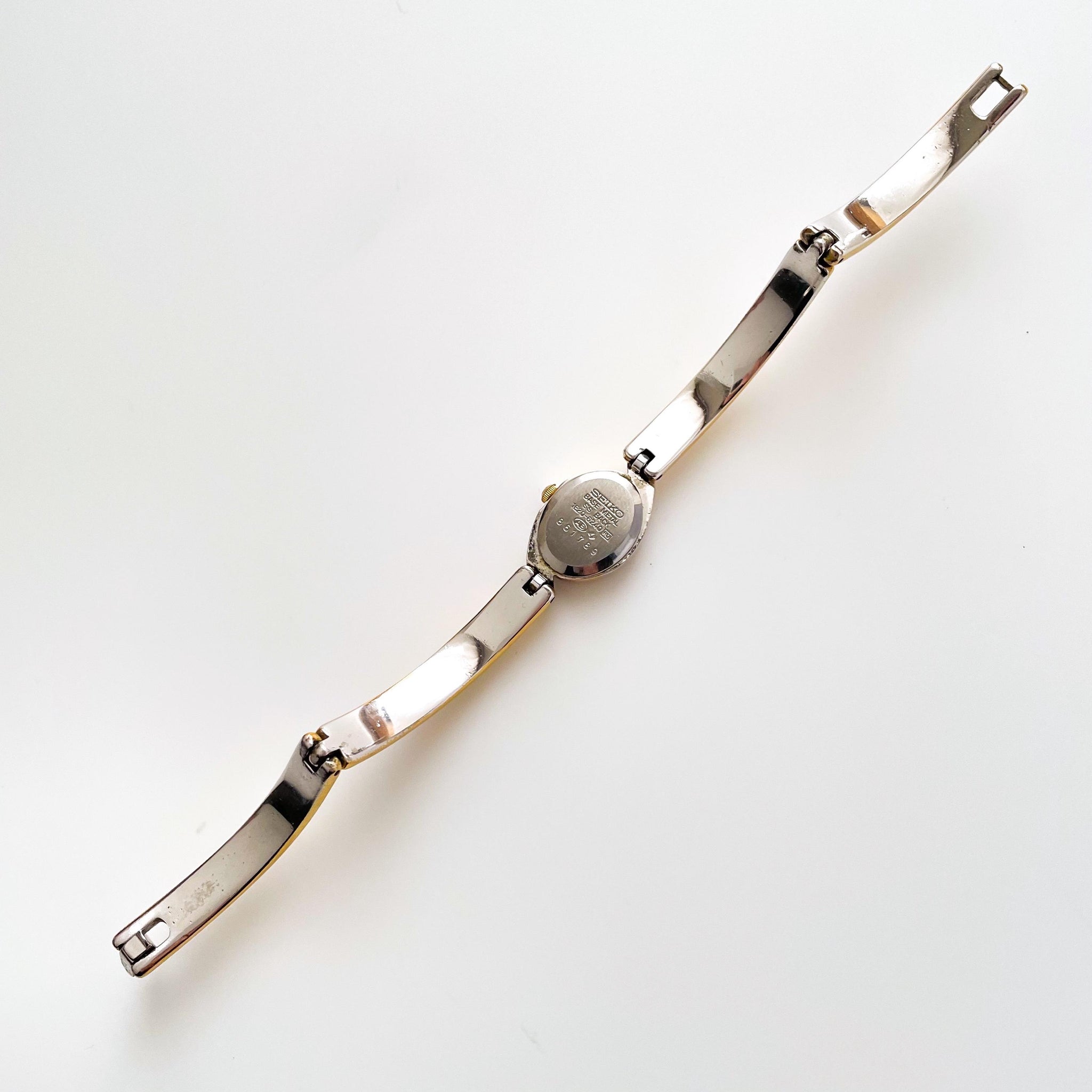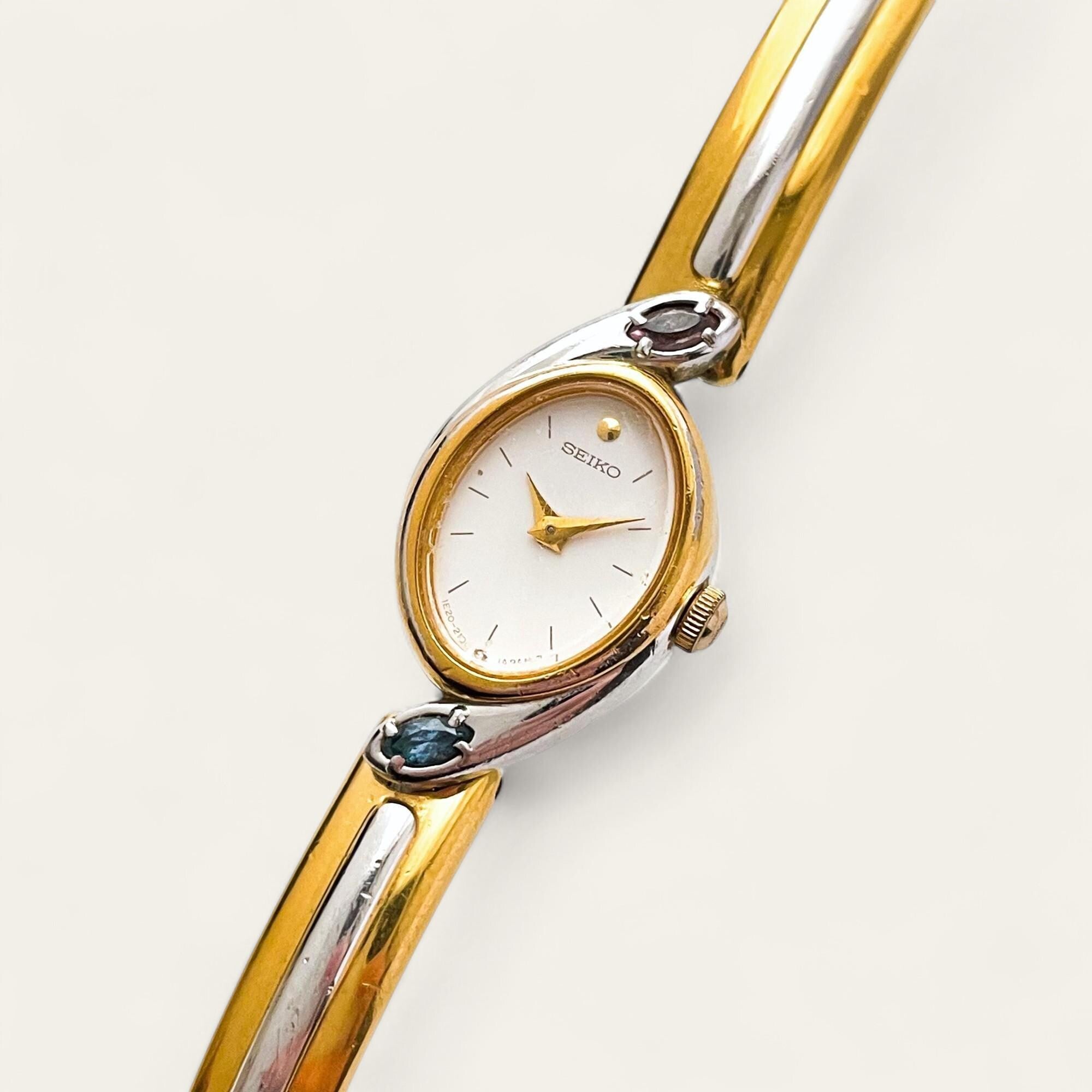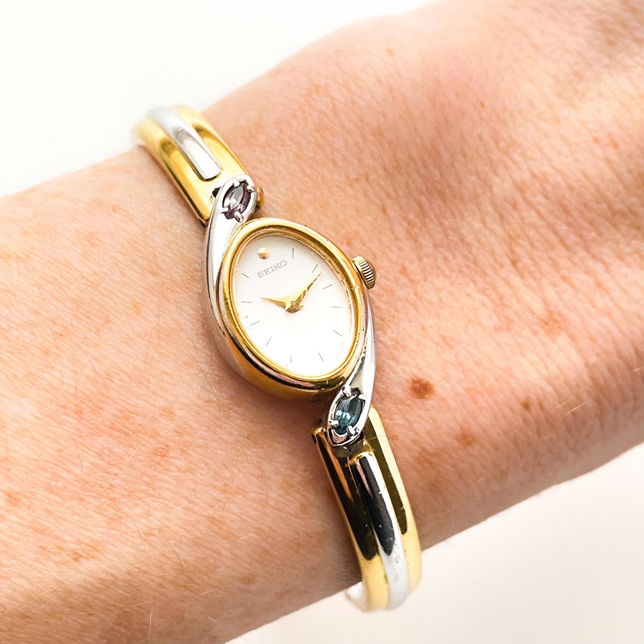Very rare 1990s vintage ladies’ two-tone Seiko watch, with white oval dial, two colourful gems (light blue and purple) above and below the dial, and articulated bangle bracelet. A dainty and dressy jewellery piece from the cult Japanese watchmaker.