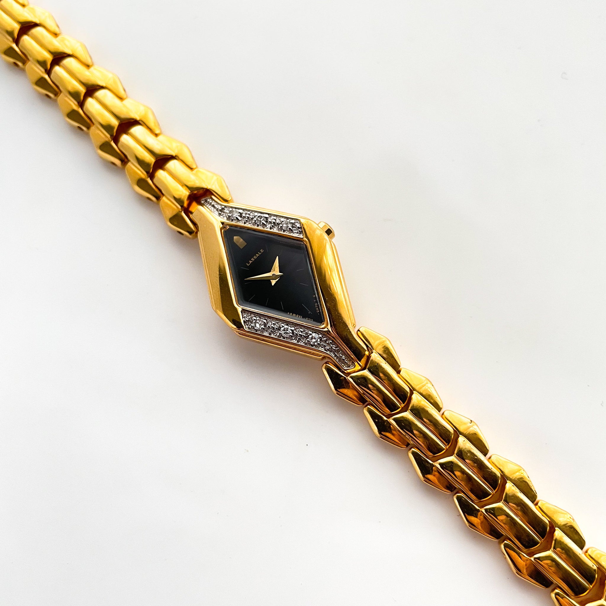 Very rare 1995 vintage ladies’ gold-plated Lassale (Seiko's high end luxury brand) watch, with asymmetrical case, black dial and diamond-set bezel. A truly incredible piece from the cult Japanese watchmaker.