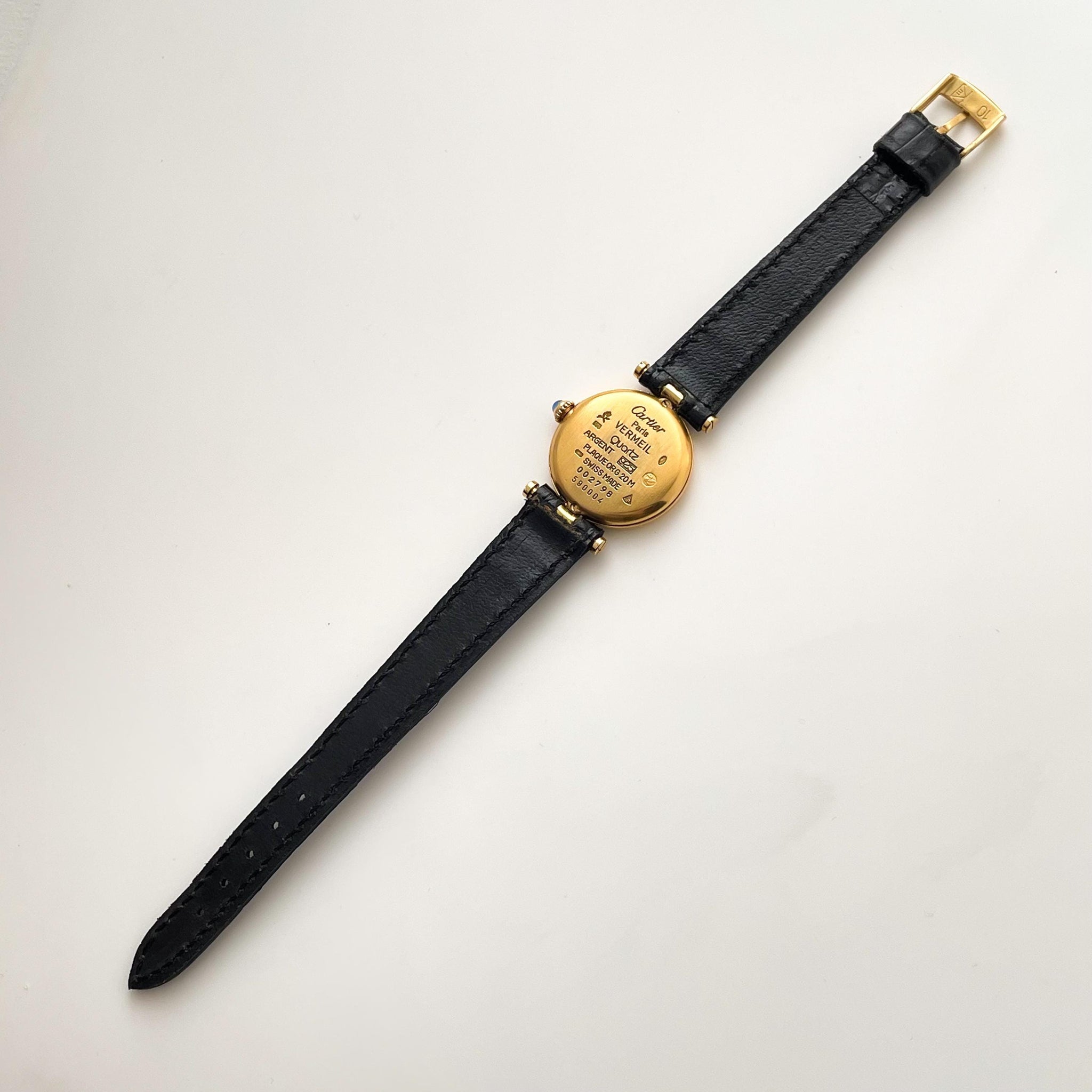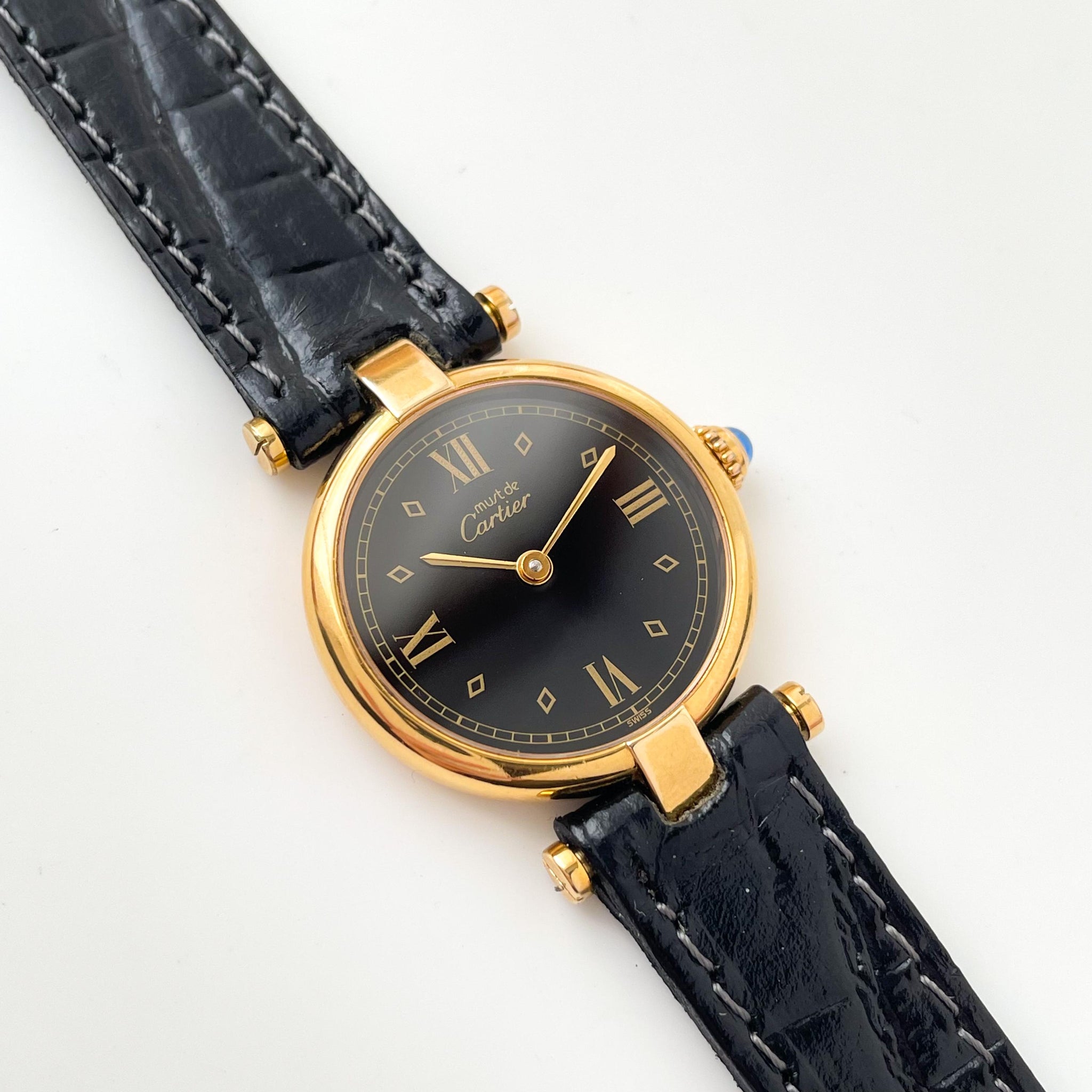 Vintage ladies' Cartier Must Vendôme Vermeil, with black dial, leather strap and classic blue cabochon crown. 20 microns gold-plated 925 silver. A timeless piece from the French luxury brand.