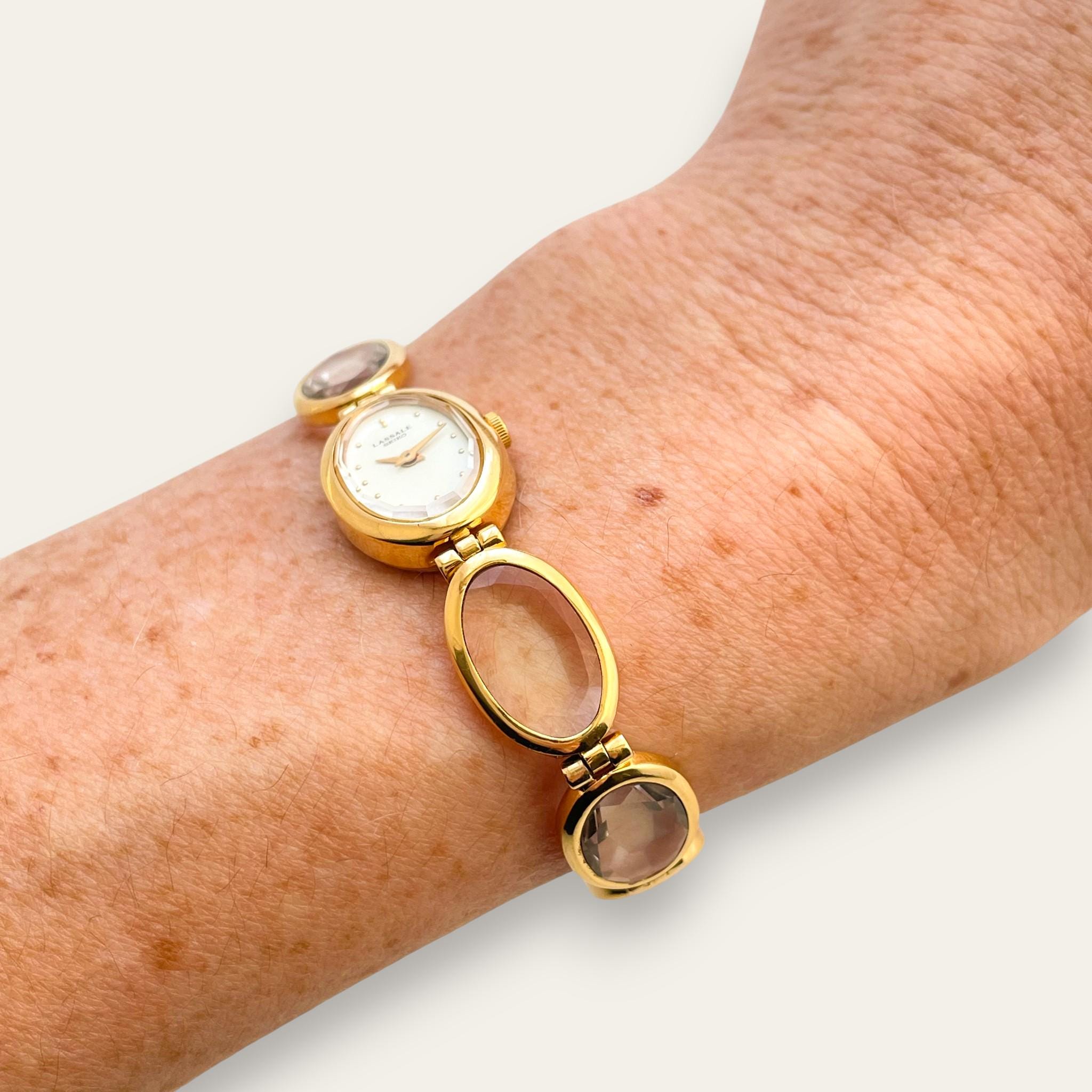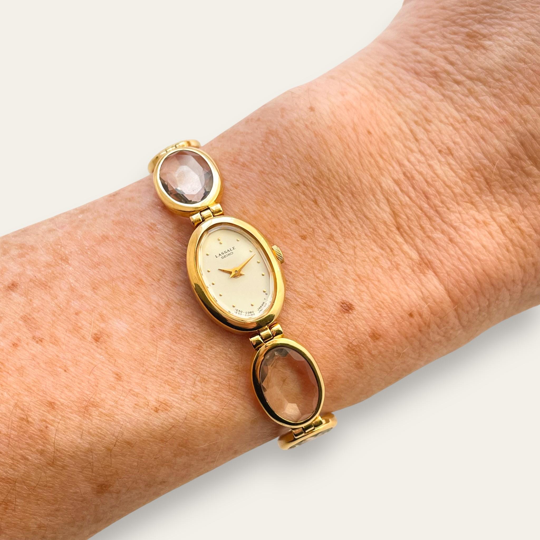 Very rare 1980s ladies' Lassale Seiko gold-plated watch, with tiny oval dial and sparkly glass bracelet. A unique vintage piece from the cult Japanese watchmaker.
