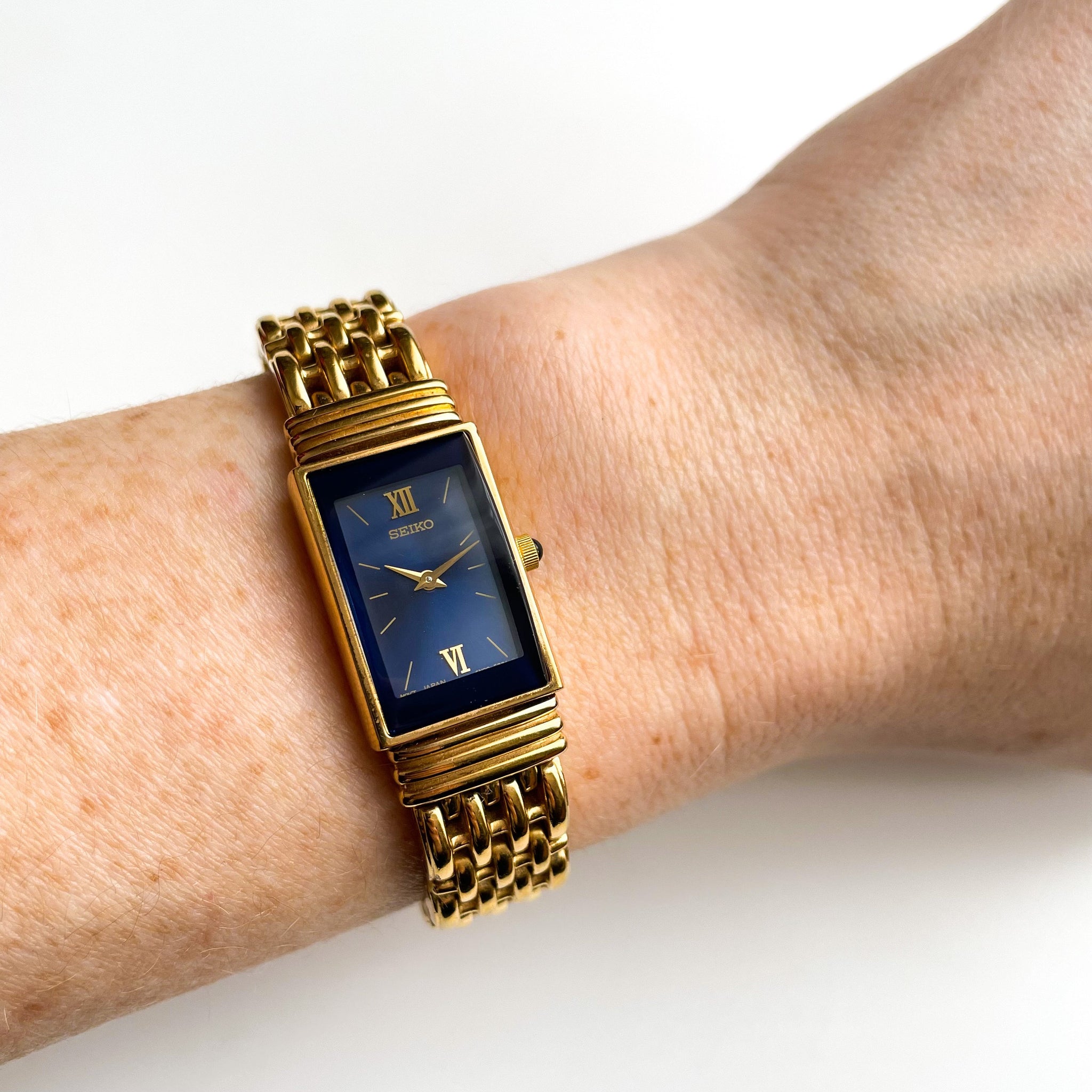Vintage 1990 ladies' Seiko gold-plated watch, with rectangular navy dial and jewellery clasp. A unique and elegant vintage piece from the cult Japanese watchmaker.