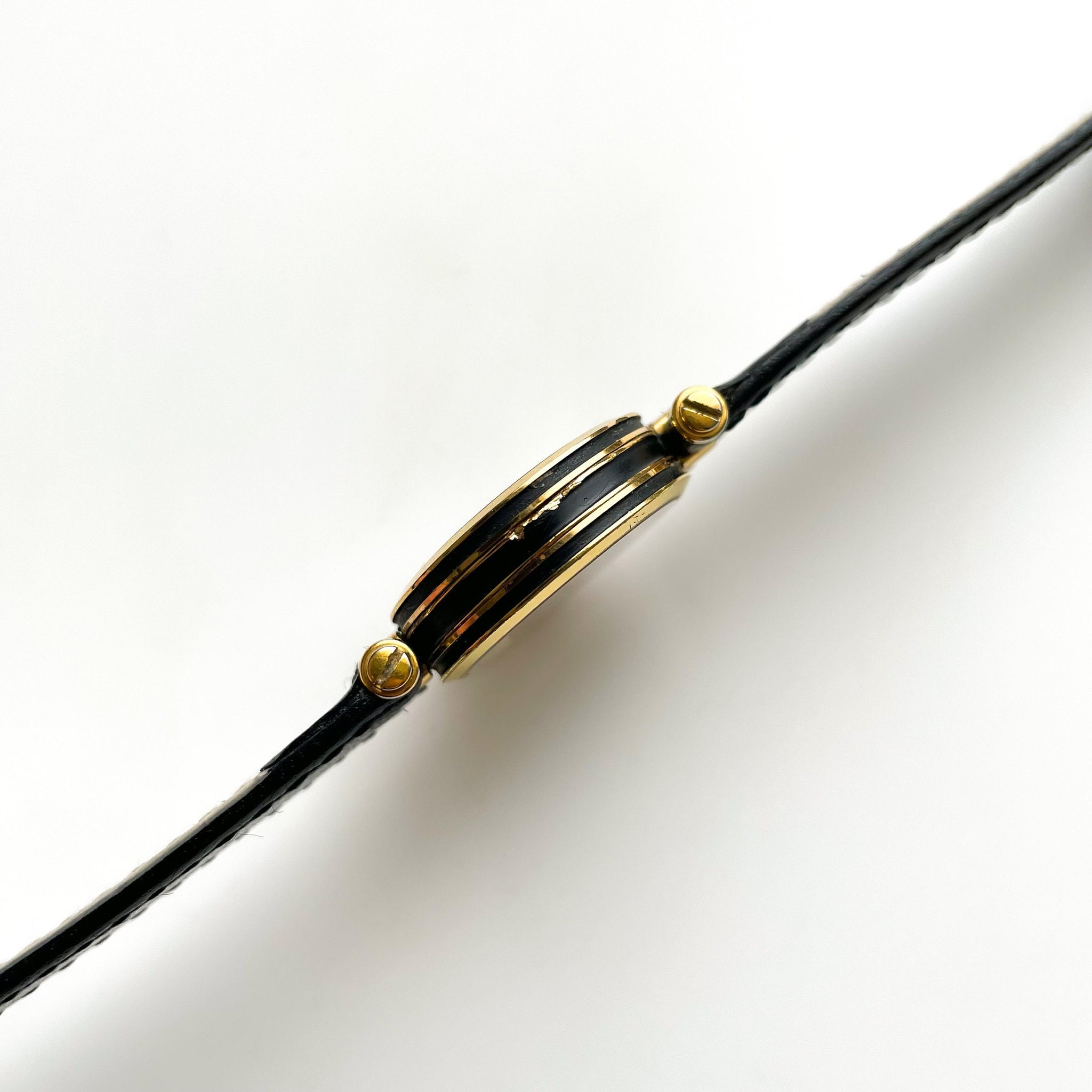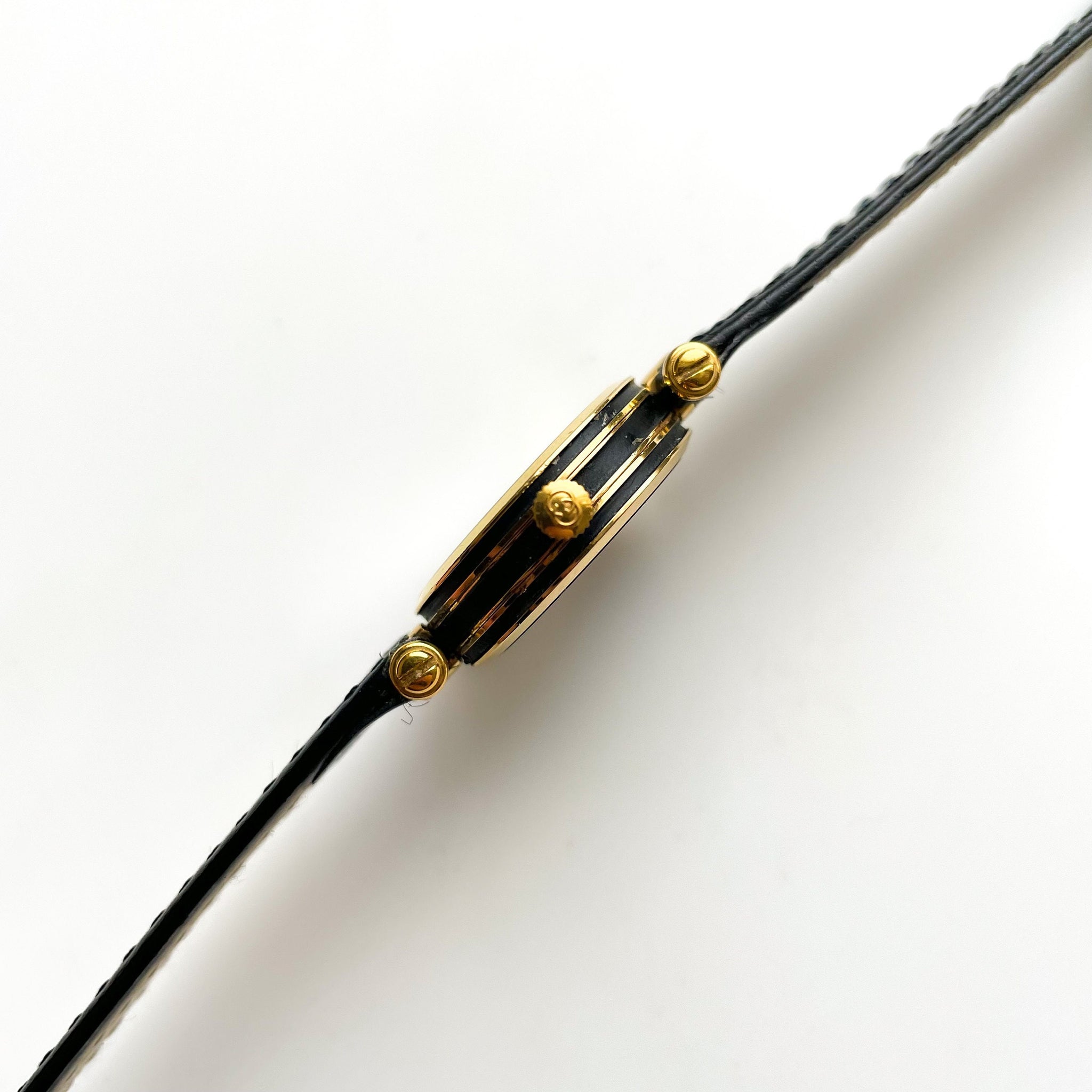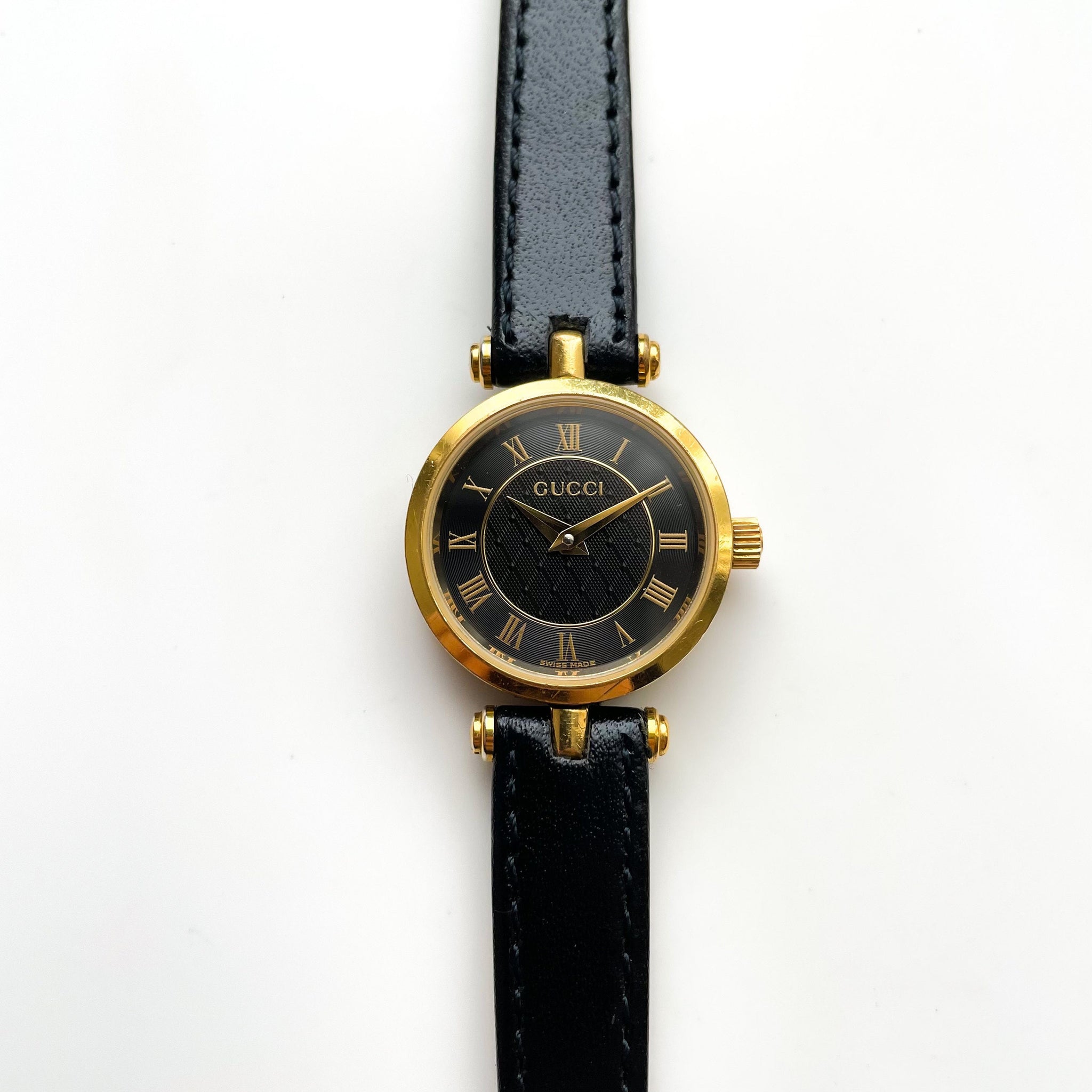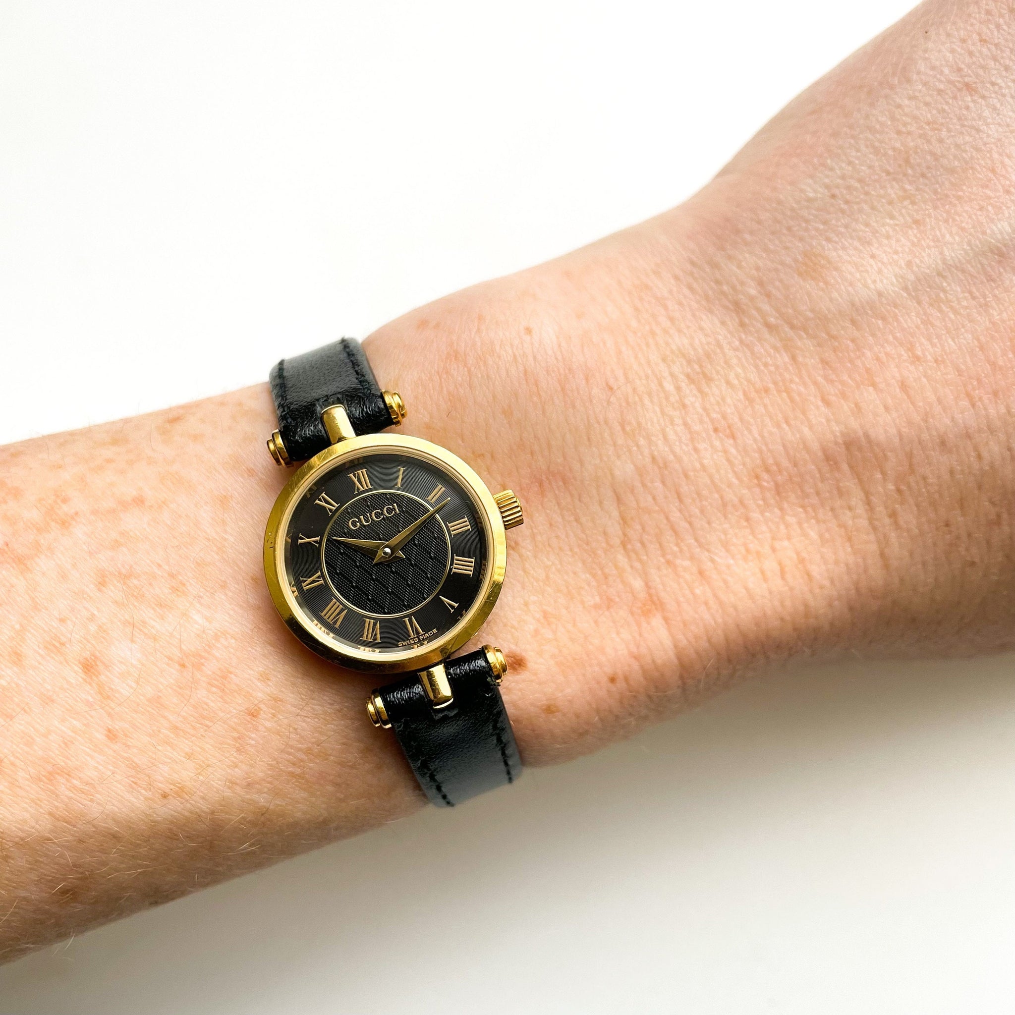 Dainty ladies' Gucci 1990 stack watch, with black textured dial and Roman numerals. Logo engraved on the crown. A very feminine, dainty and stylish piece from the cult Italian designer.