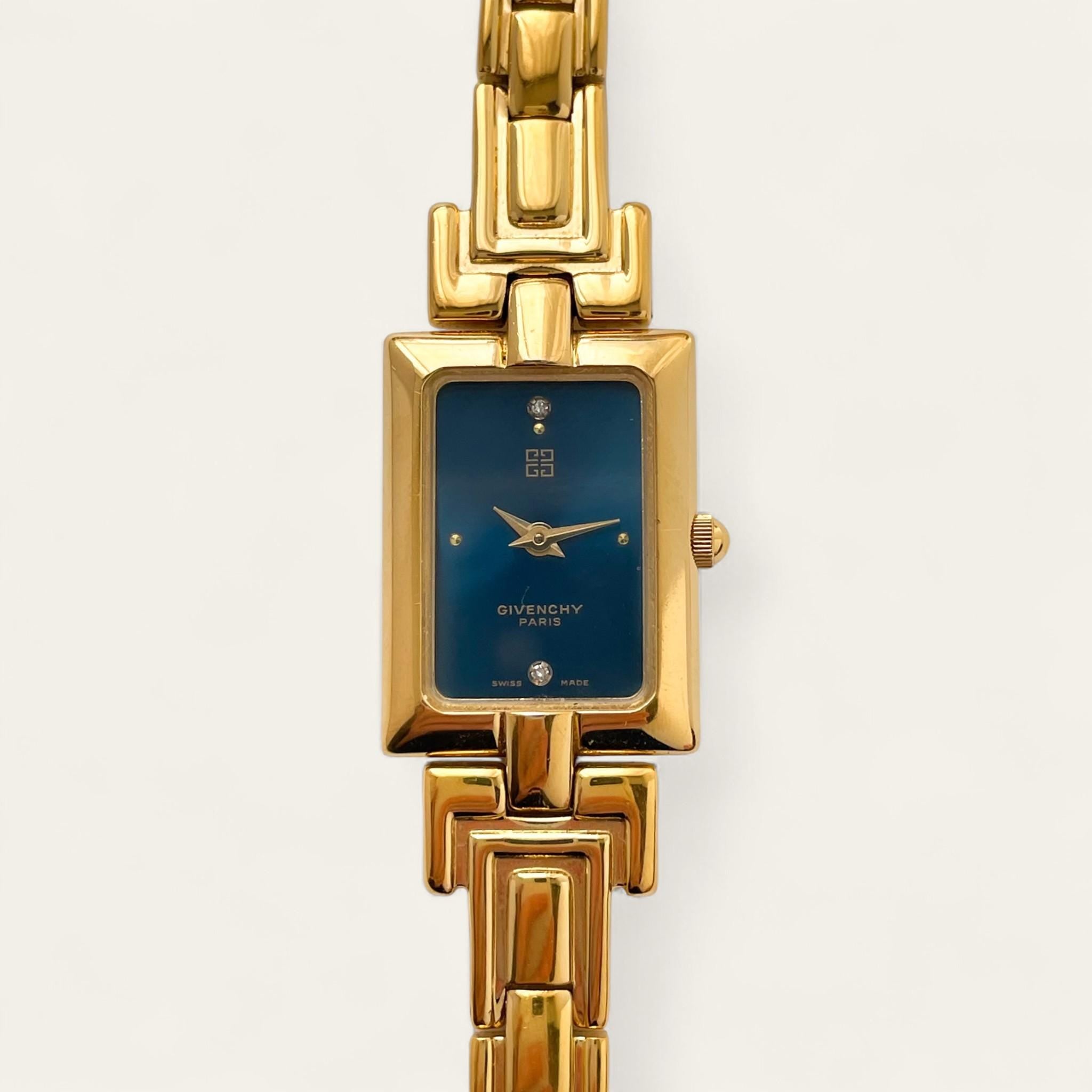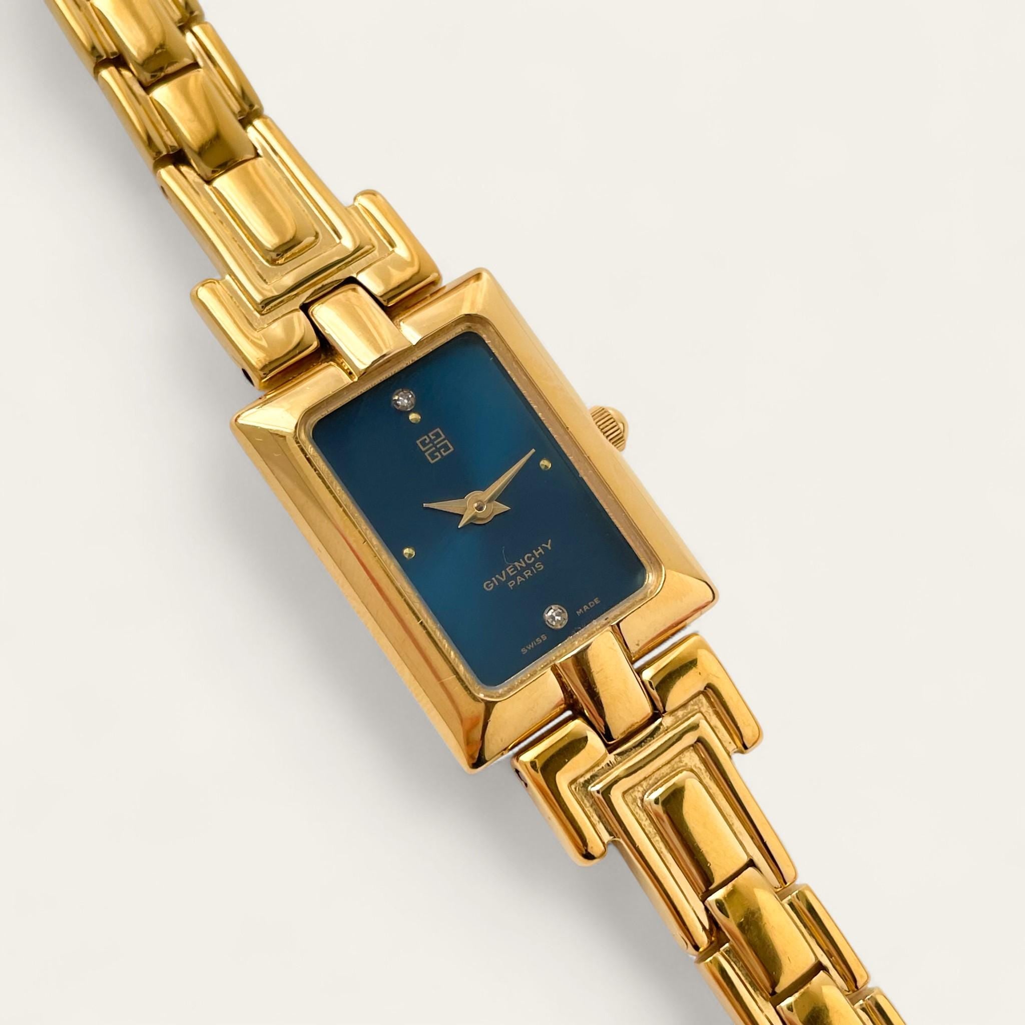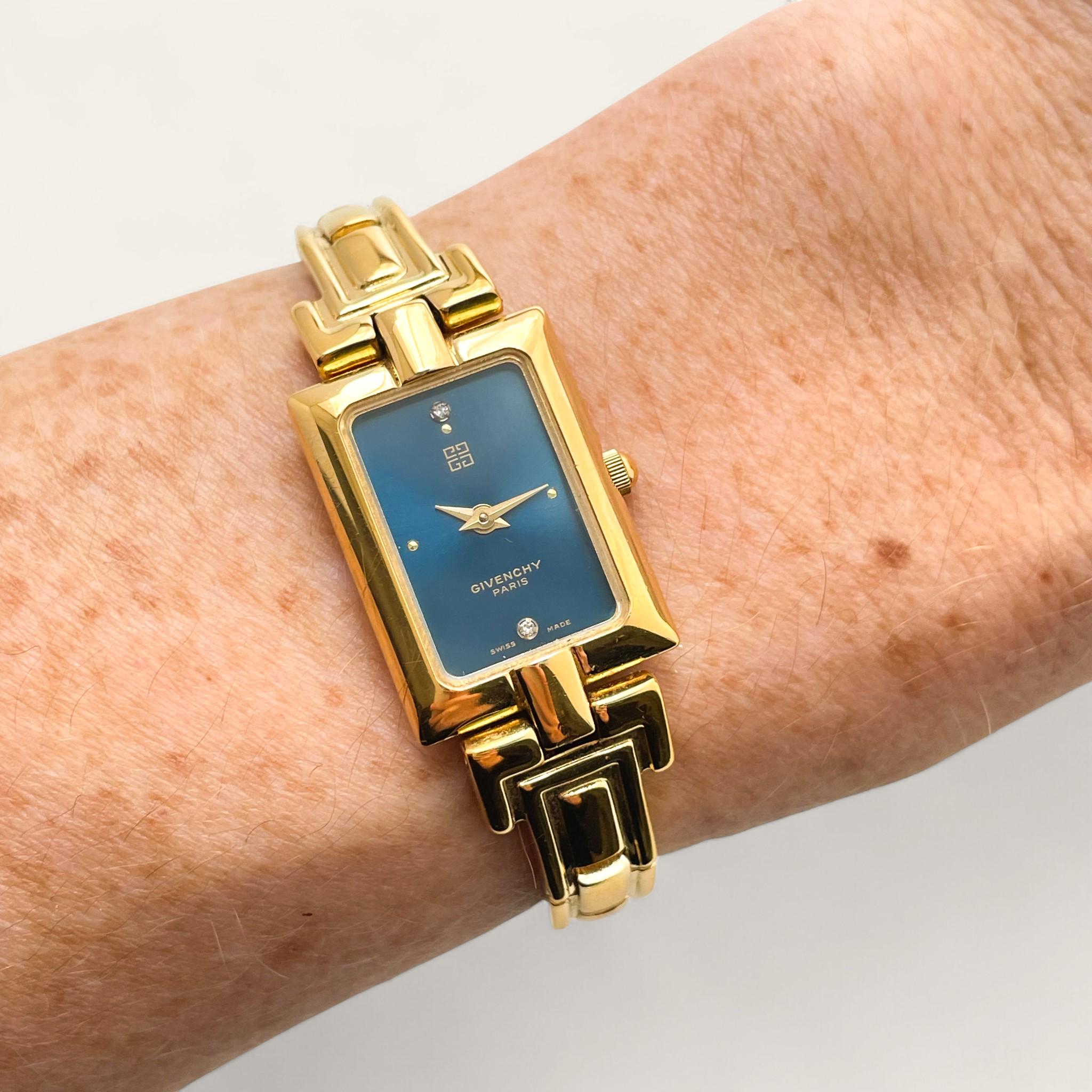 Vintage ladies' Givenchy gold-plated watch with metallic blue dial and jewellery clasp. Ornate and unique bracelet design. A gorgeous watch from the French designer.