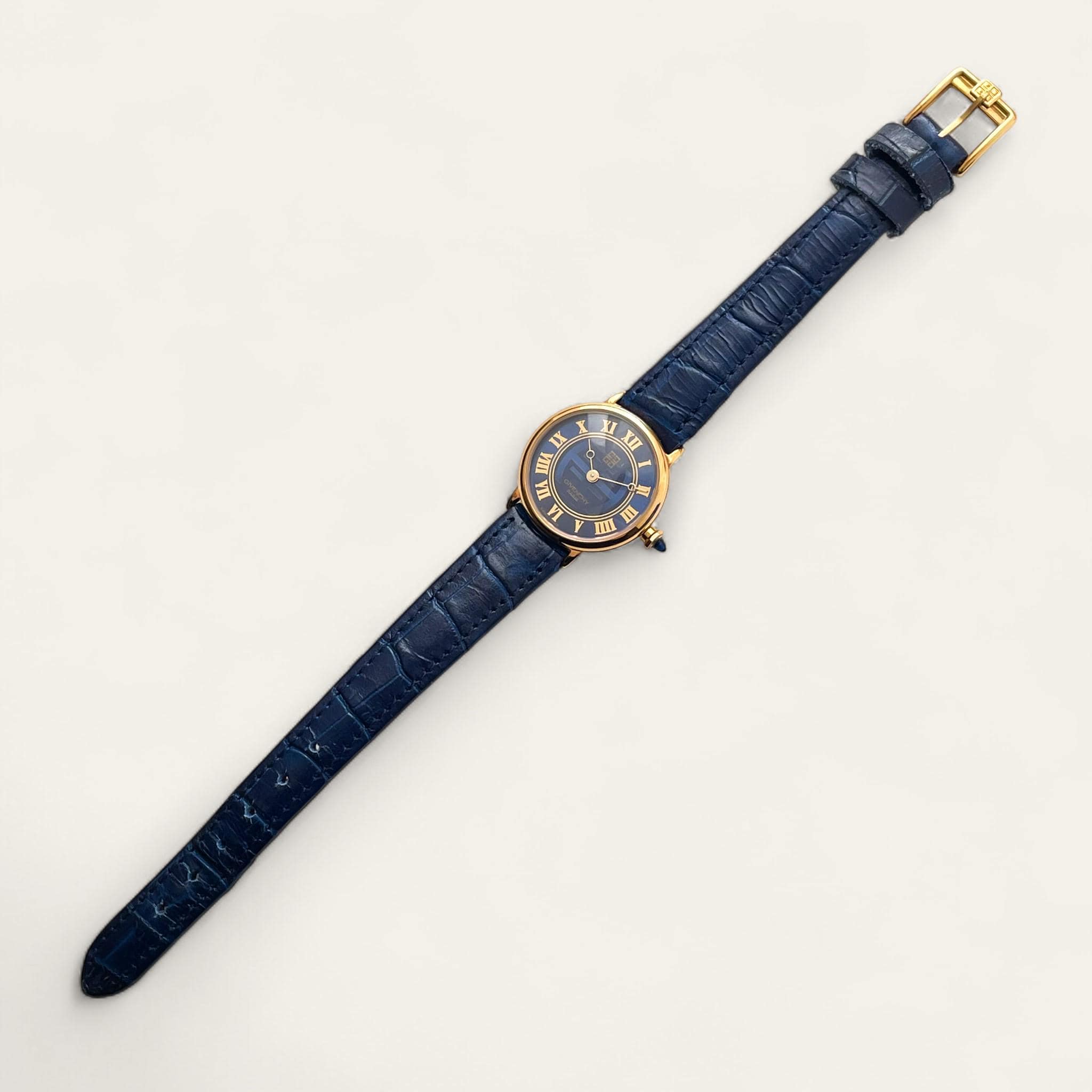 Vintage ladies' Givenchy Shanghai gold-plated watch with metallic blue dial, pointy cabochon crown and leather strap. A gorgeous watch from the French designer.