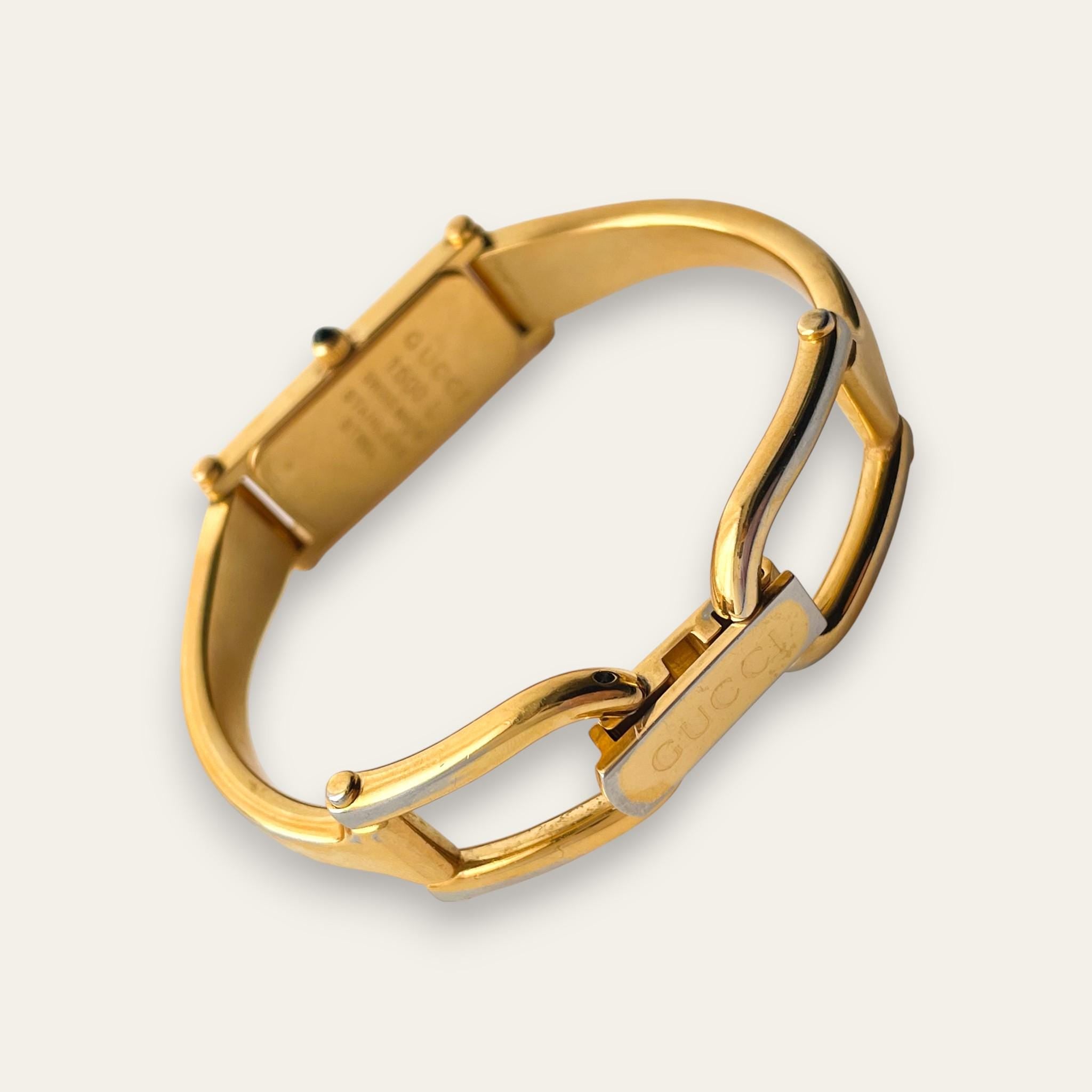 Thin ladies' 1990s 1500L Gucci gold-tone watch, with rectangular dial, articulated bangle bracelet and iconic horsebit clasp. A very feminine, dainty and stylish piece from the Italian designer.
