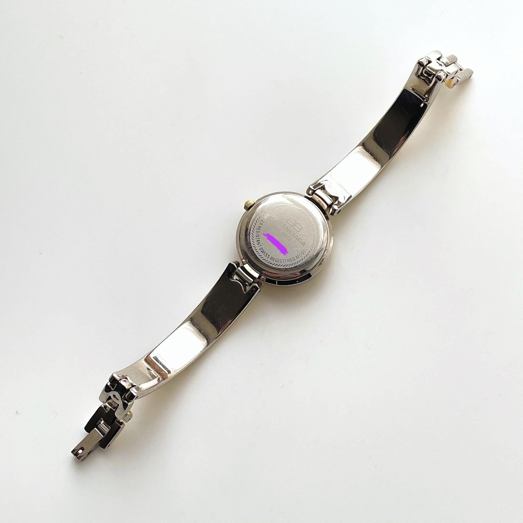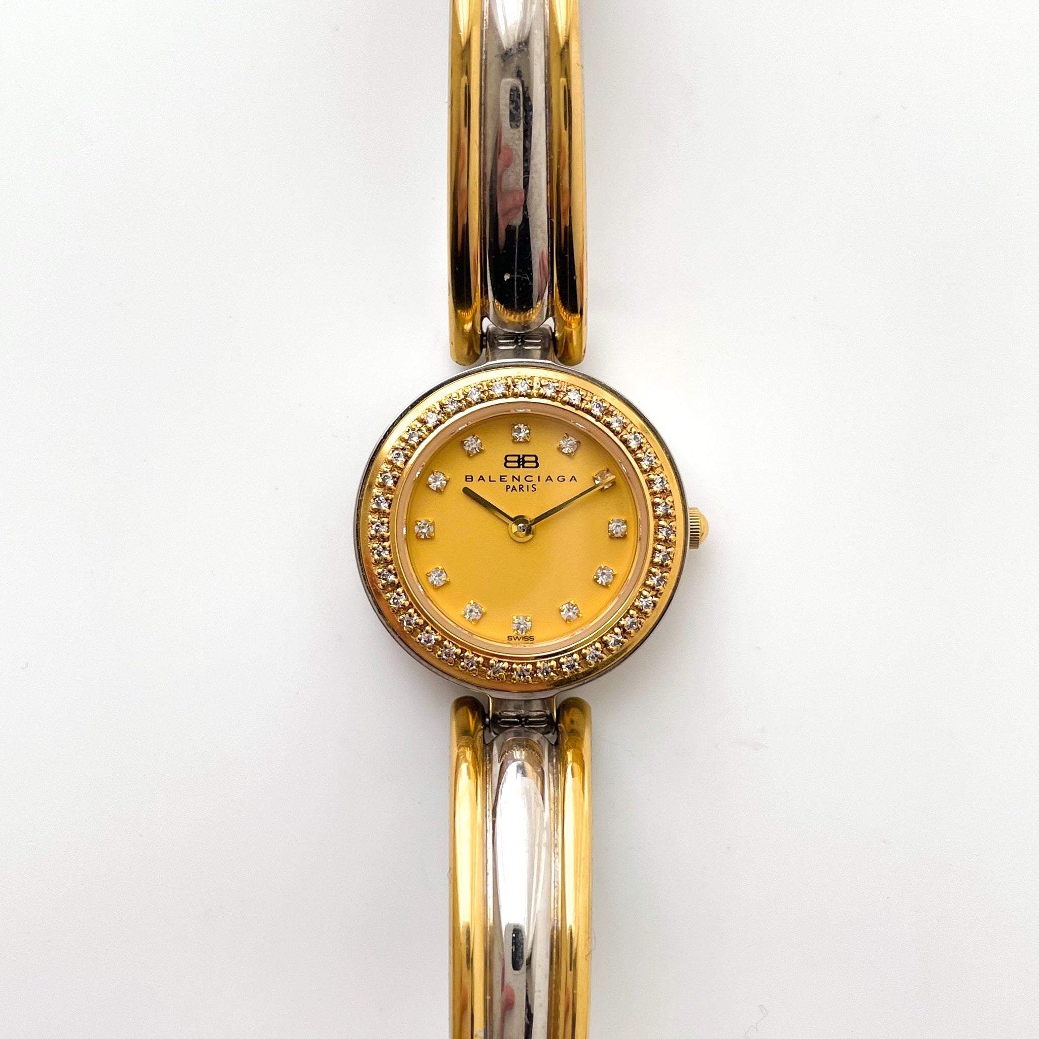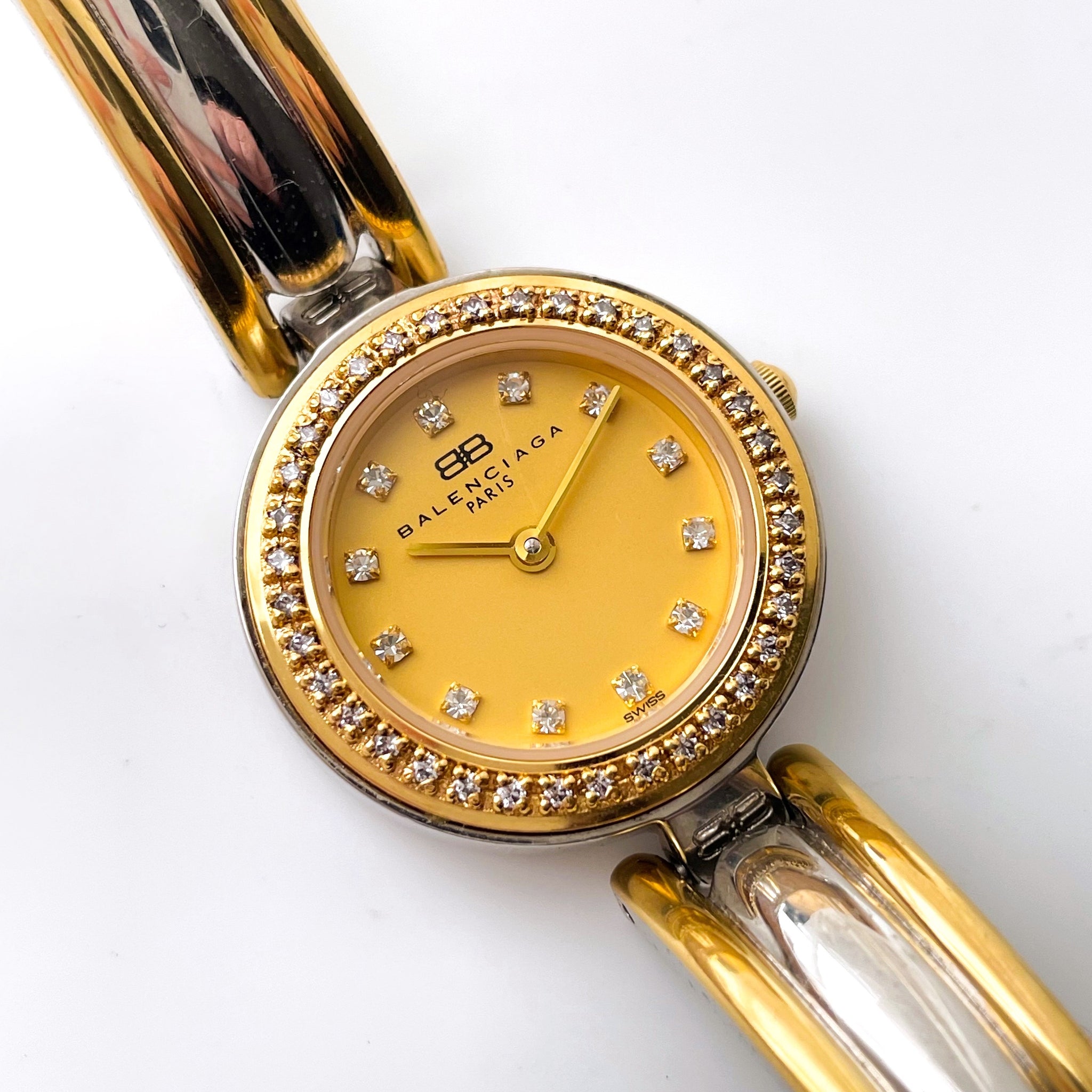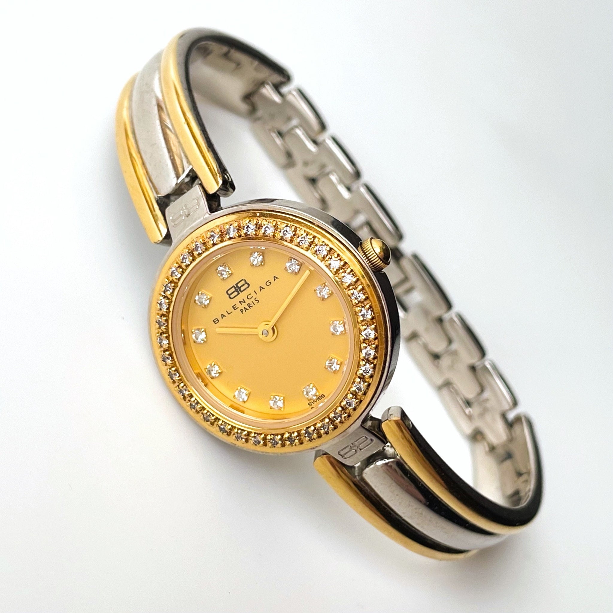 Vintage ladies' Balenciaga two-tone bangle watch with diamond-set dial and bezel. Ornate and unique bracelet design. A gorgeous watch from the French designer.