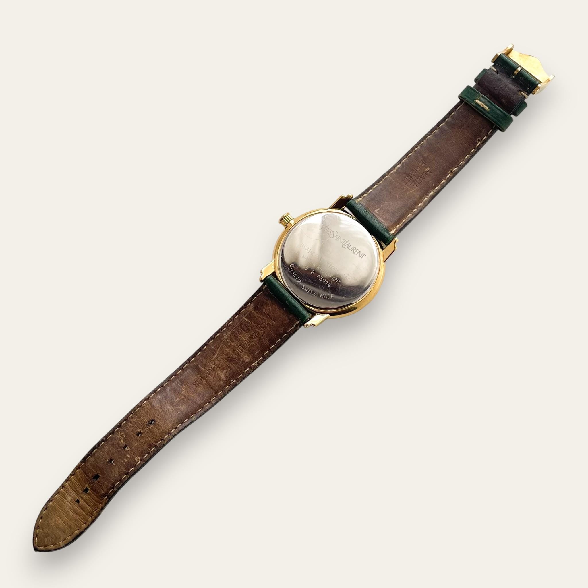 Gents'/Unisex Yves Saint Laurent 1990s watch with gold-plated case, green leather strap, and white dial. An elegant piece from the French designer.