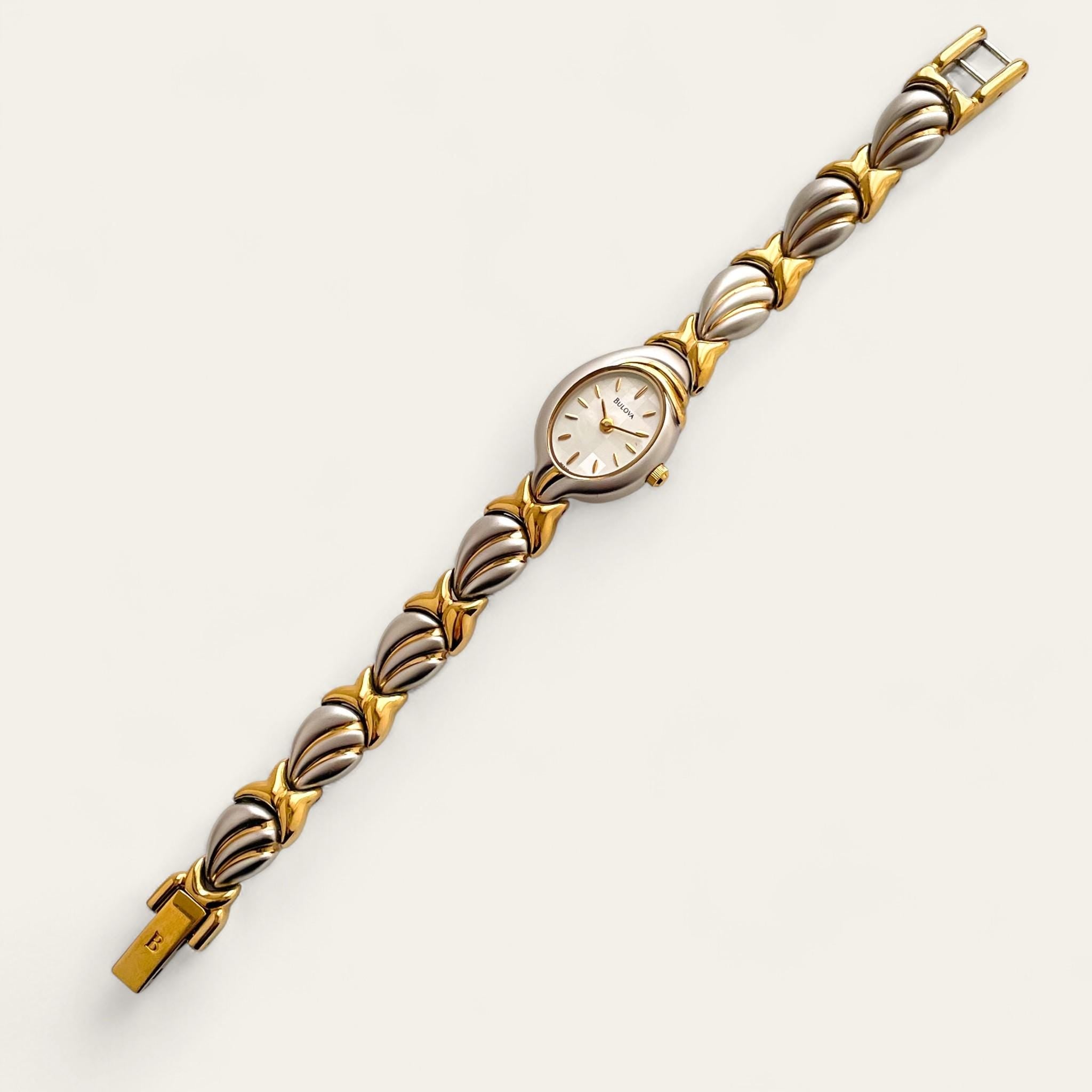 Vintage ladies' 90s Bulova watch, with oval dial and two-tone bracelet. An elegant vintage piece from the cult watchmaker.