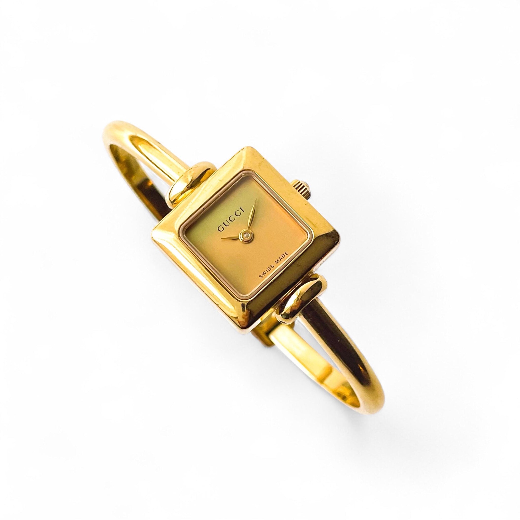 Vintage ladies' Gucci gold-plated watch, with articulated bangle bracelet and gold square dial. A very feminine, dainty and stylish piece from the Italian designer.