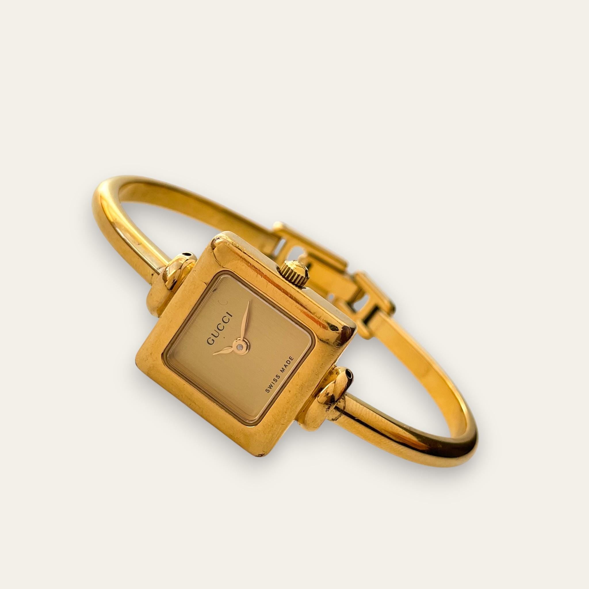 Vintage ladies' Gucci gold-plated watch, with articulated bangle bracelet and gold square dial. A very feminine, dainty and stylish piece from the Italian designer.