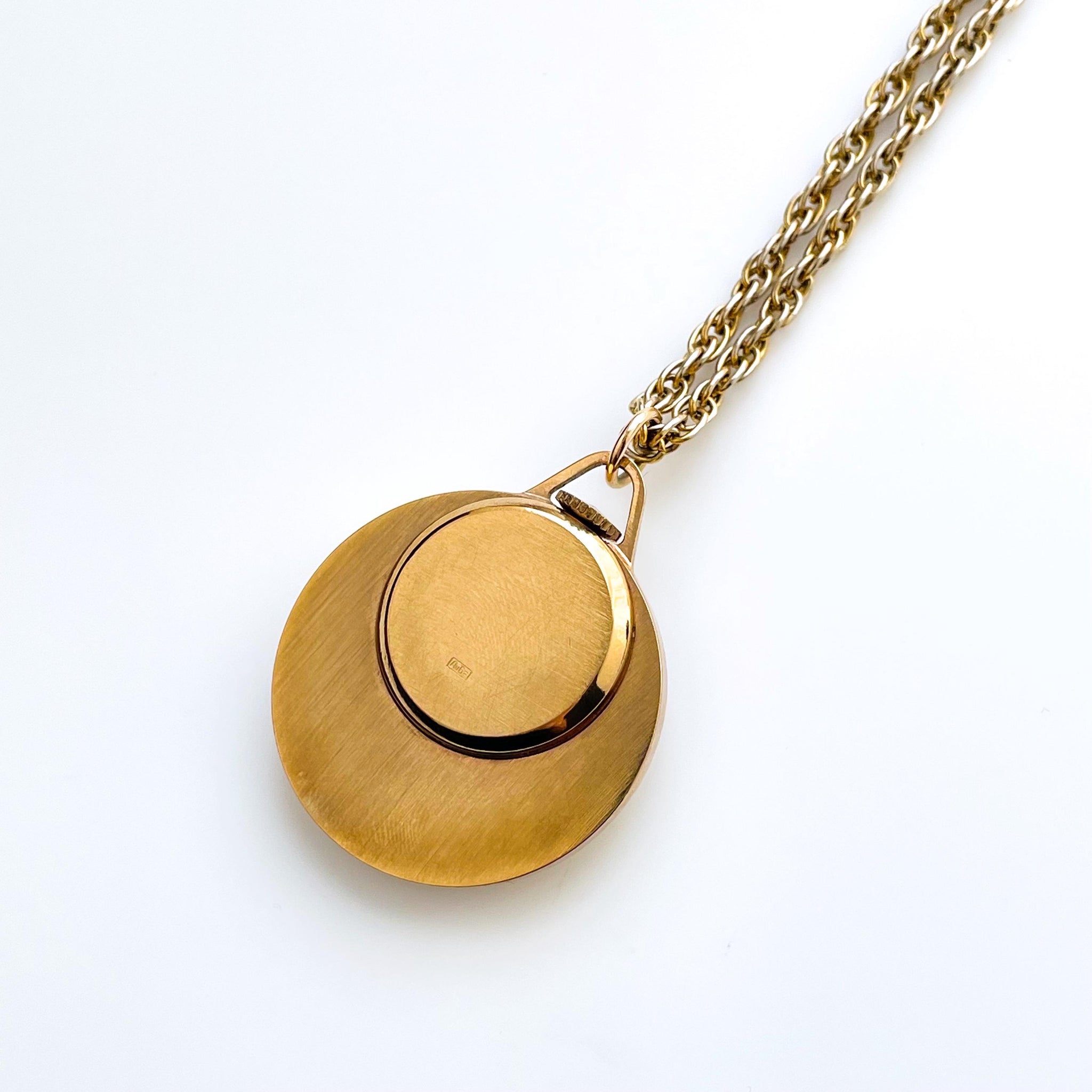 Vintage 60s Sekonda gold-plated pendant watch, with beautiful, intricate case, round dial and metallic blue hour and minute hands