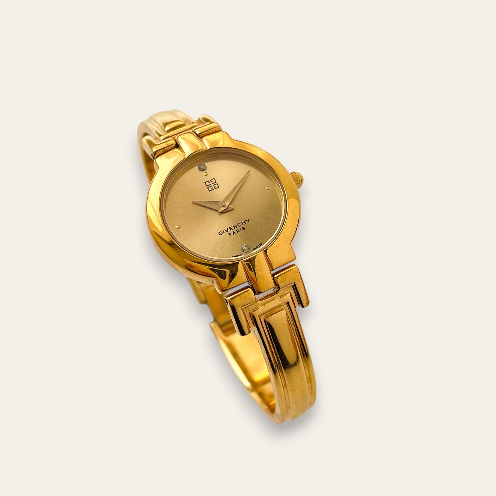 A striking piece from the French house, this Givenchy Millesime watch is designed as an ornate bangle. The gold-plated bracelet features intricate metalwork and a jewellery clasp, allowing it to sit as a statement cuff on the wrist. A refined choice that balances 1990s luxury with a classic aesthetic.