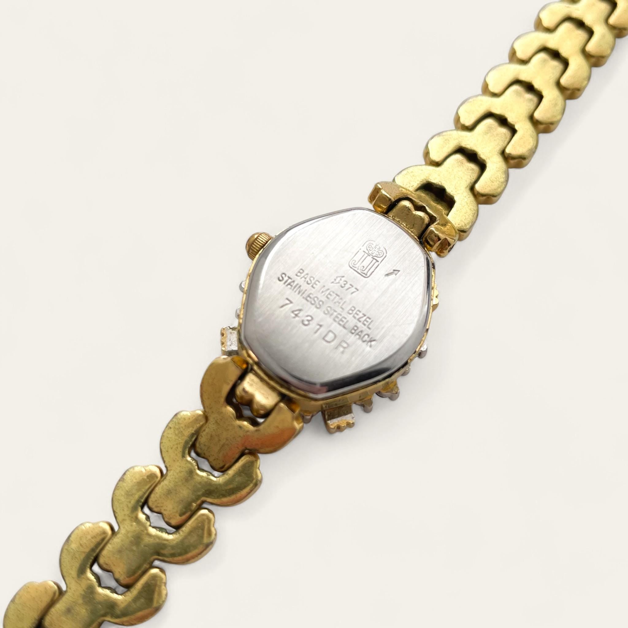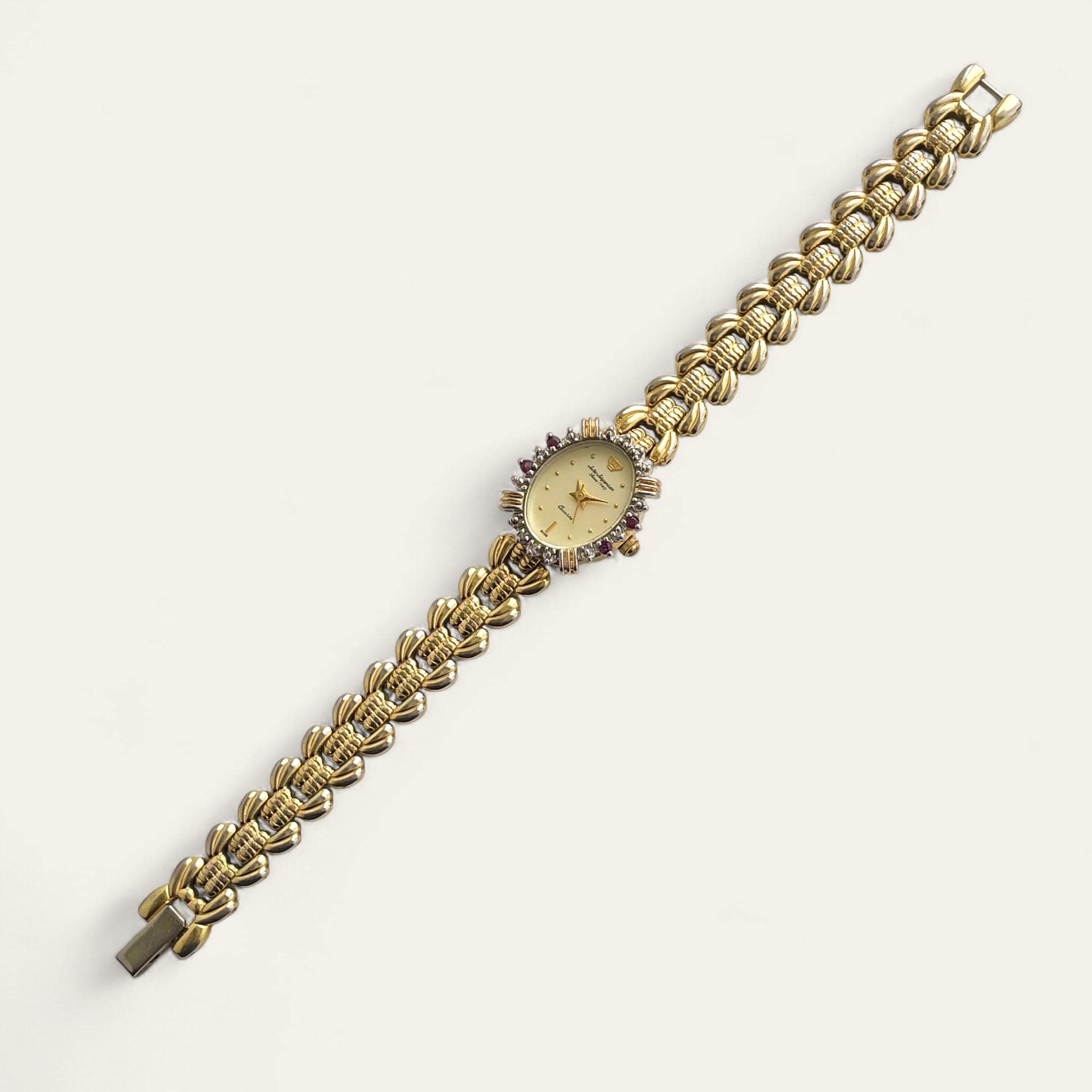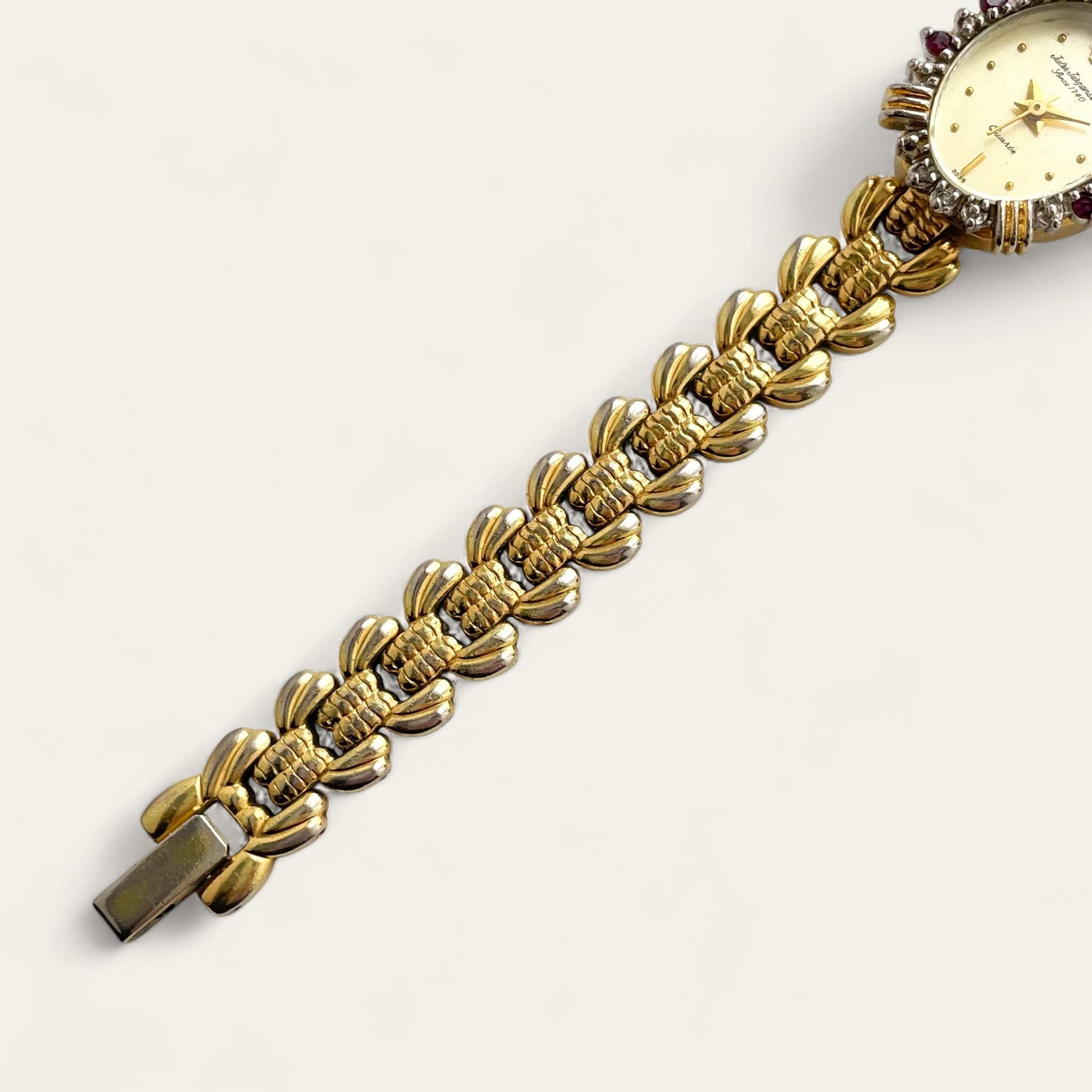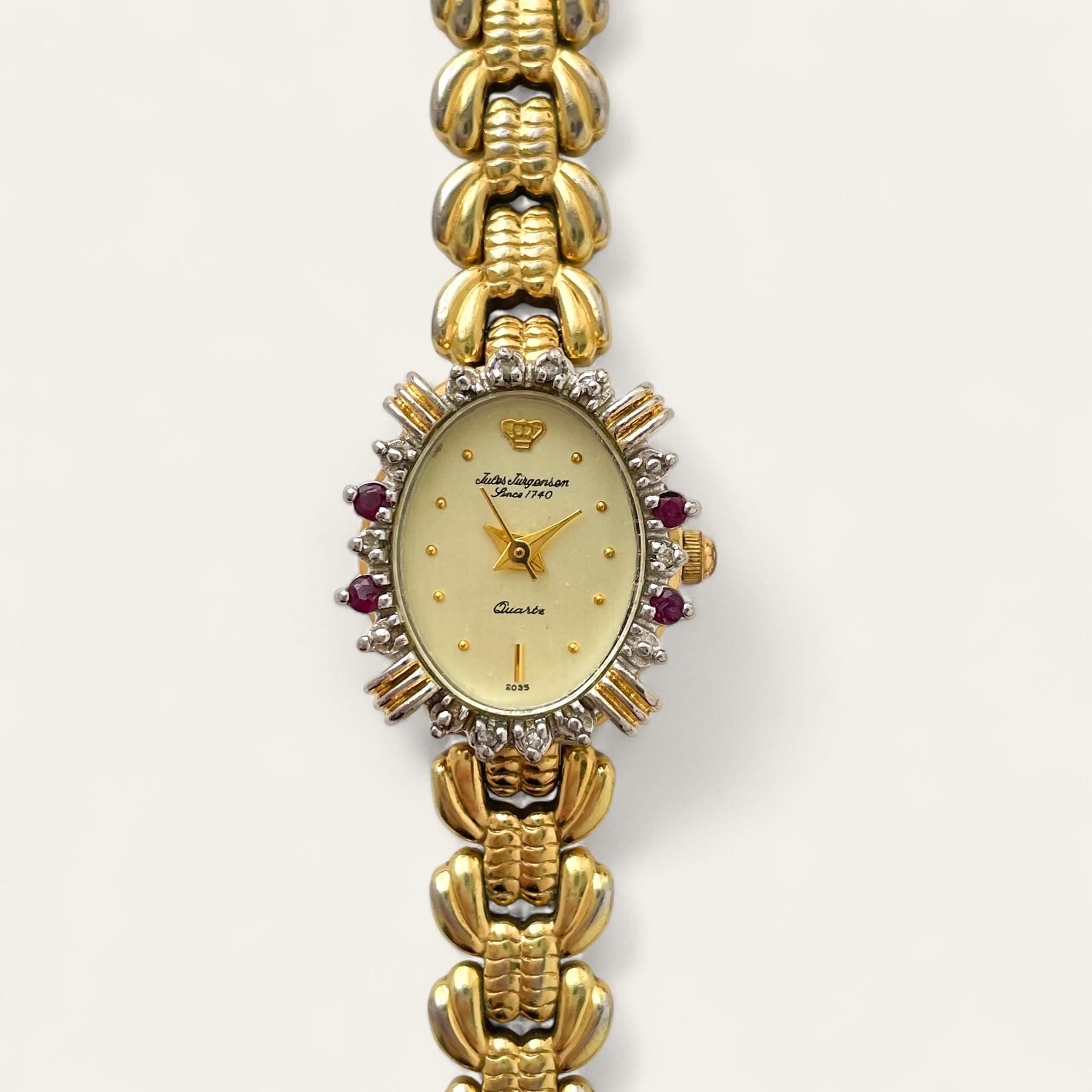 Rare vintage ladies’ gold-plated Jules Jürgensen jewellery watch, with oval dial, intricate bracelet, and diamonds and rubies around the bezel. A truly incredible piece from the cult Japanese watchmaker.