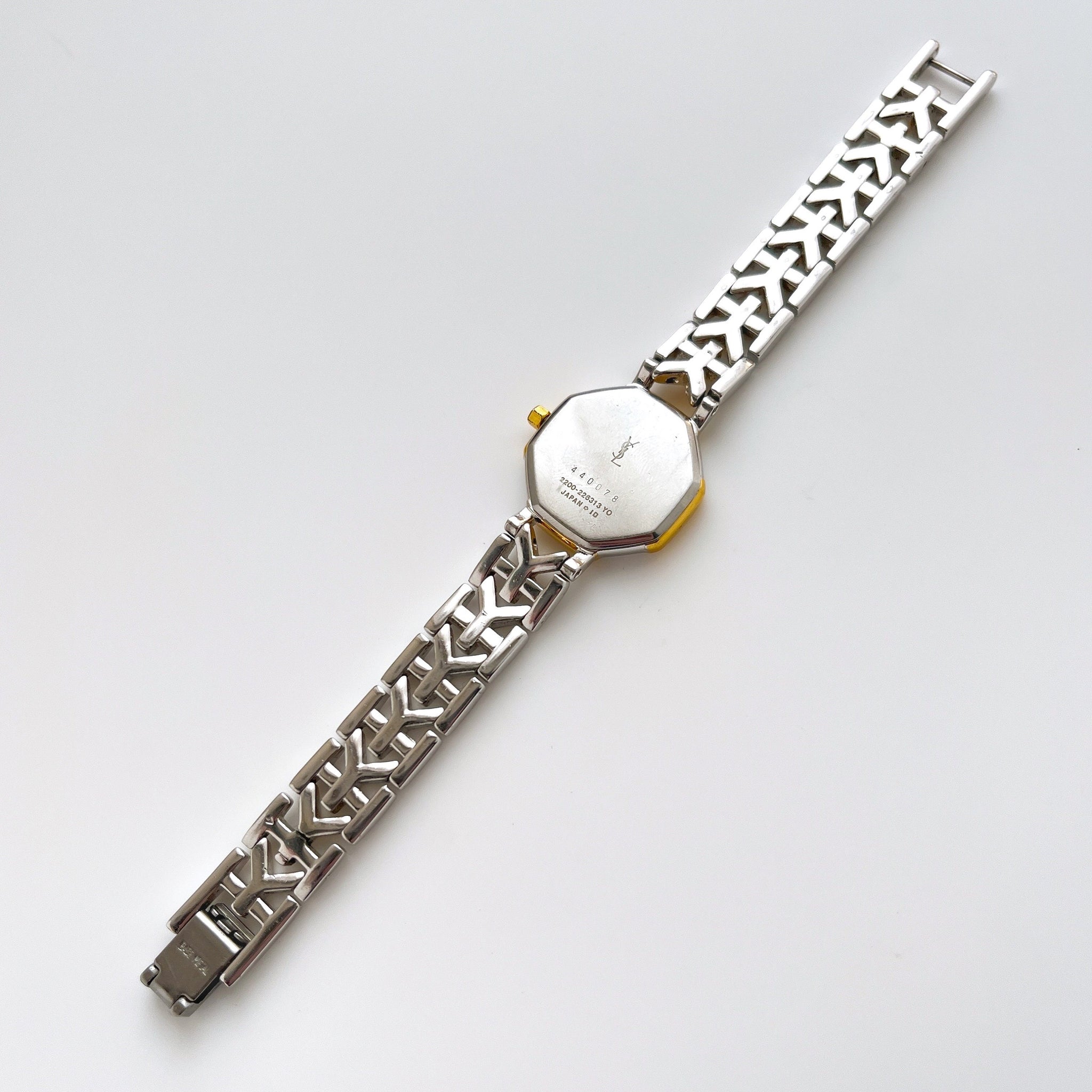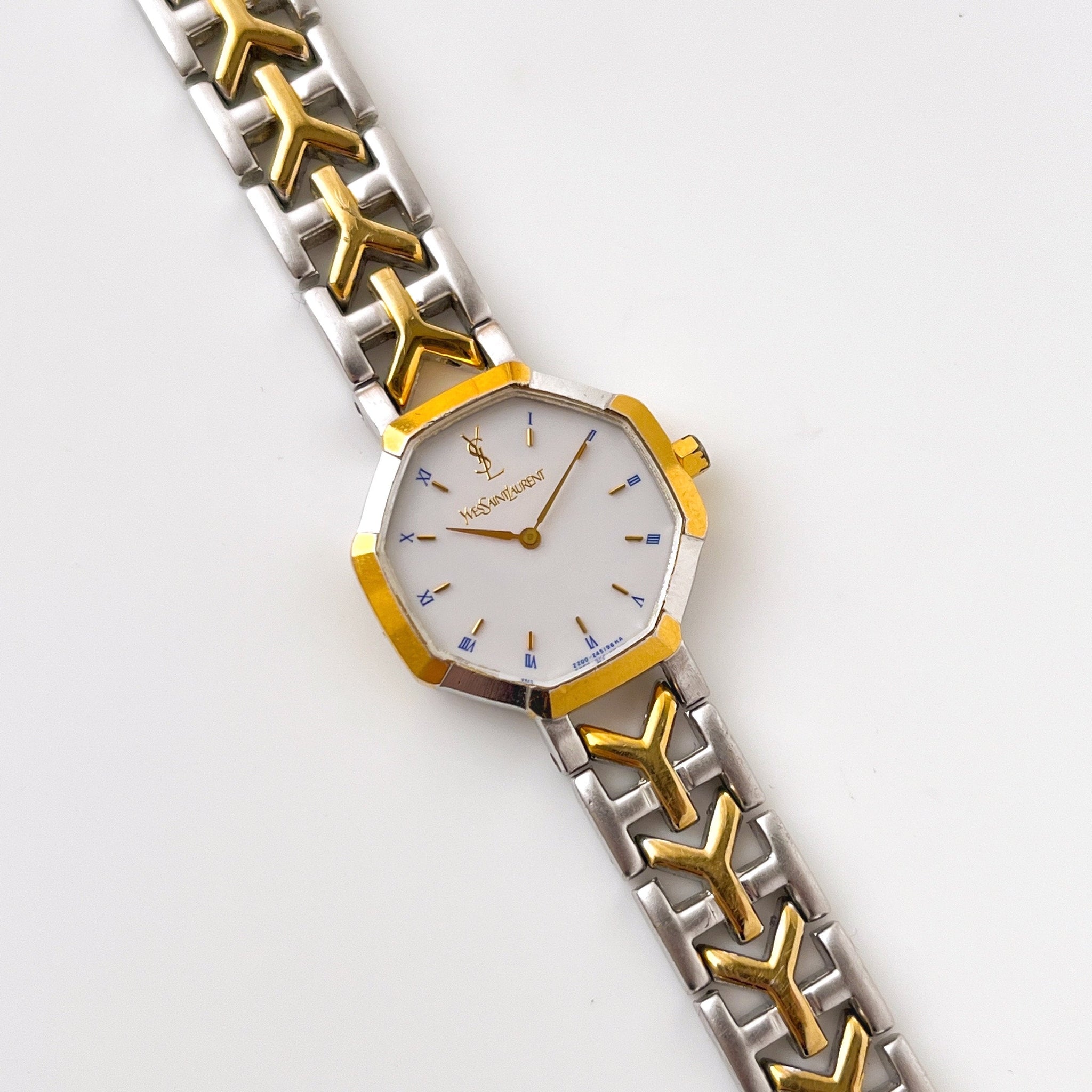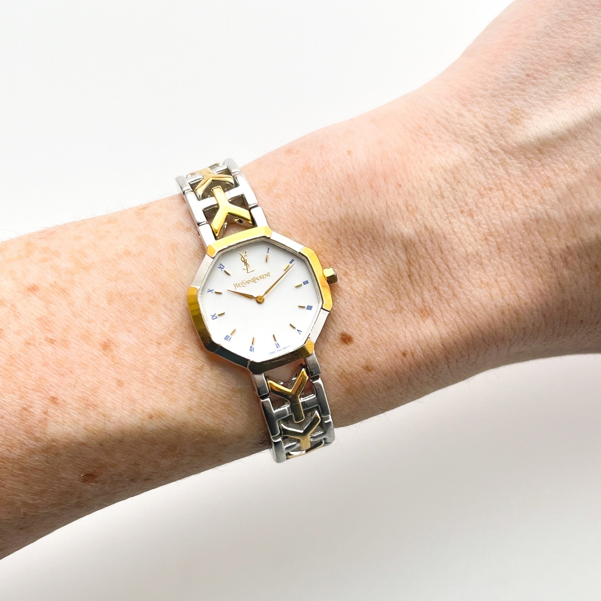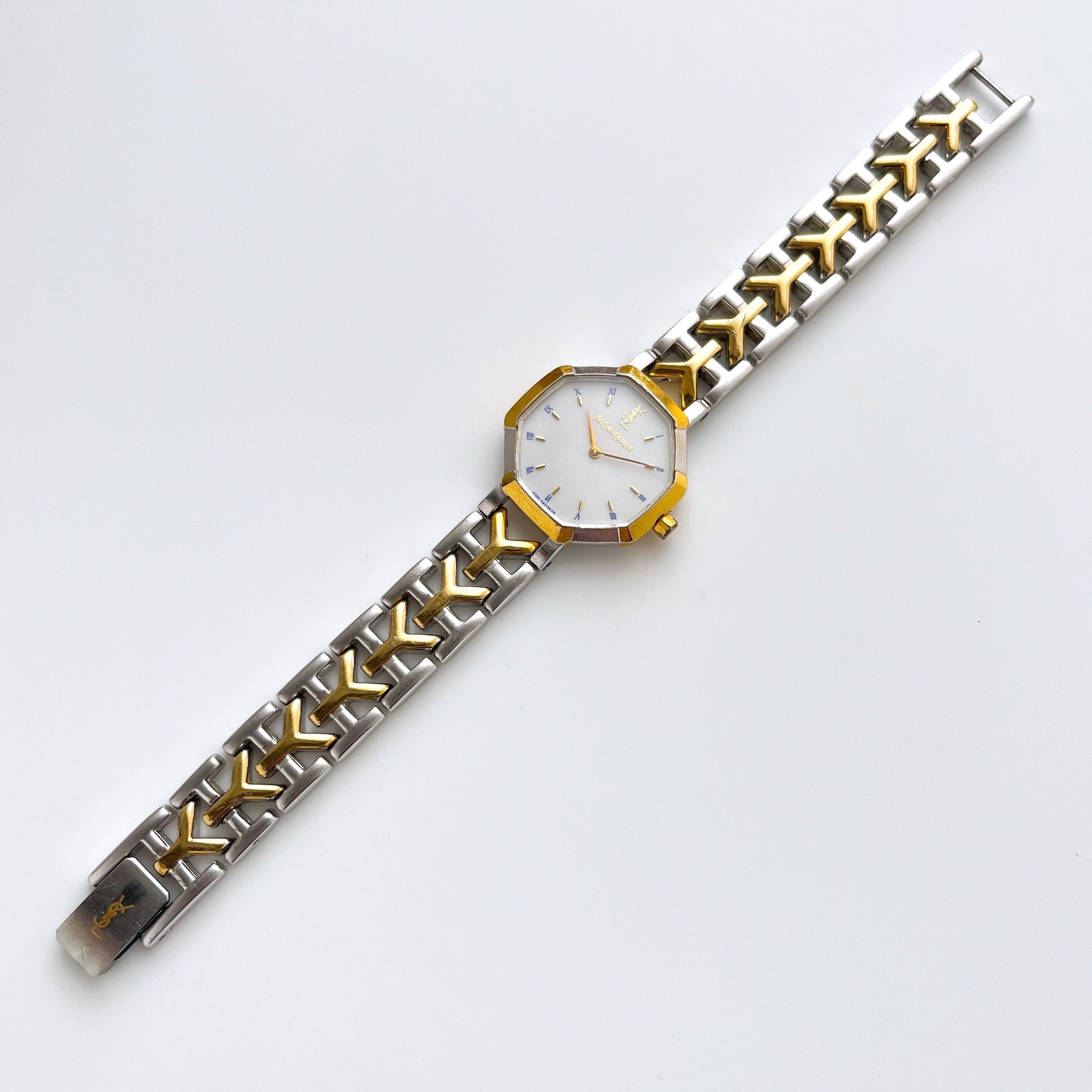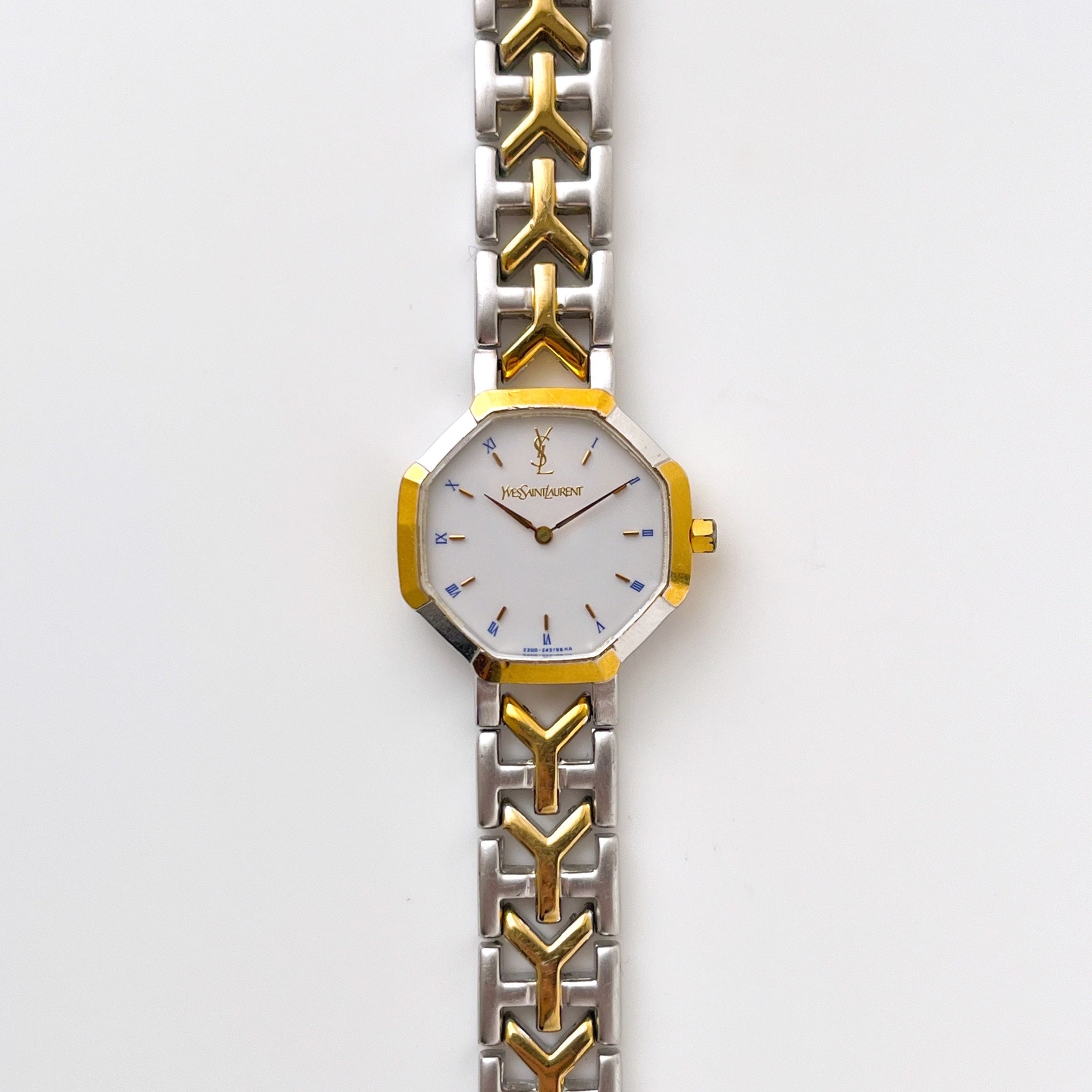 Ladies' Yves Saint Laurent 90s watch with two-tone bracelet, white octagon dial and jewellery clasp. A very elegant piece from the French designer.