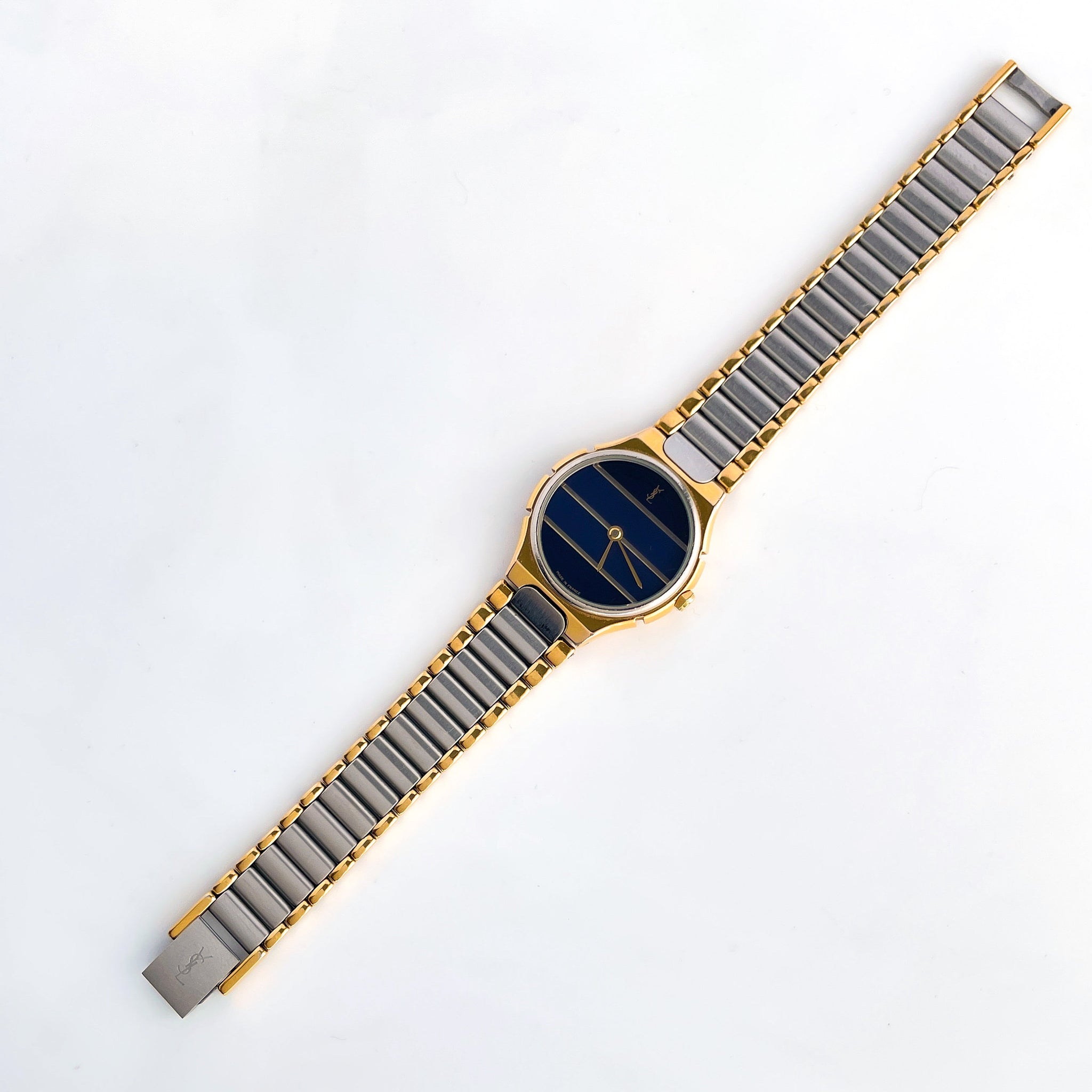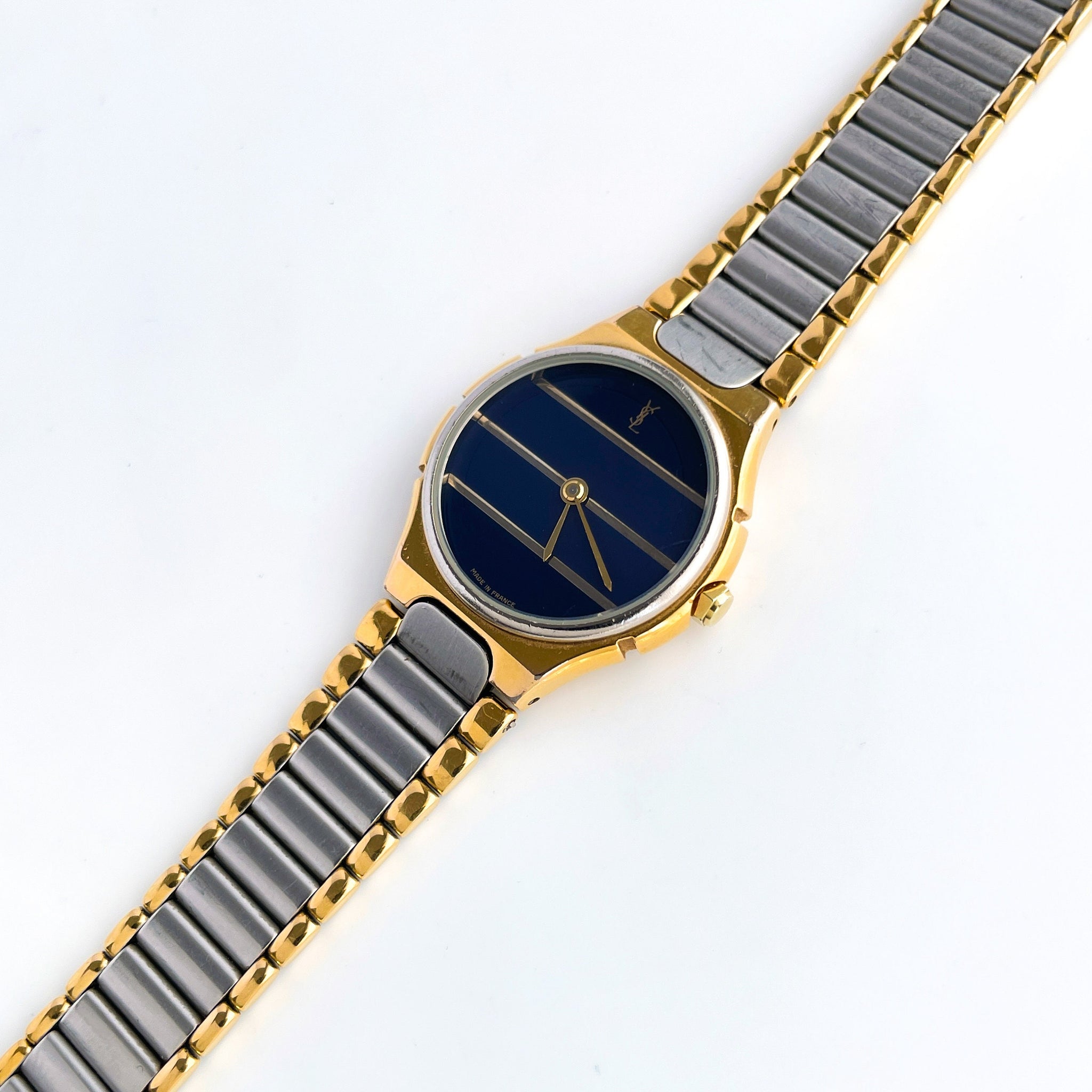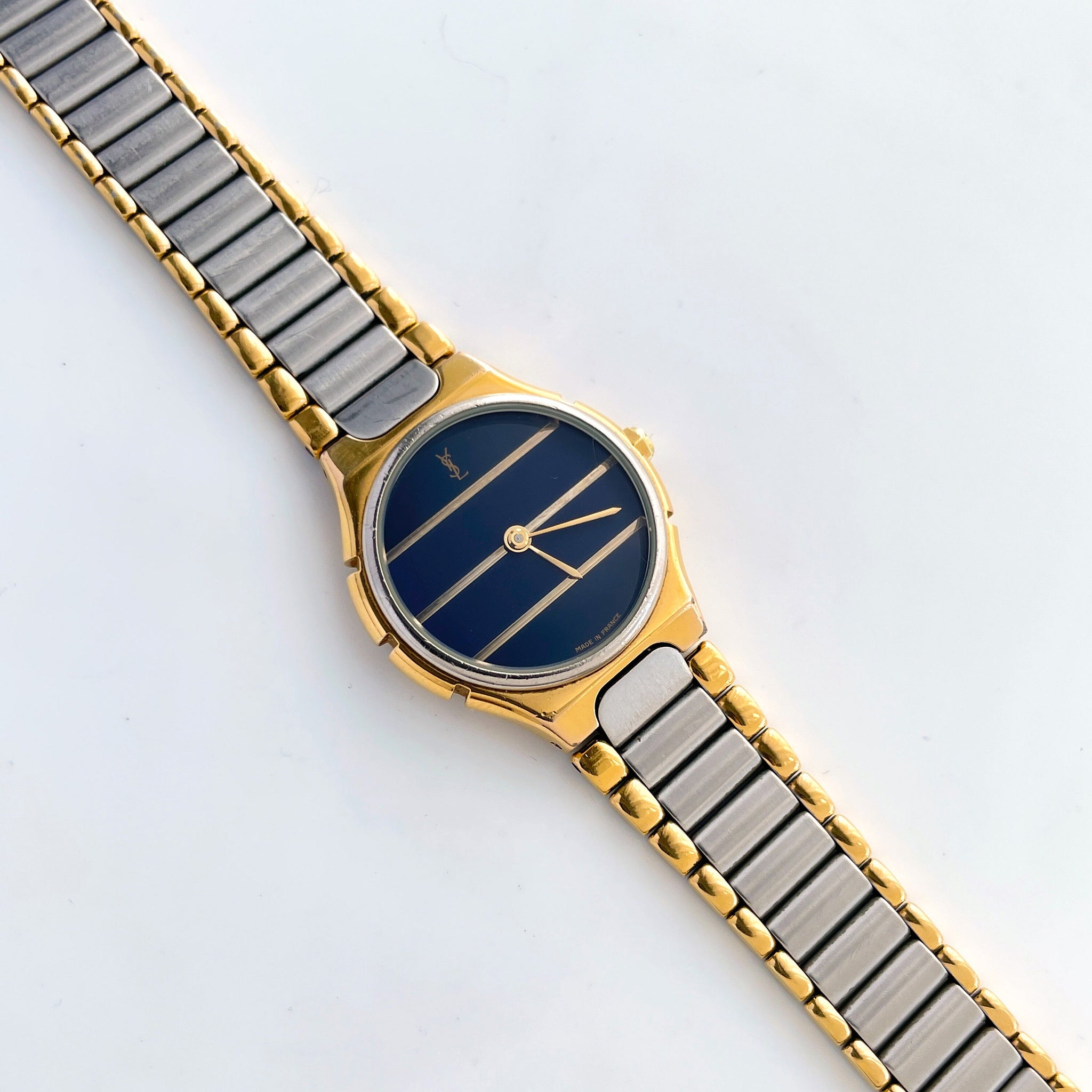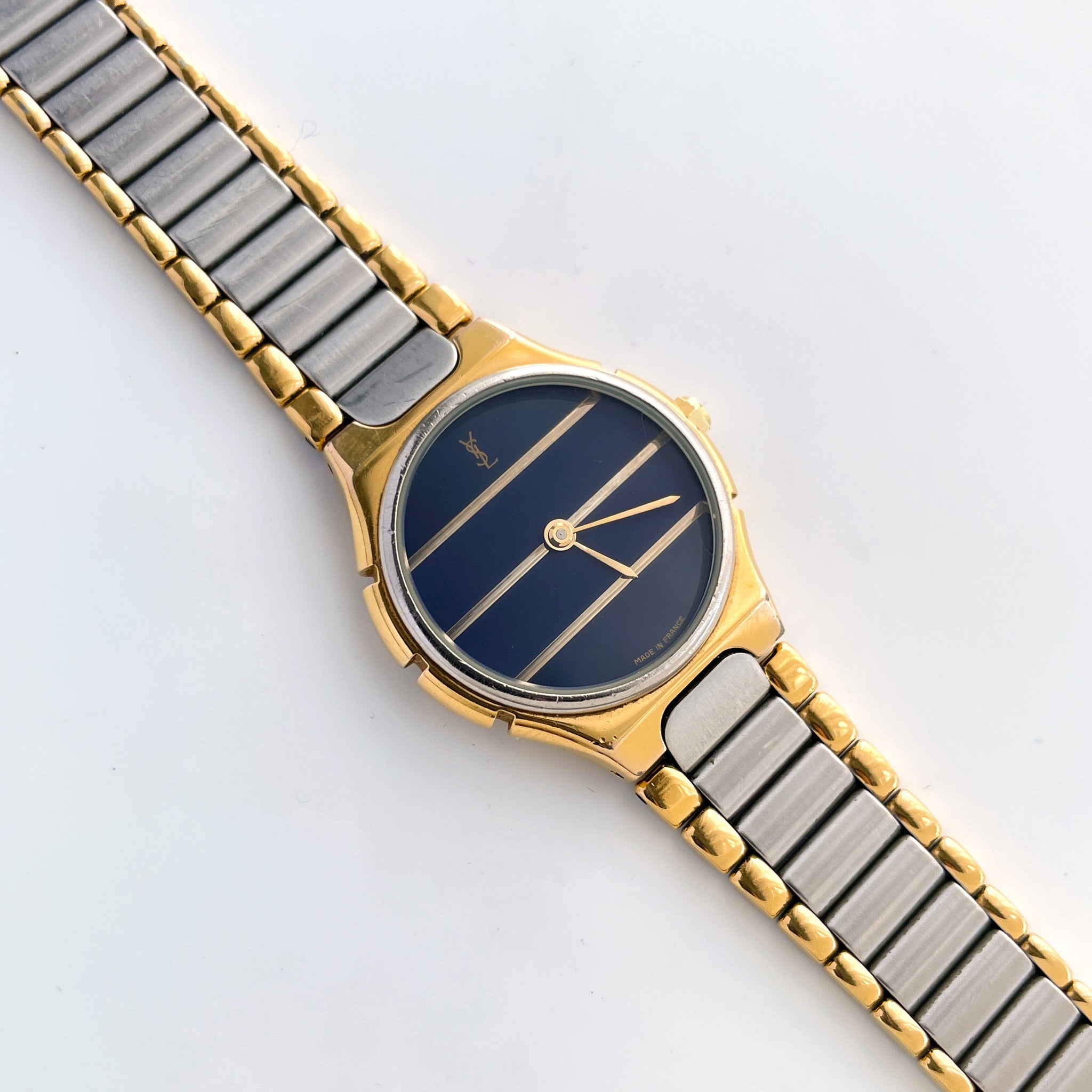 Ladies' Yves Saint Laurent 90s watch with striped dark blue dial and two-tone stainless steel bracelet. A unique and elegant piece from the iconic French designer.